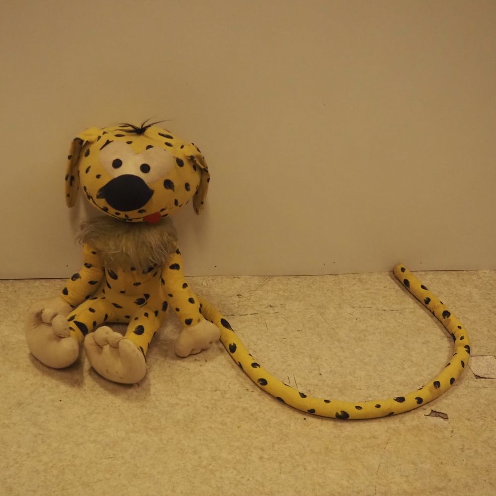Marsupilami : Peluche vers 1980, tissu et rembourré de billes en polystyrène, H: +/- 50 cm (souillée)