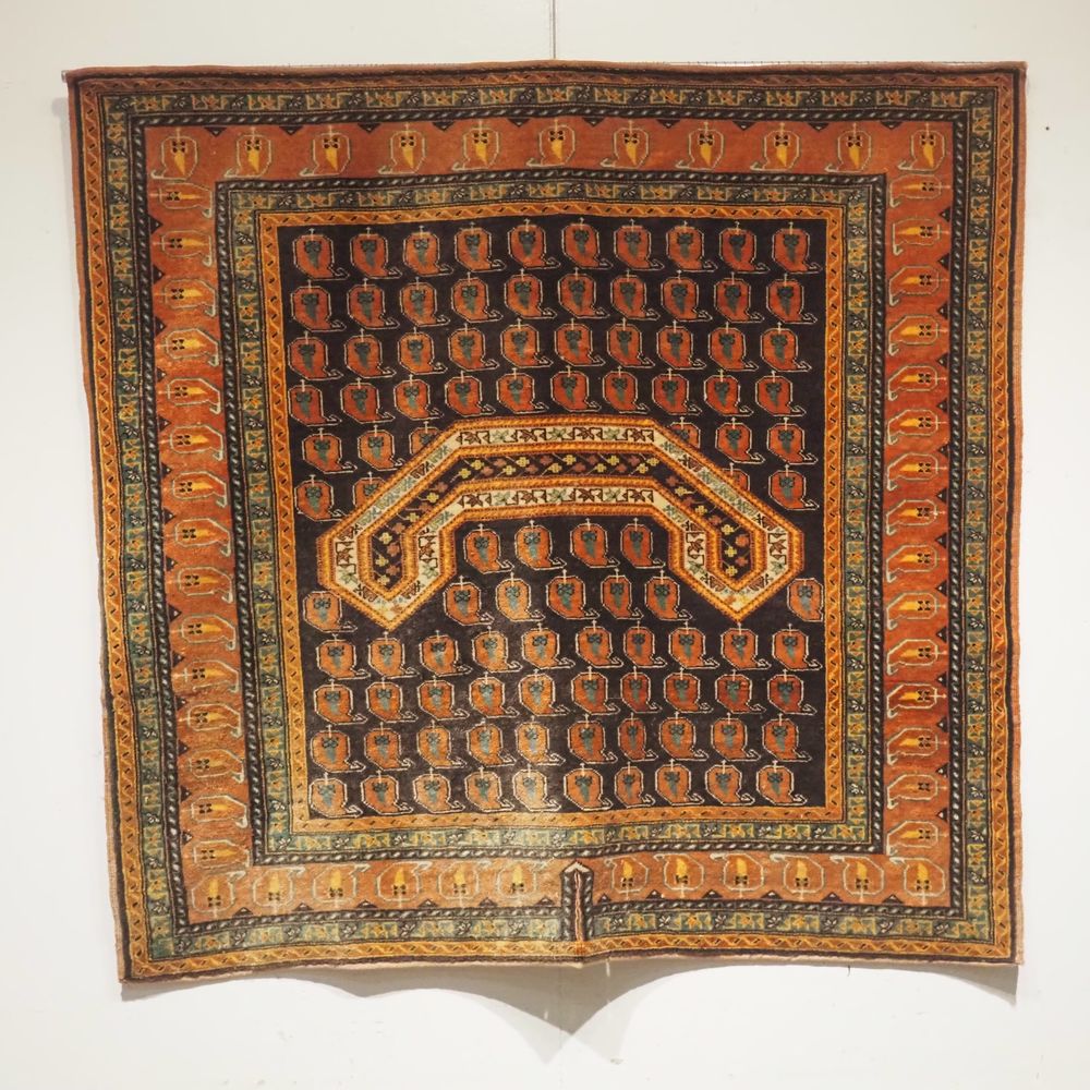 Samarkand : Tapis vers 1960, laine et soie aux points fin noués main, motif de bothed sur champs bleu indigo encadrement d’une moyenne bordure entre 6 galons, parfait état d’origine, légèrement ensoleillé, (toujours exposé au mur), dim: 112 x 117 cm