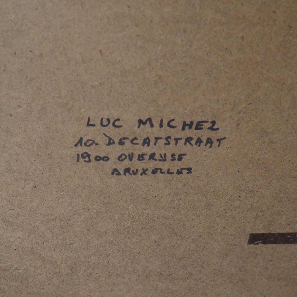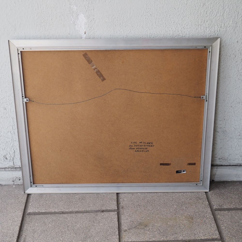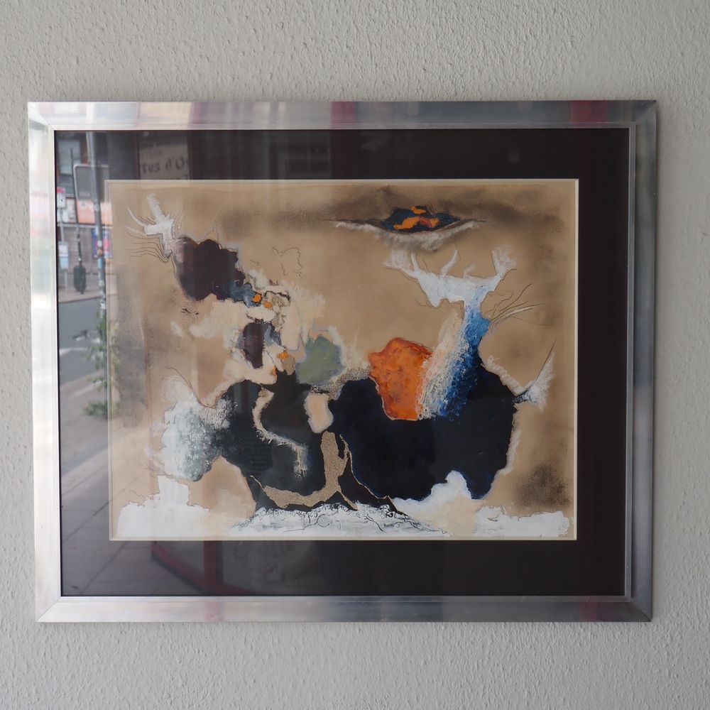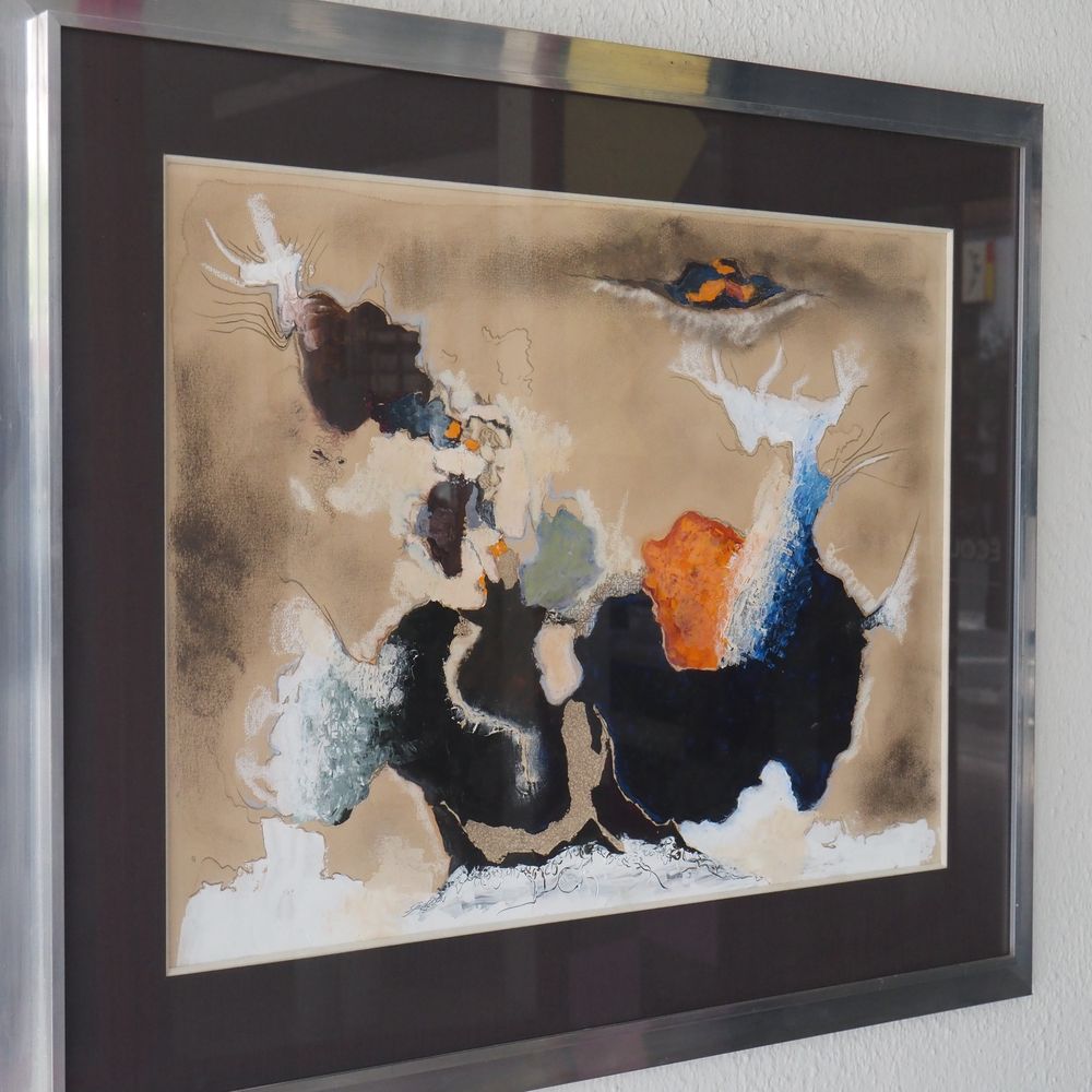 Luc Michez (1928) : Technique mixte, composition abstraite vers 1970, huile et gouache sur papier, signée au dos, encadré sous verre, dim: 49 x 64 cm