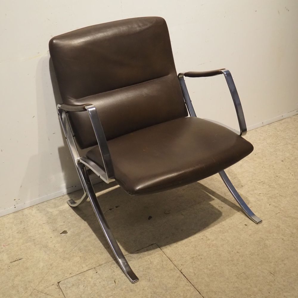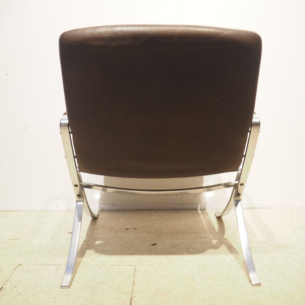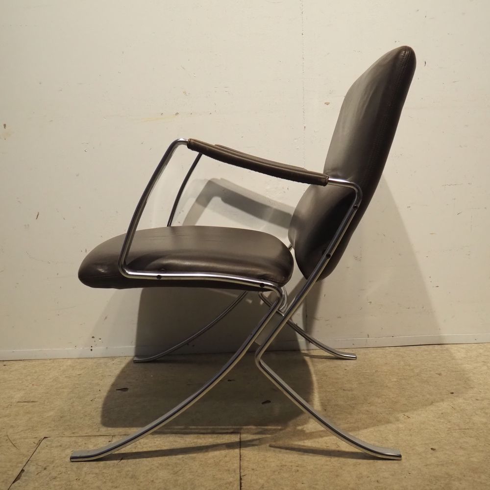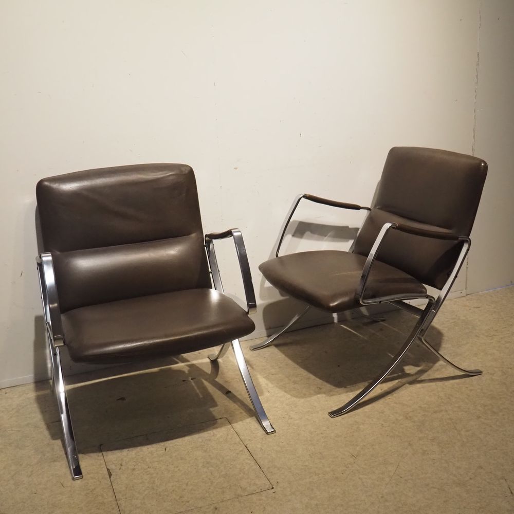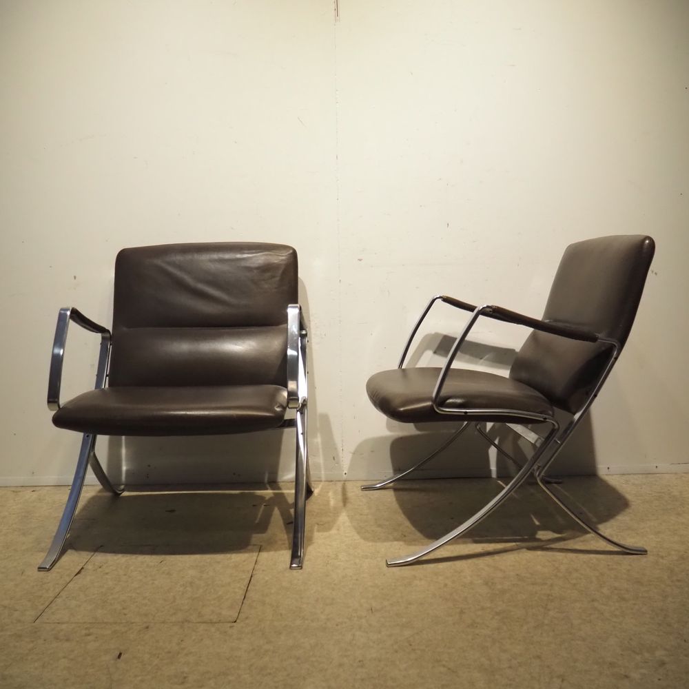 Preben Fabricius / Kil International : Paire de fauteuils visiteurs, structure apparente en acier cintré et brossé, assise et dossier en contre plaque moulé, garnis de mousse et recouvert de cuir marron