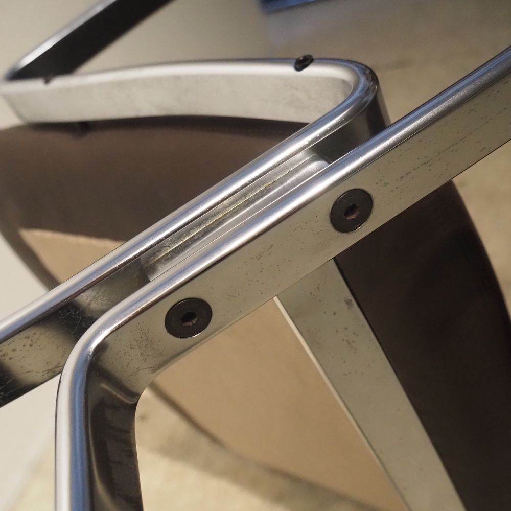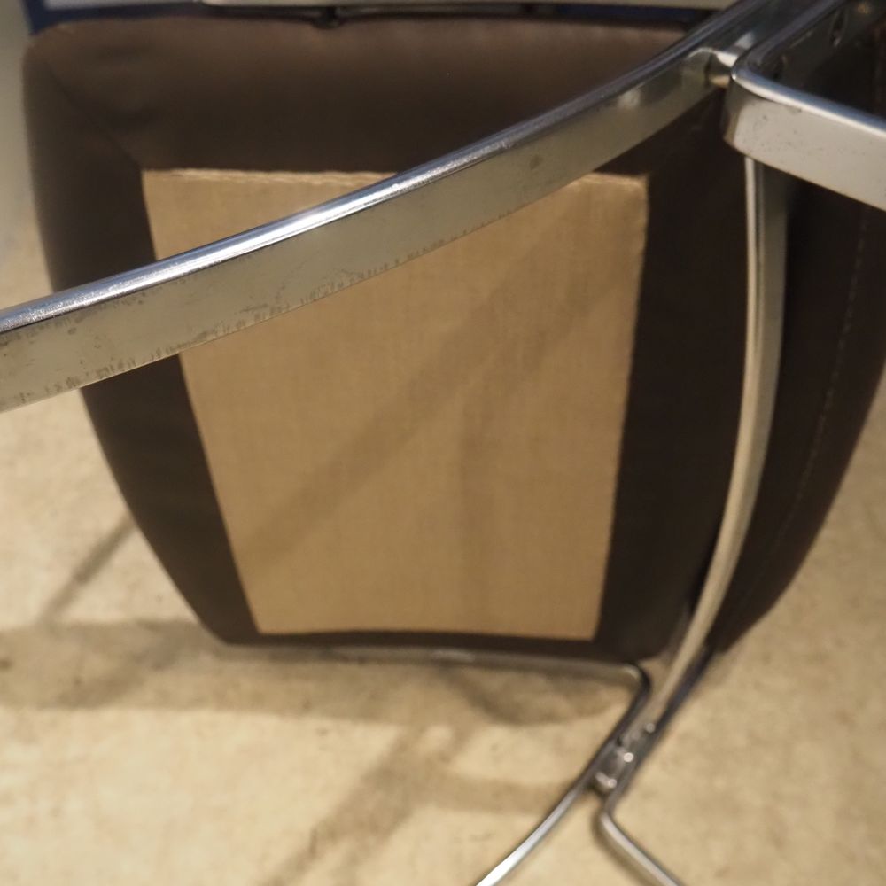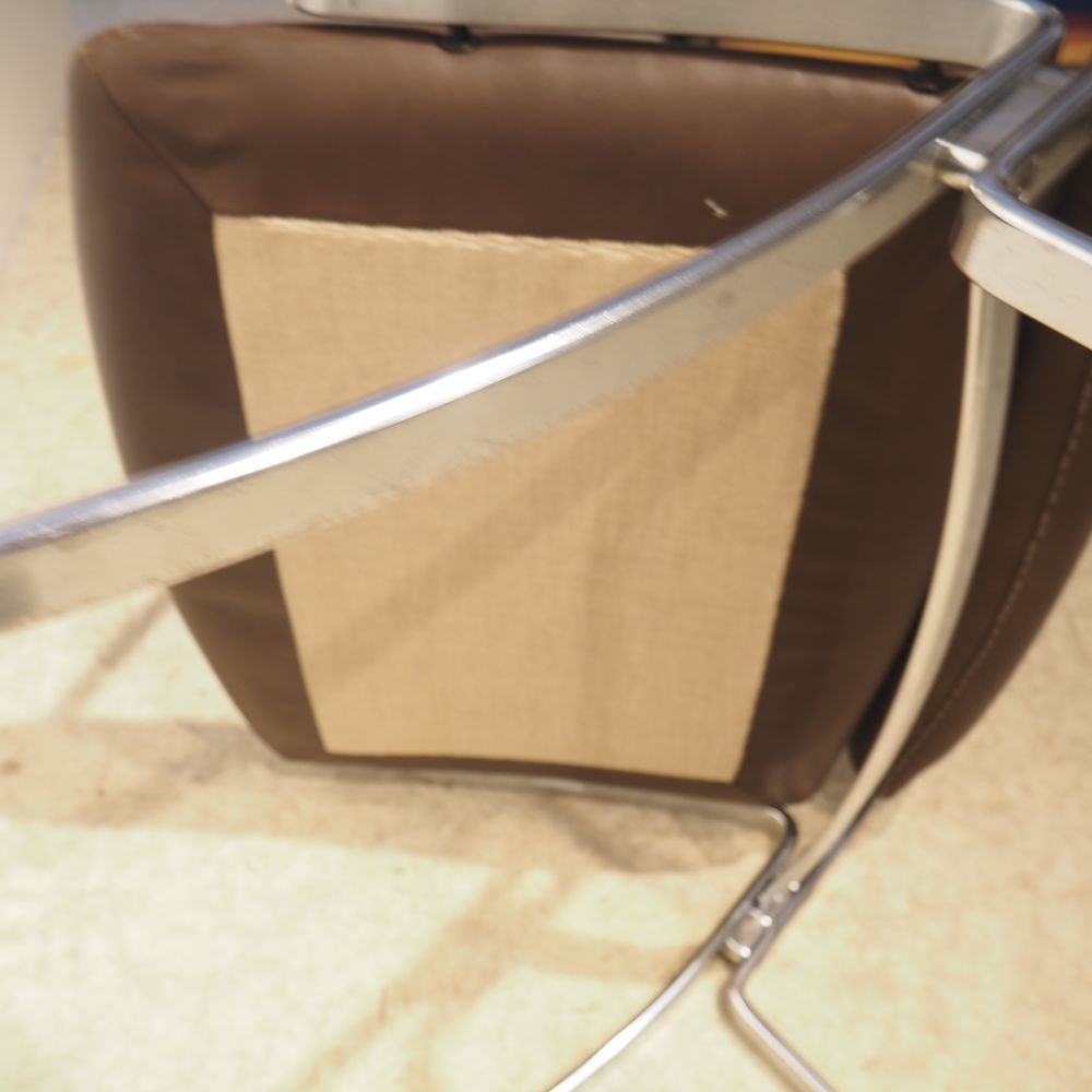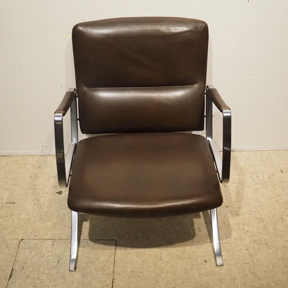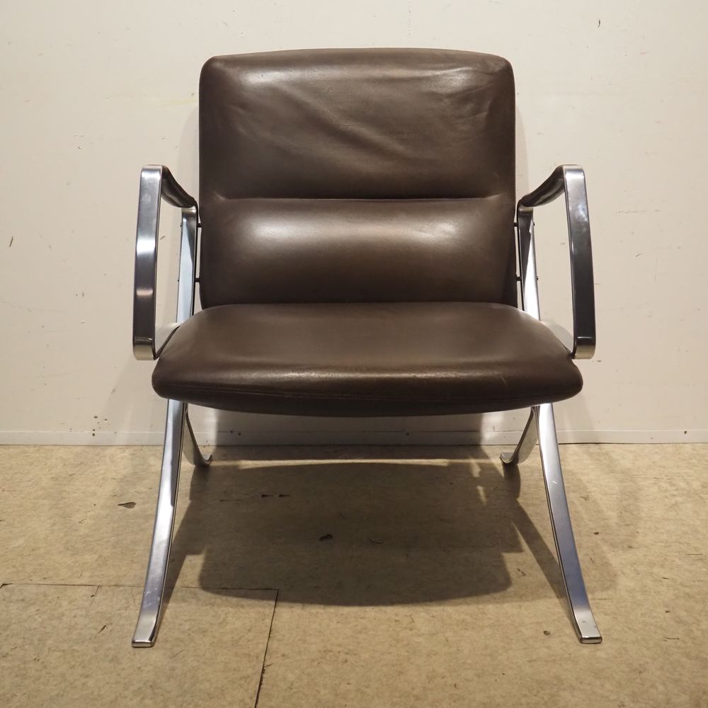 Preben Fabricius / Kil International : Paire de fauteuils visiteurs, structure apparente en acier cintré et brossé, assise et dossier en contre plaque moulé, garnis de mousse et recouvert de cuir marron