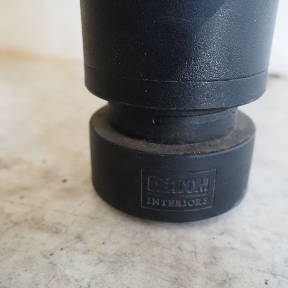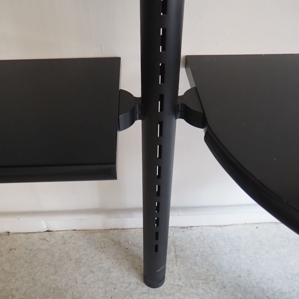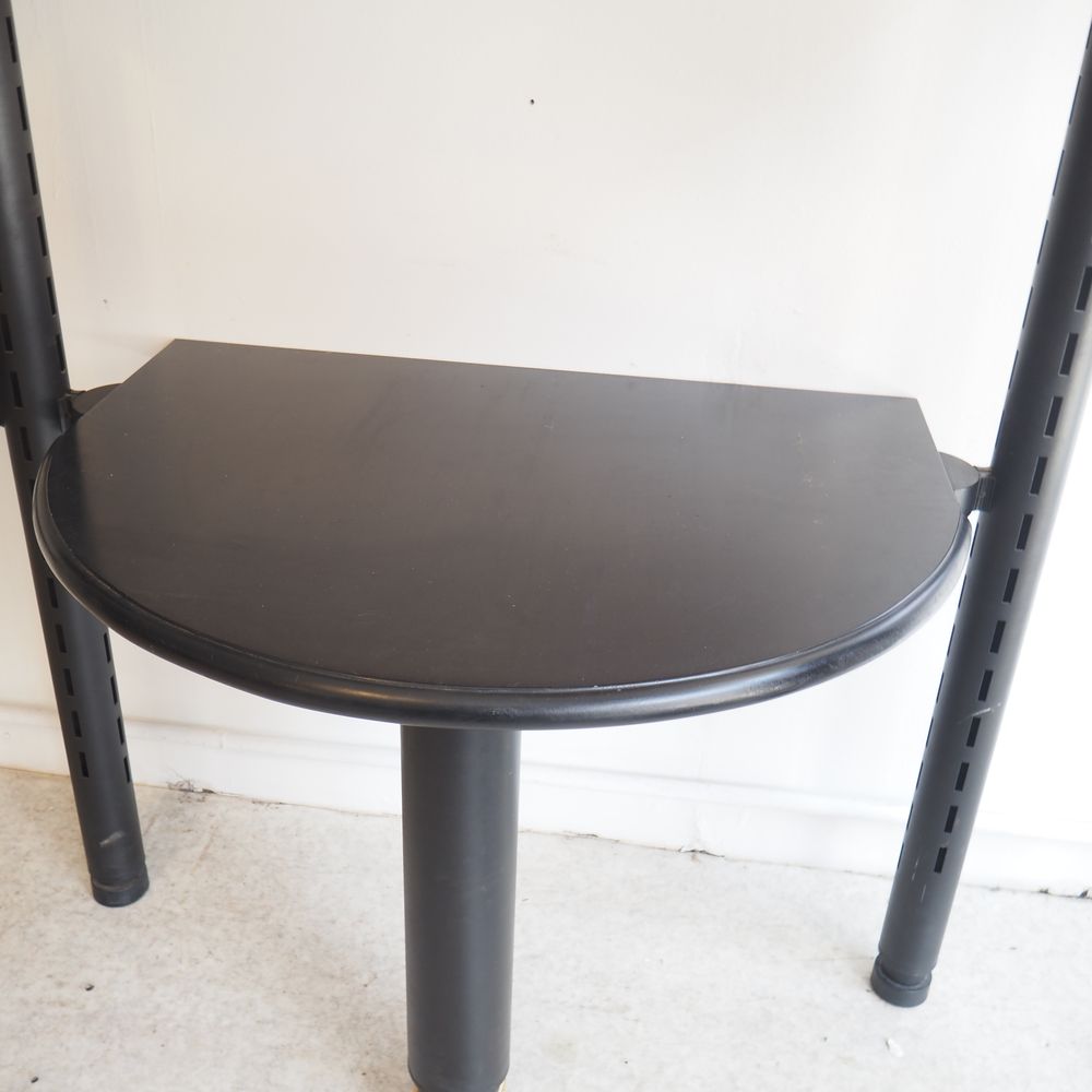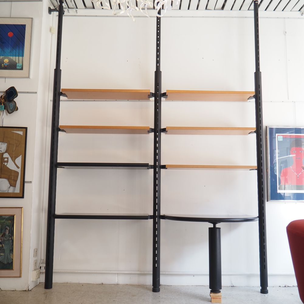 Deroom Interiors : Bibliothèque sol/plafond, composée de 3 montants tubulaires en acier laqué noir, table de bureau en demi rond sur pied central et 7 étagères en MDF dont 5 ciré naturel et 2 ciré noir, réglable, H max: 350, L: +/- 210, P: 70/40/30 cm