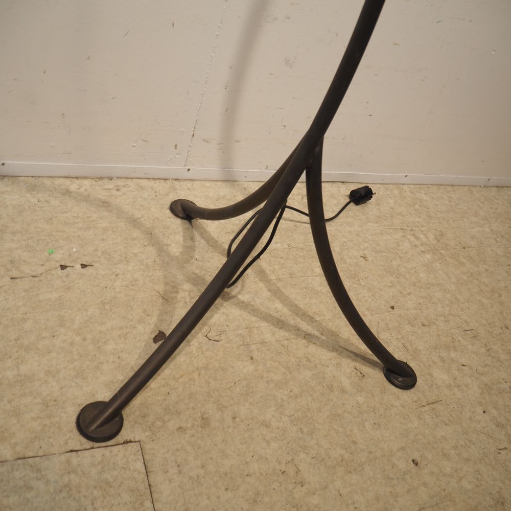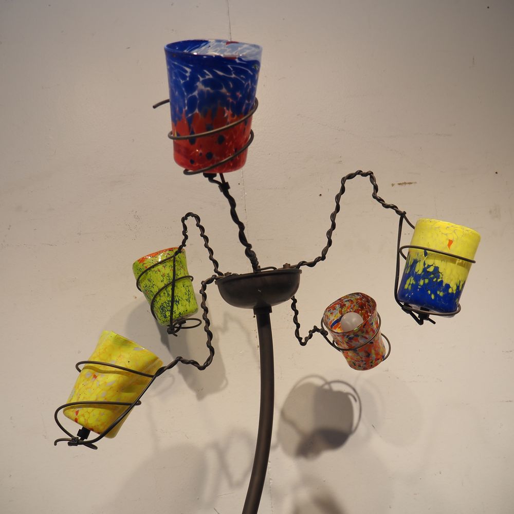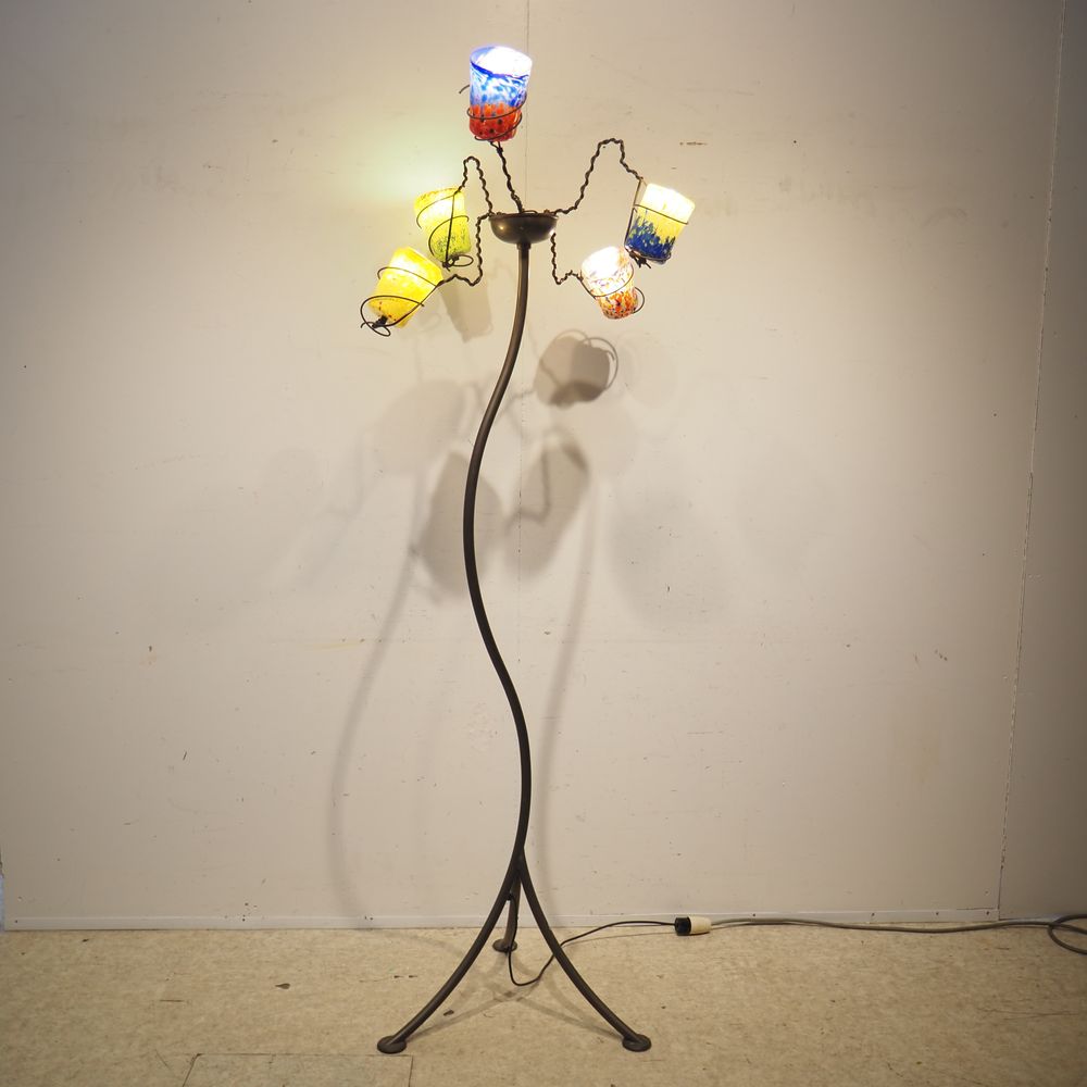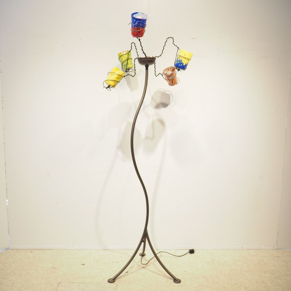 Ercole Barovier & Ermano Toso / Murano : Lampadaire tripode vers 1990, modèle I Goto, structure en fer forgé à patine canon de fusil, 5 branches avec bobèches de verre soufflé de différentes couleurs, H: 192, diam: 70 cm