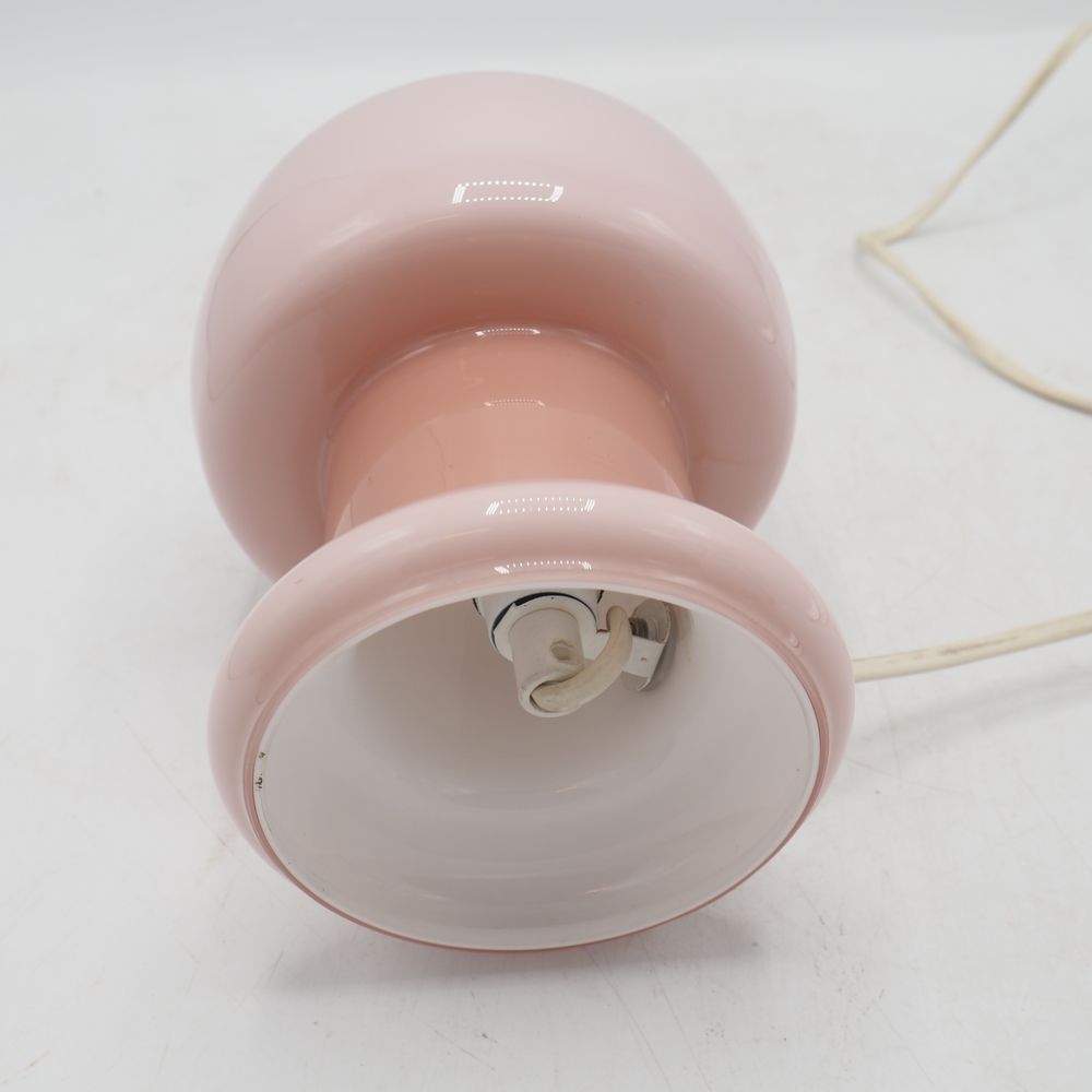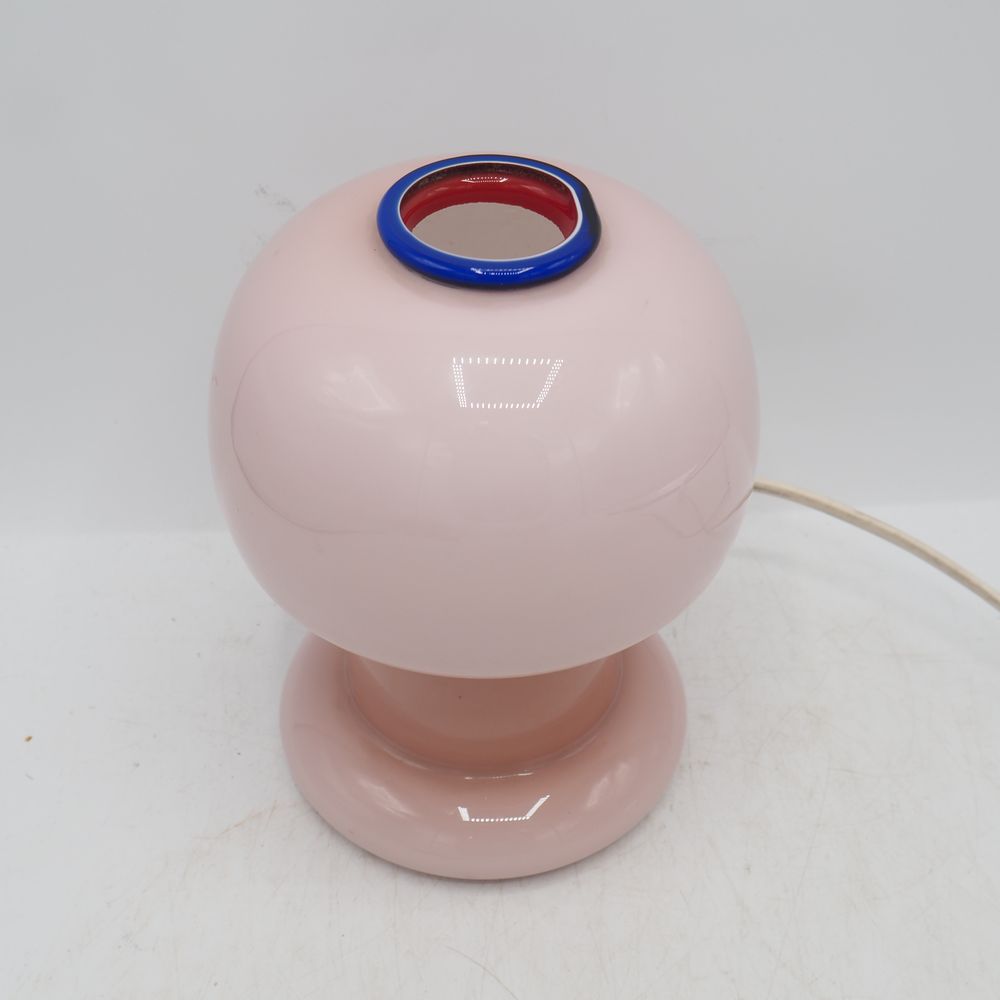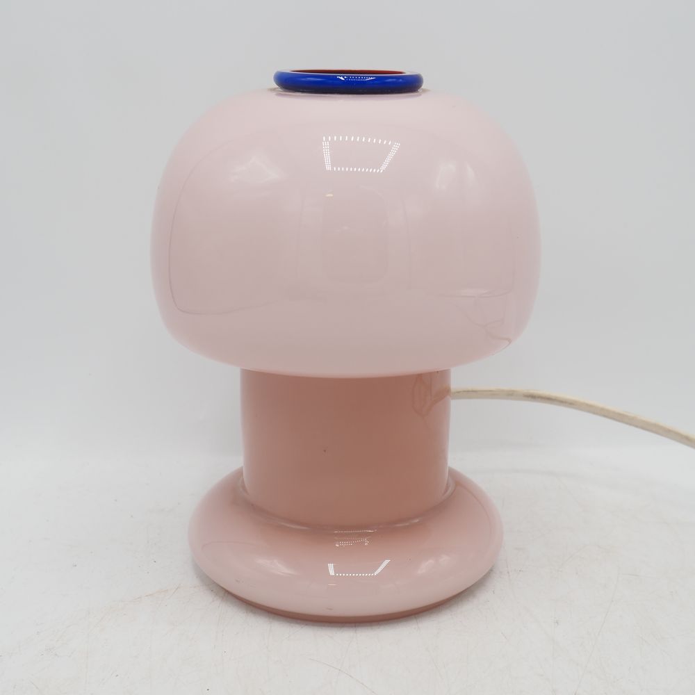 Style Memphis : Lampe de chevet champignon vers 1980, verre soufflé moulé, ton saumon et filet bleu rouge appliqué à chaud, H: 18,5, diam: 13,5 cm