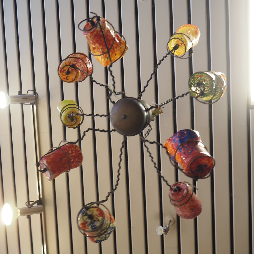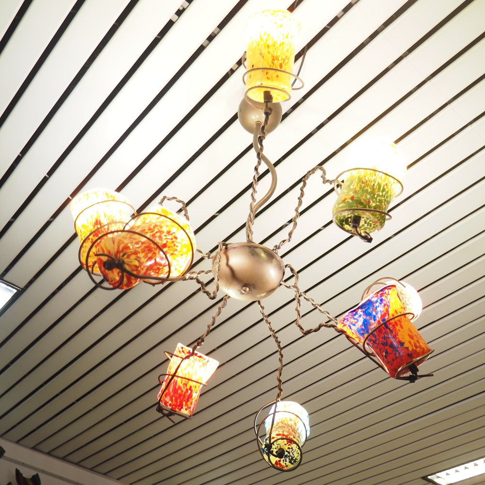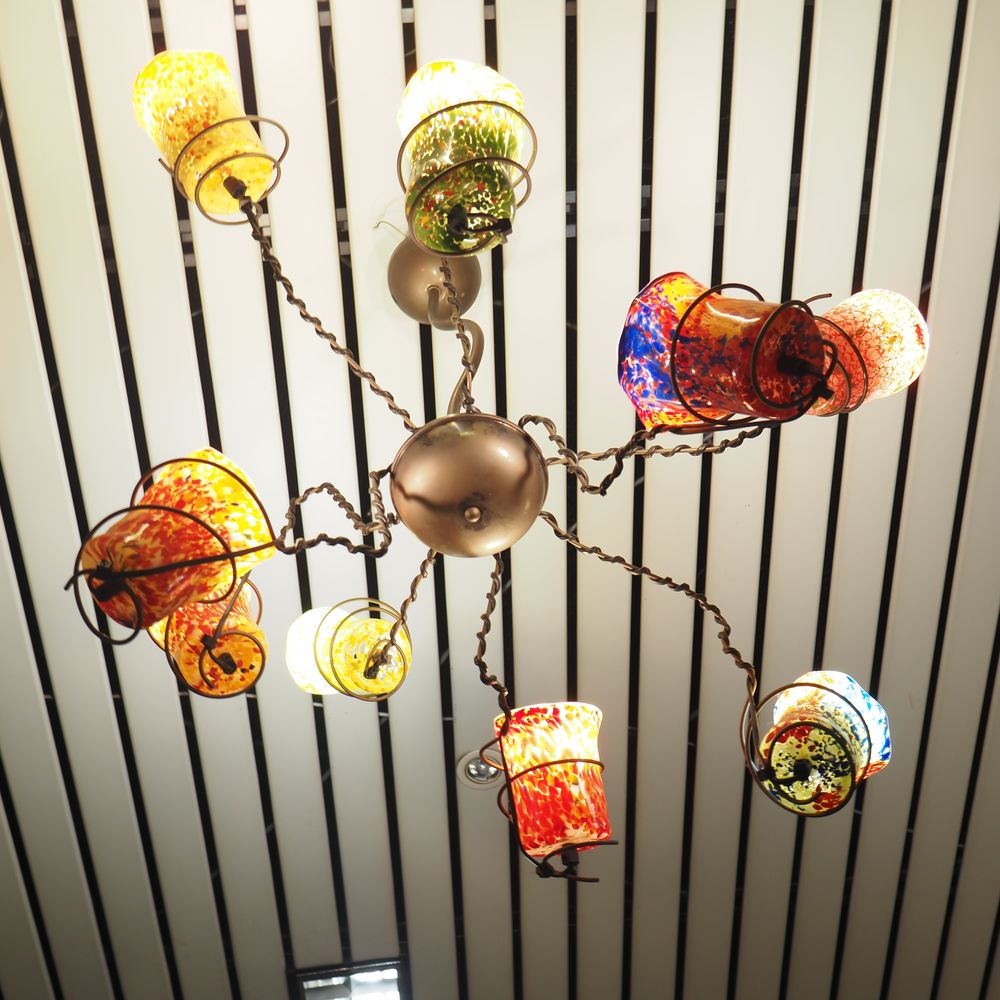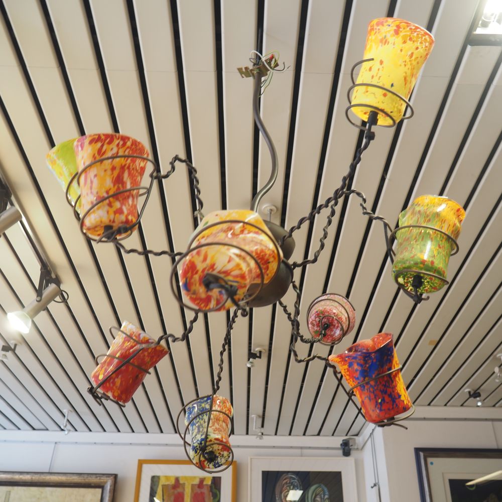 Ercole Barovier & Ermano Toso / Murano : Suspension vers 1990 modèle I Goto, structure en fer forgé à patine canon de fusil, 9 bras de lumière avec bobèches de verre soufflé de différentes couleurs, H: 85, diam: 85 cm