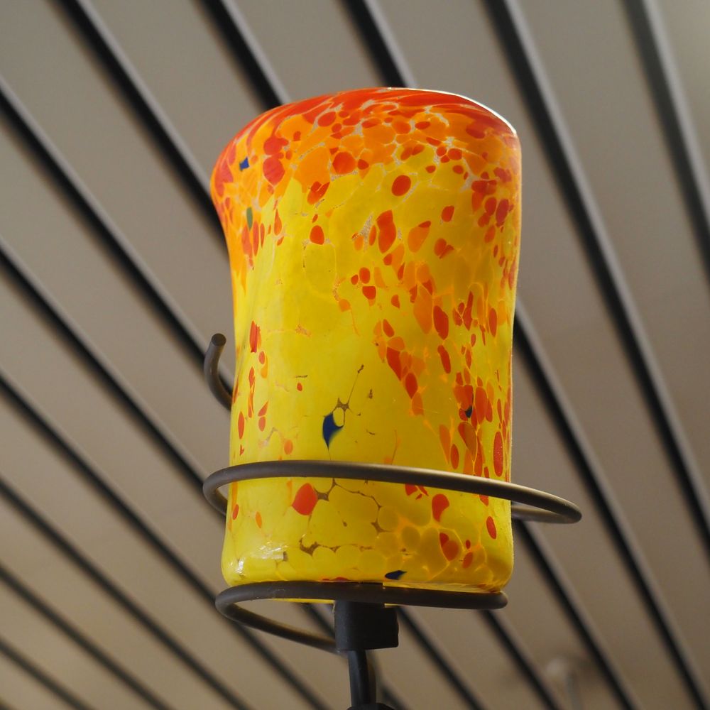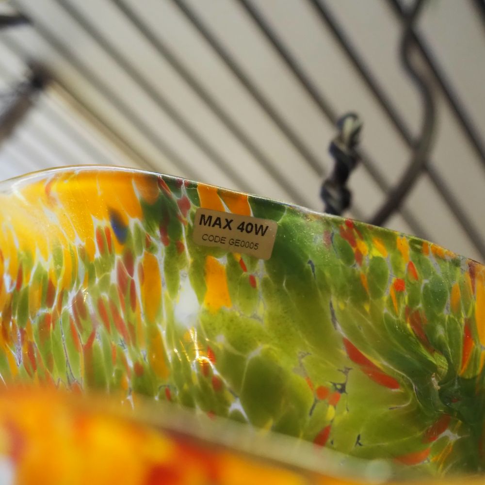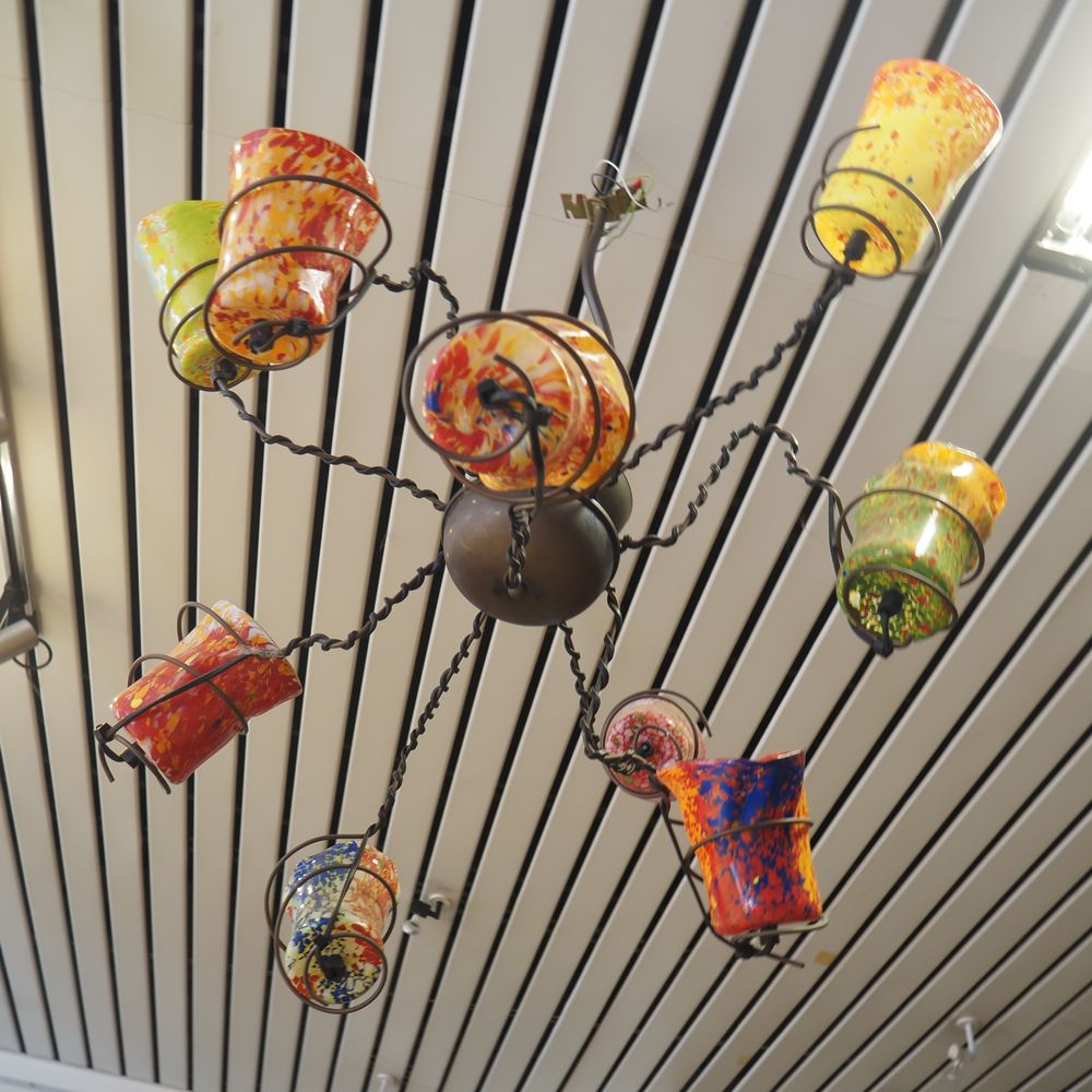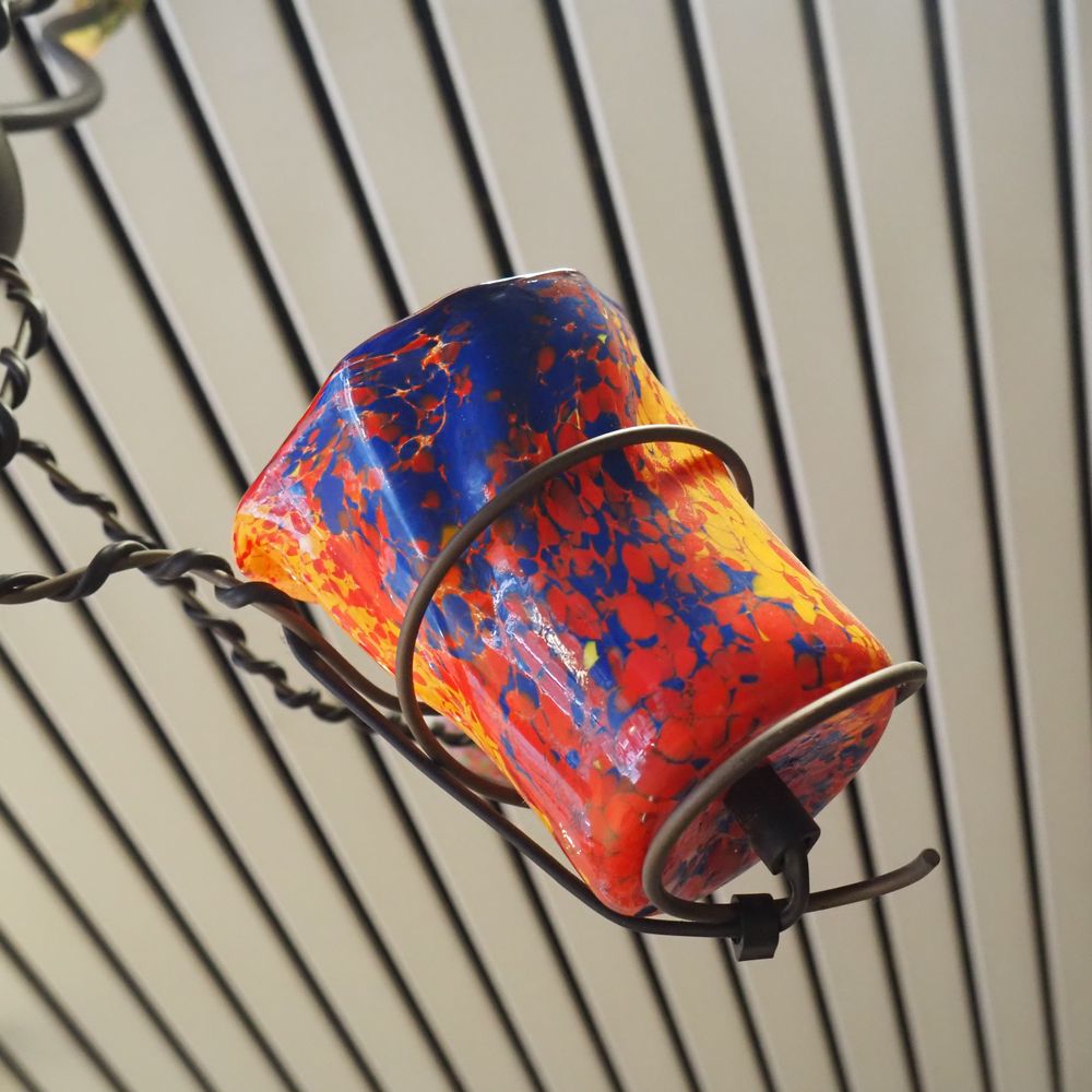 Ercole Barovier & Ermano Toso / Murano : Suspension vers 1990 modèle I Goto, structure en fer forgé à patine canon de fusil, 9 bras de lumière avec bobèches de verre soufflé de différentes couleurs, H: 85, diam: 85 cm