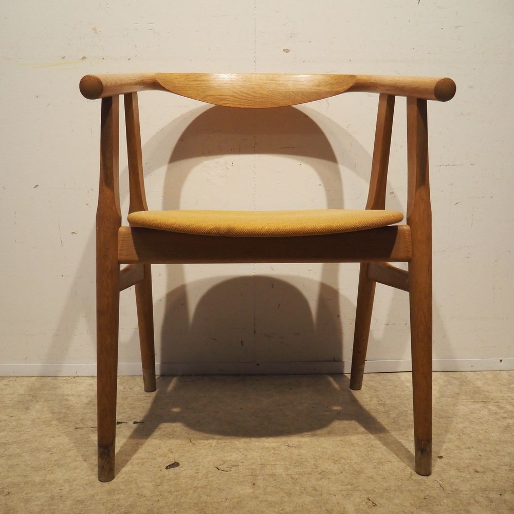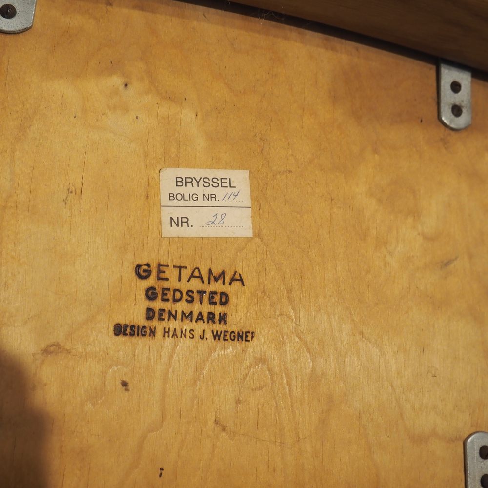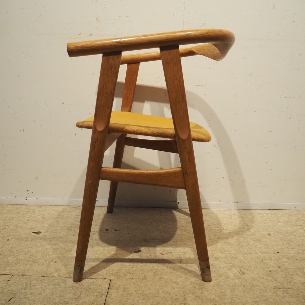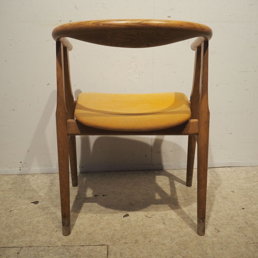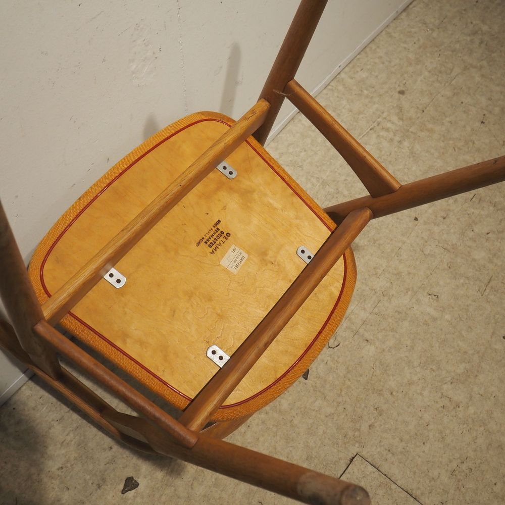 Hans Wegner / Getama danemark : Chaise vers 1960, chêne clair, dossier cintré, assise en contre plaqué garnie d’un tissu orangé, cachet sous la base
