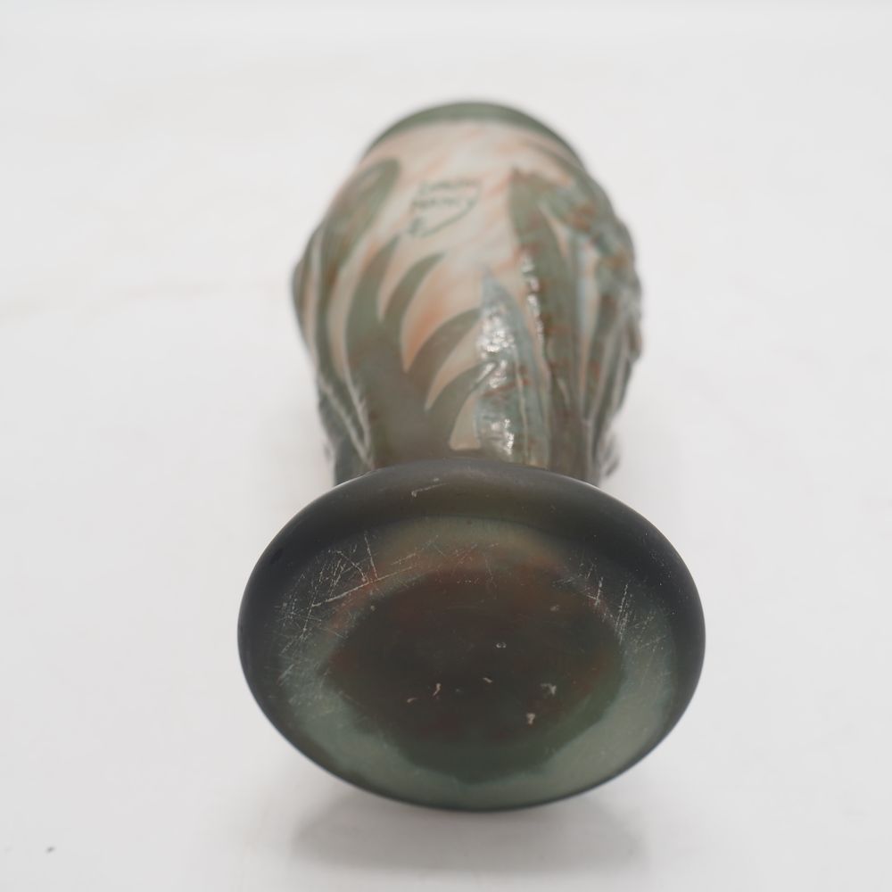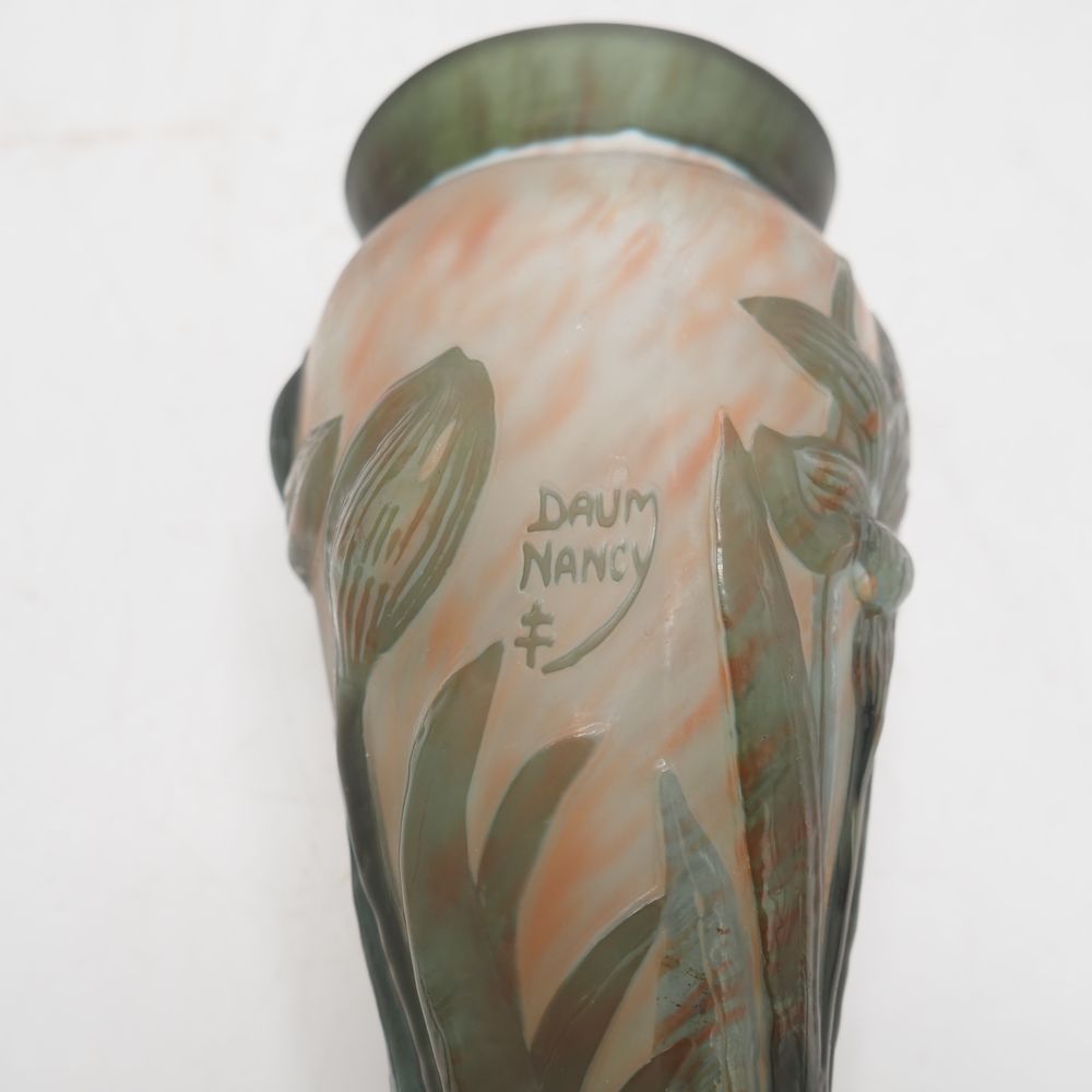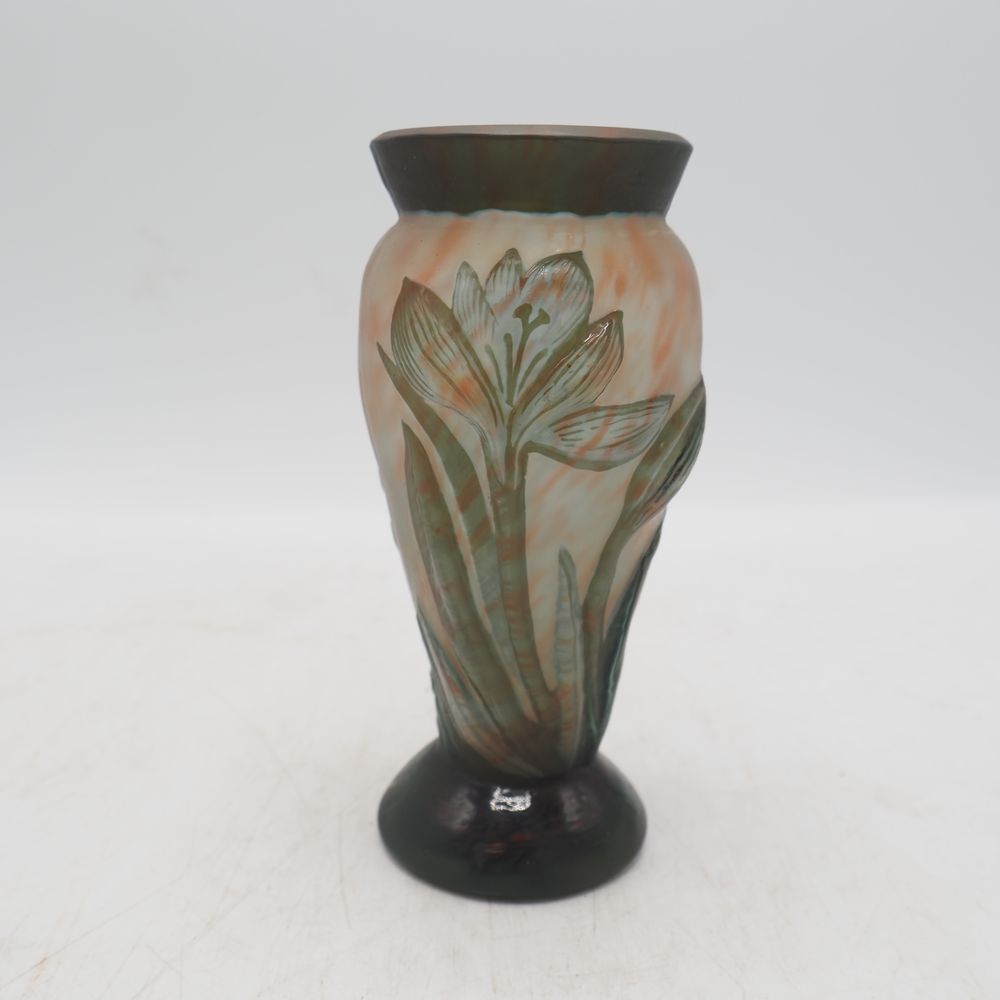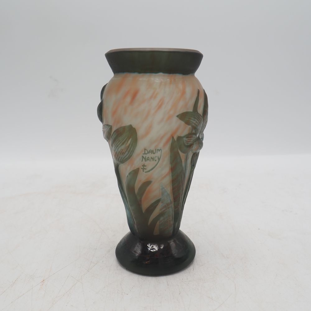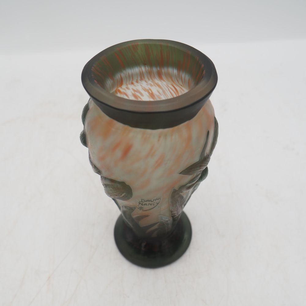 Daum Nancy : Vase vers 1900, verre soufflé bouche moulé , décor floral en relief, pied douche, H: 15, diam: 7,5 cm