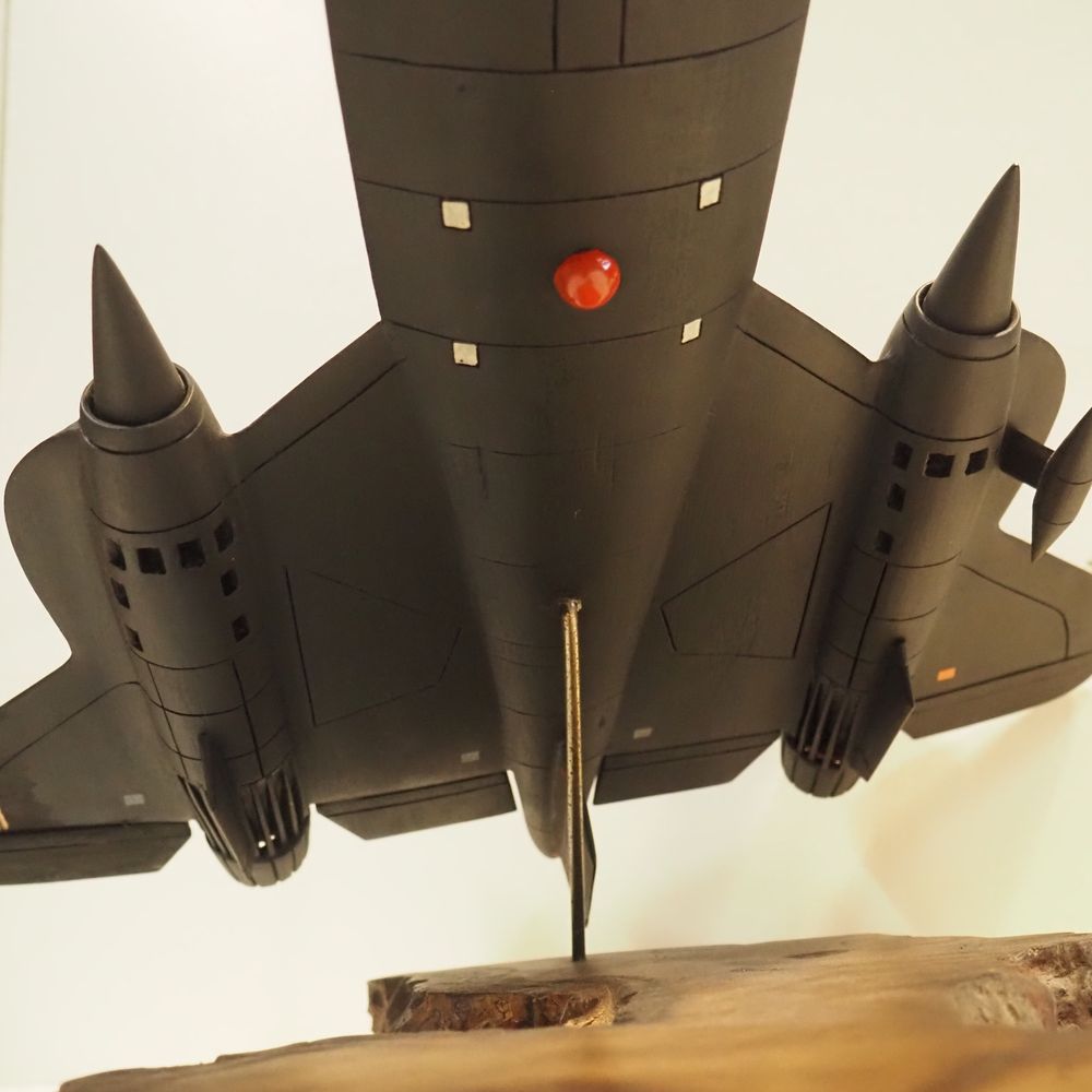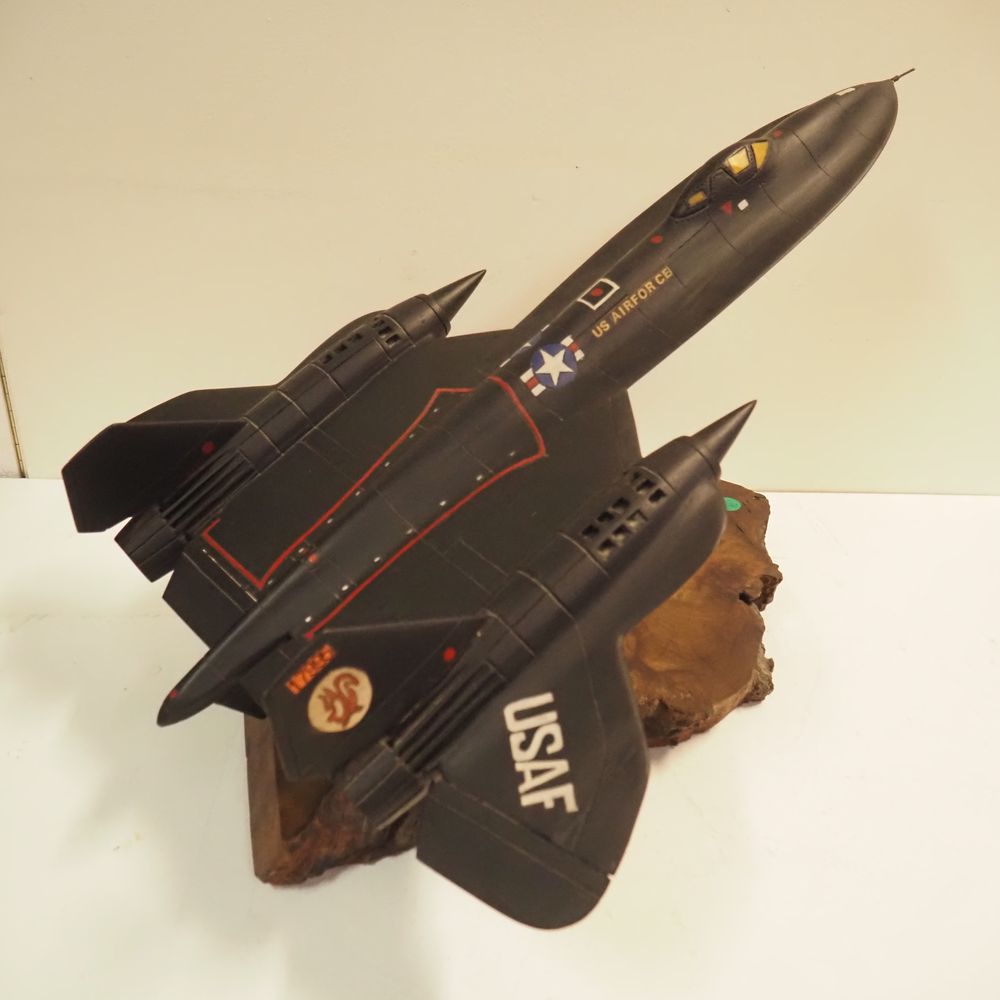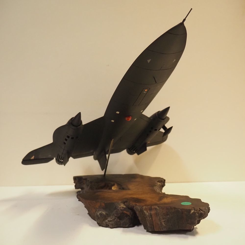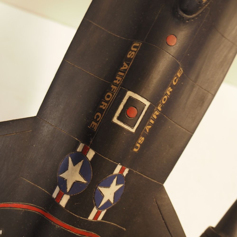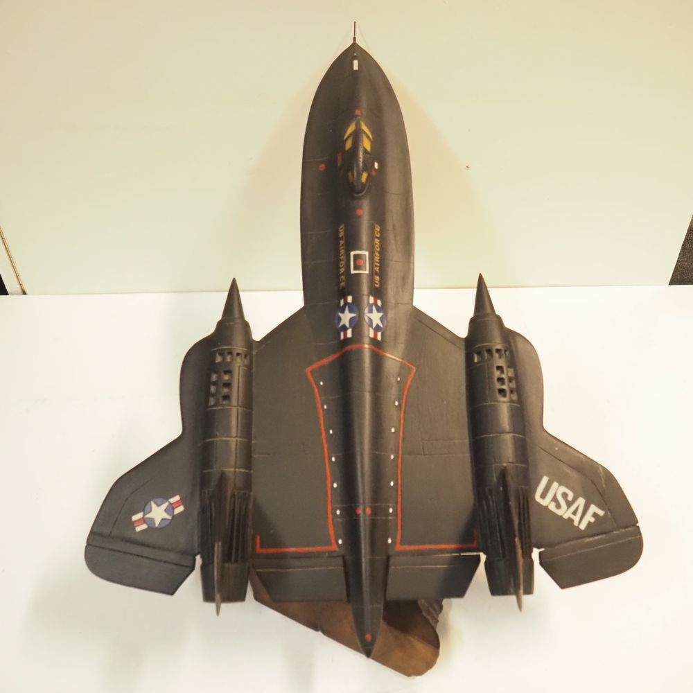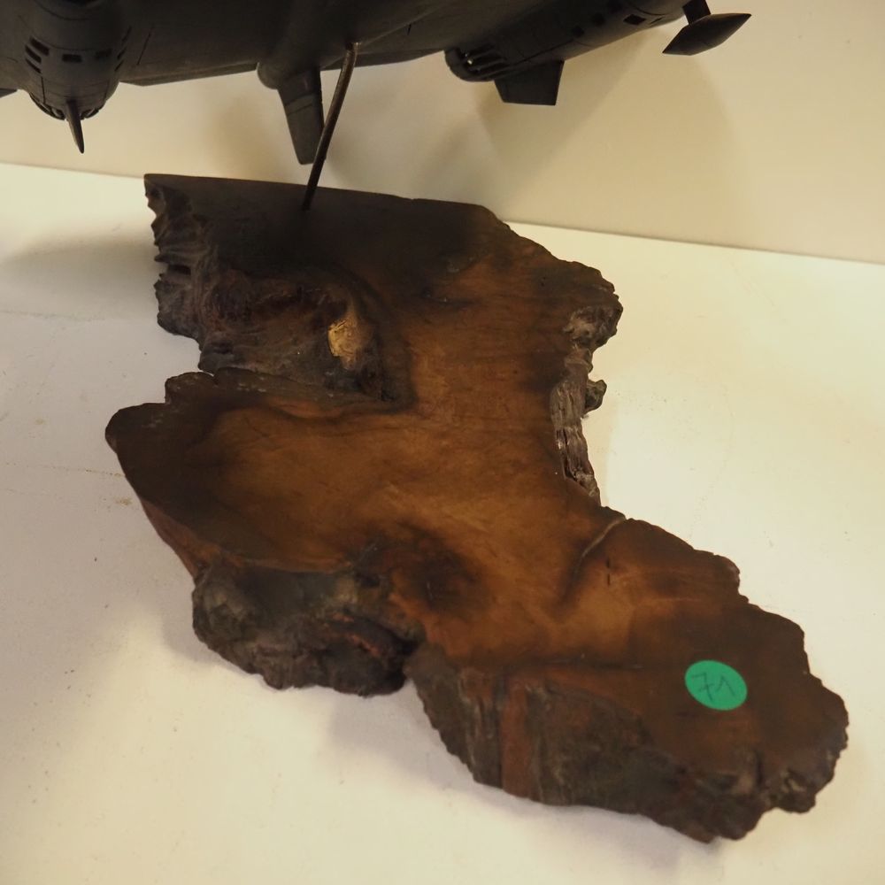 Travail artisanal : Avion de chasse américain vers 1990, bois sculpté peint noir sur socle de tranche de noyer, H: 35, L: 53, P: 44 cm