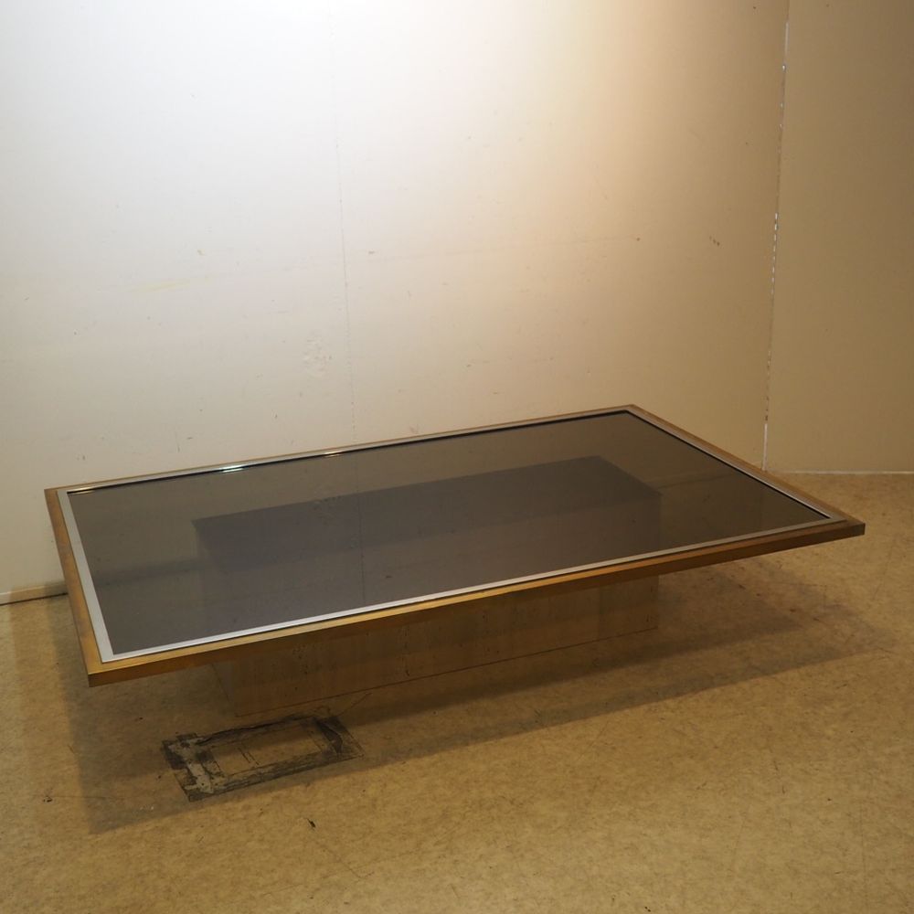 Roger Vanhevel (XX) : Table basse vers 1970, plateau rectangulaire en verre fumé plaqué d’une feuille de cuivre avec décor imprimé, ceinture tubulaire en laiton doré et acier chromé posé sur une piétement central en travertin, petit éclat invisible sous la ceinture, signé, H : 32, L : 149, P : 94 cm
