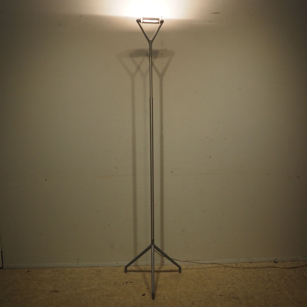 Lola Meda Rizzato / Luce Plan : Luminaire halogène vers 1980, fût télescopique en métal brossé, déflecteur et piétement tripode en plastique moulé gris, H: 160/202 cm