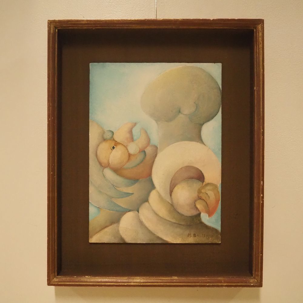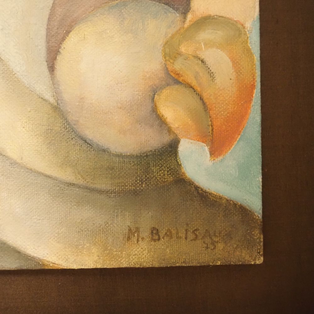 M. Balisaux : Huile sur panneau Unalit, composition, signée en bas à droite, datée 1975, dim: 32,7 x 24 cm