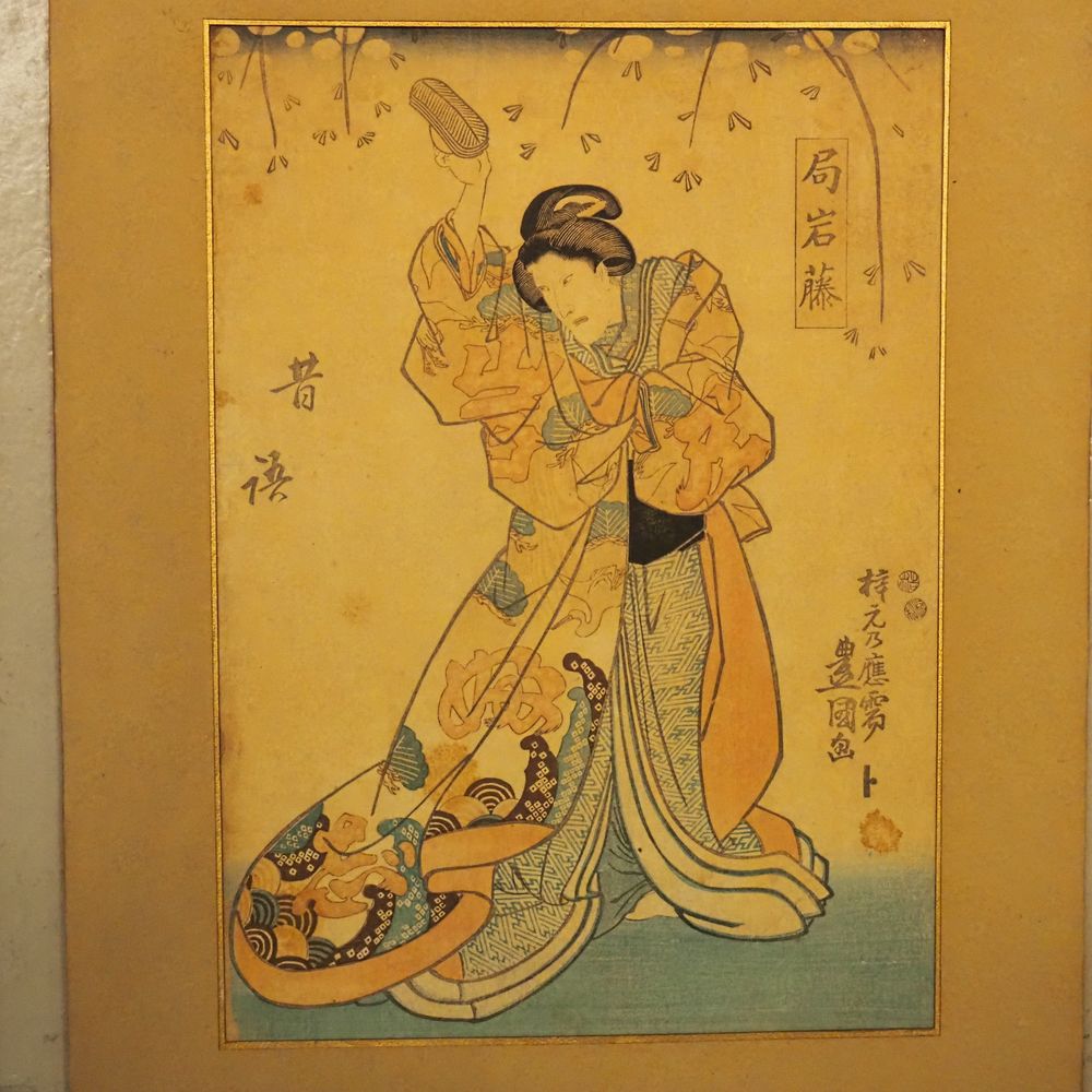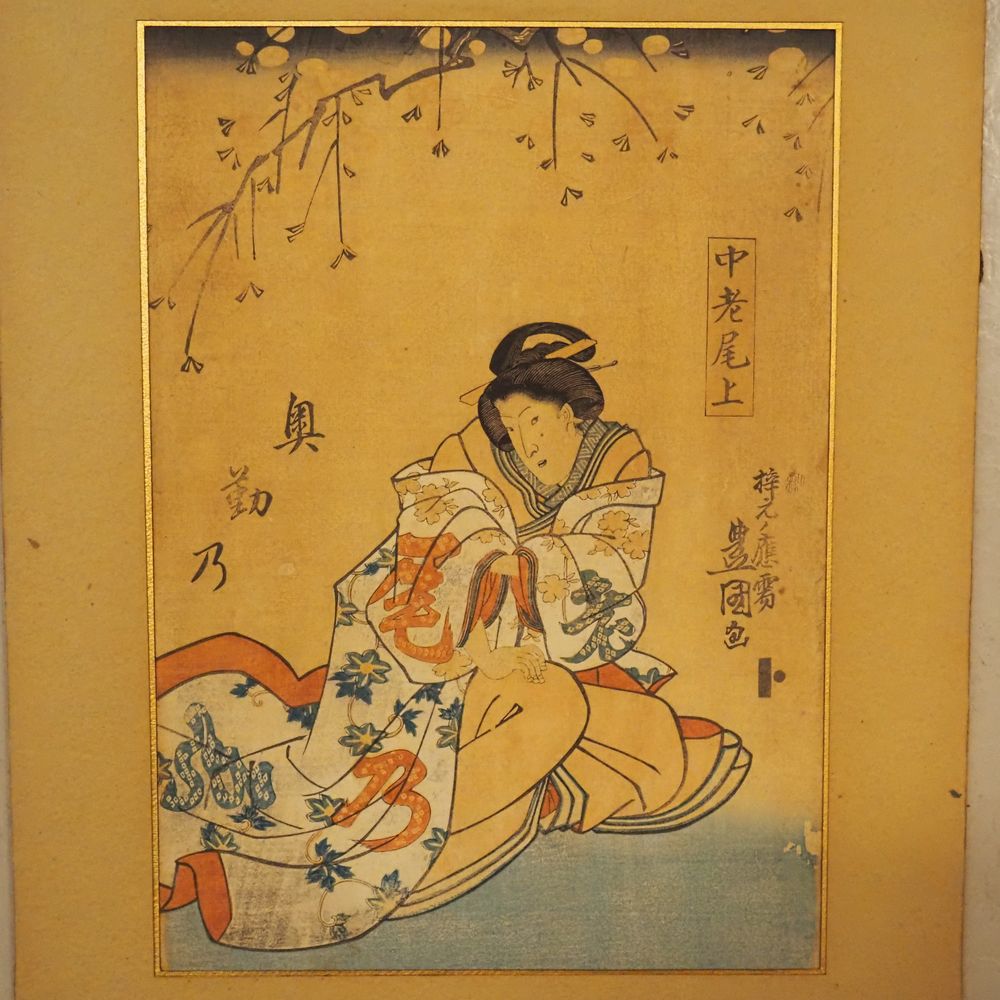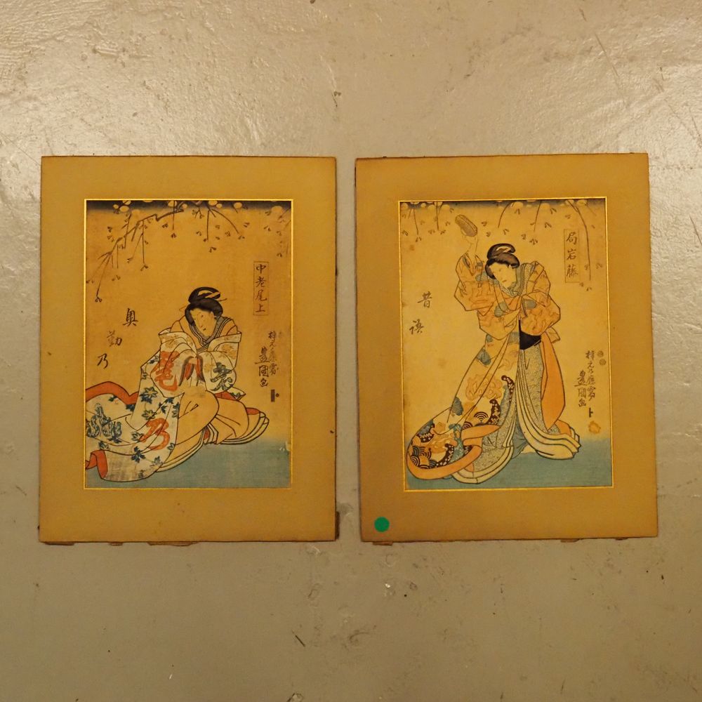 Lot de 2 estampes couleur japonaises vers 1900, dames, caractères Japonais côté droit, dim : 35 x 25 cm (ensollée)