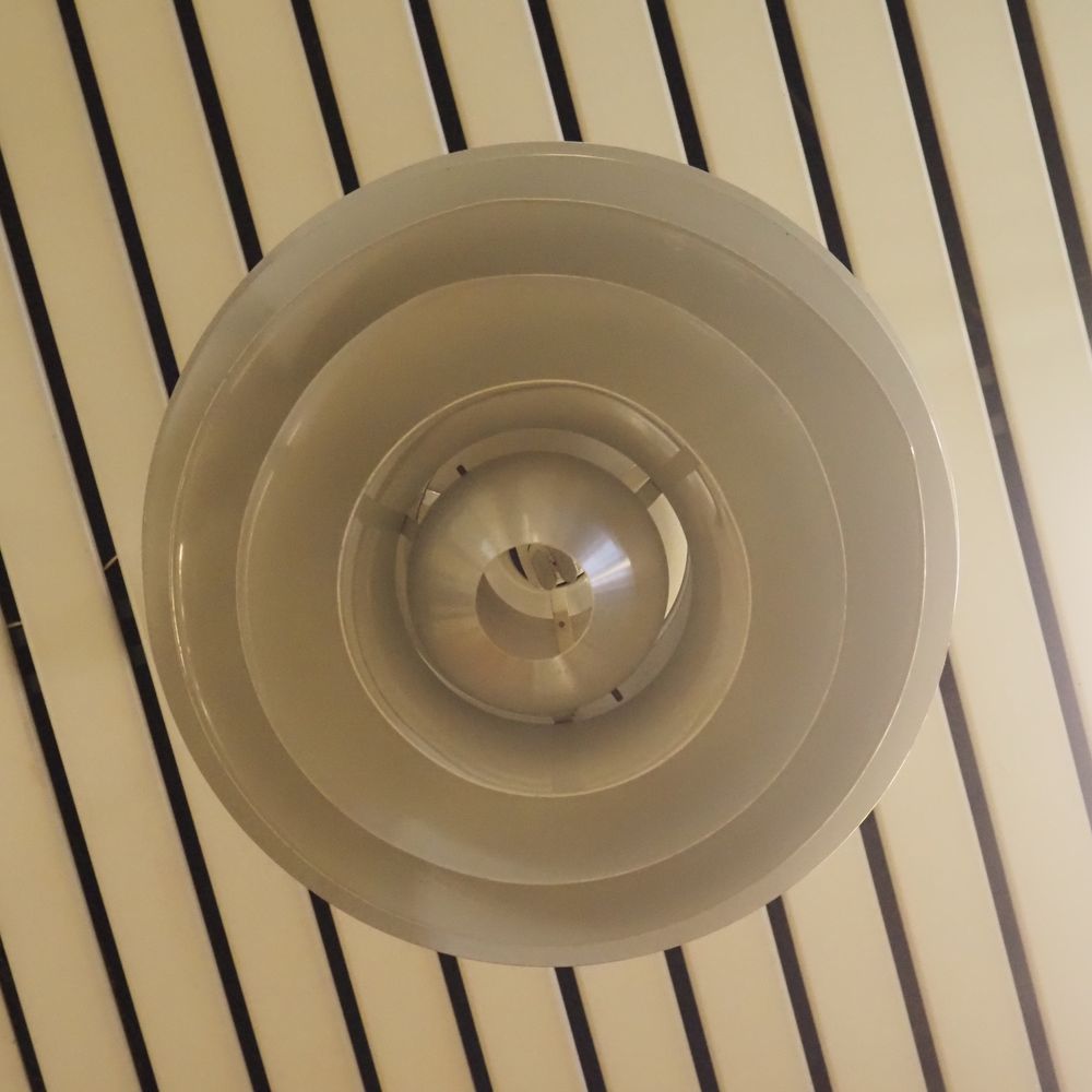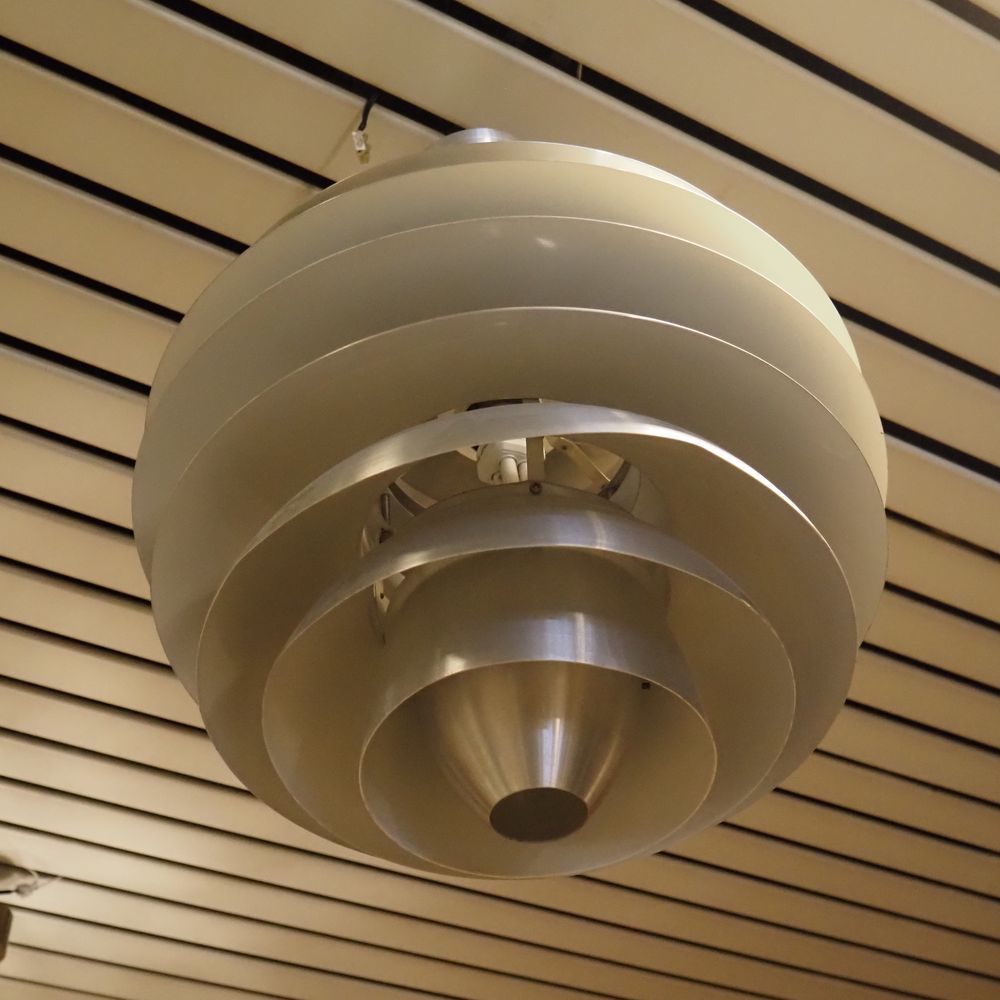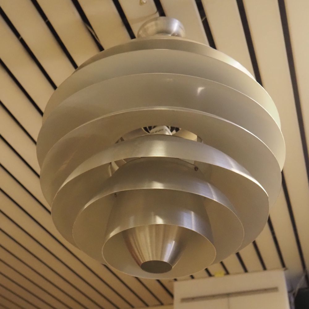 Poul Henningsen dans le gôut : Suspension, structure en aluminium brossé et intérieur laqué blanc, production vers 1980, H: 60, diam: 50 cm