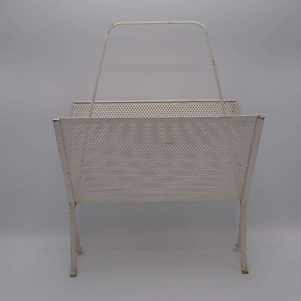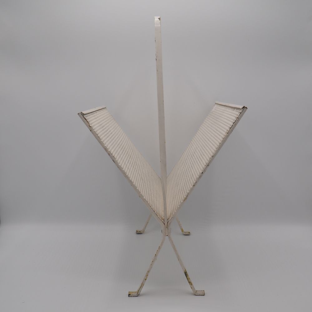 Mathieu Matégot (1910-2001) attribué : Porte revues vers 1950, tole de métal ajouré laqué blanc et fer forgé, H: 43, L: 31,5, P: 24,5 cm