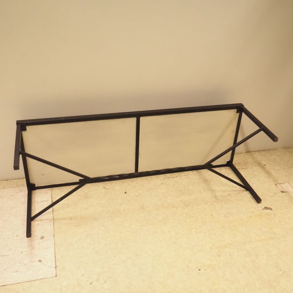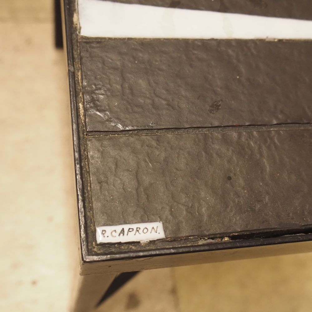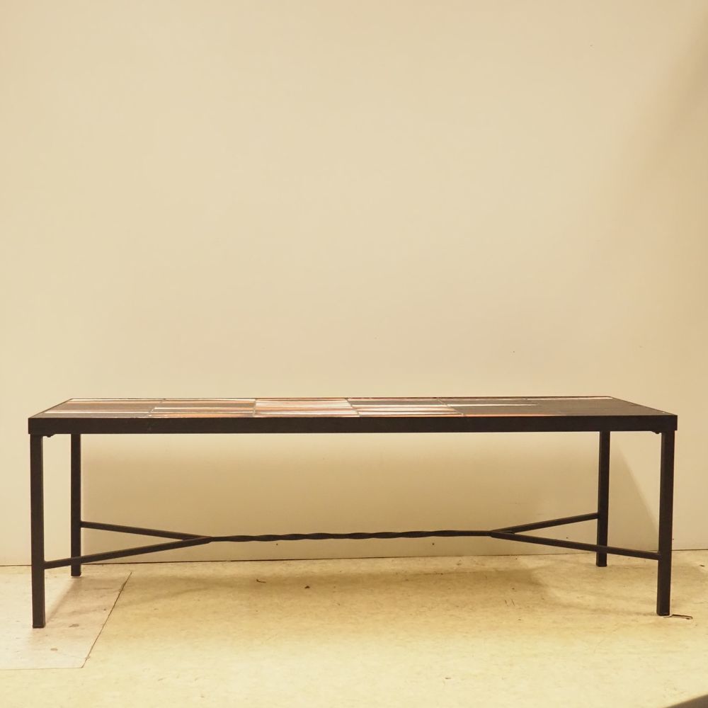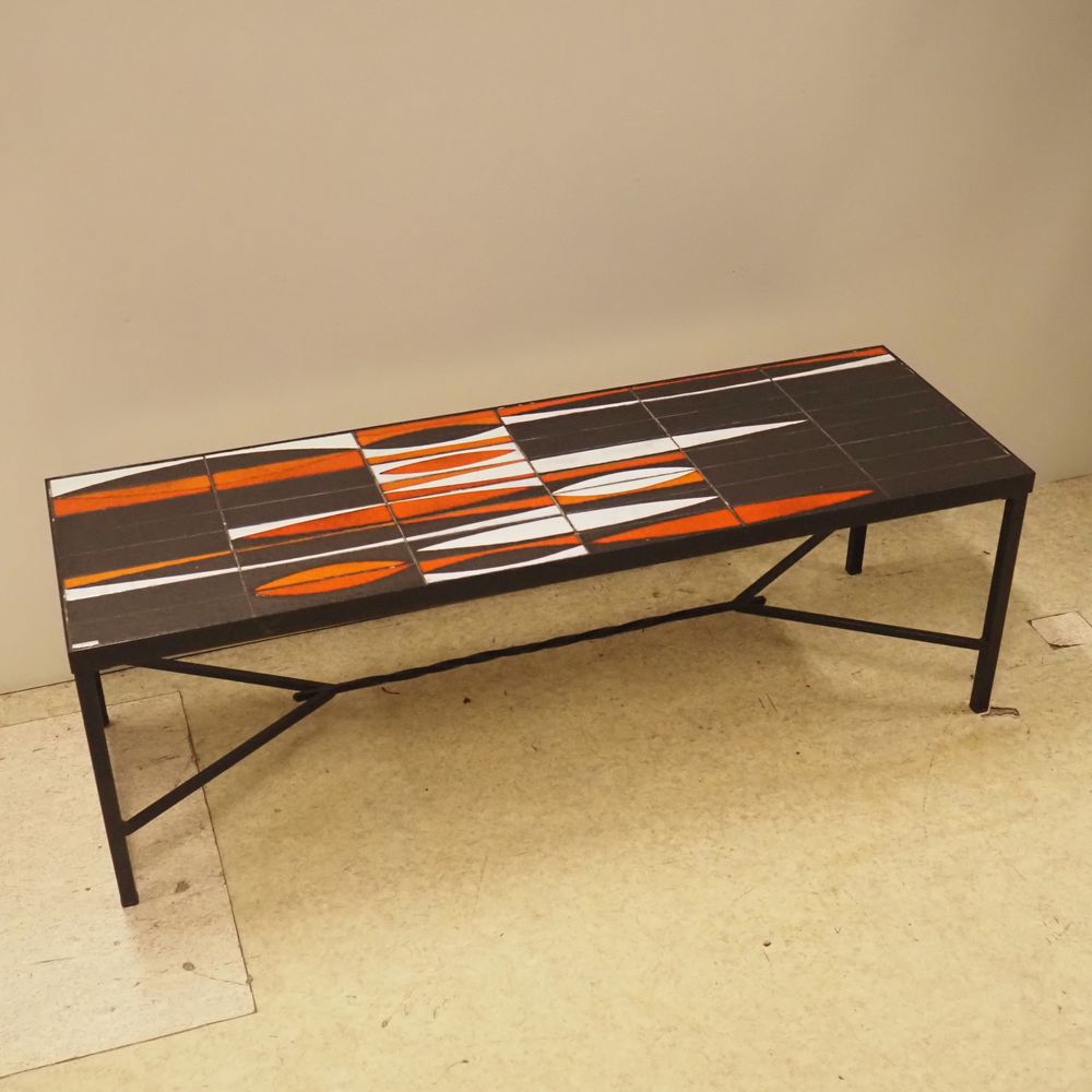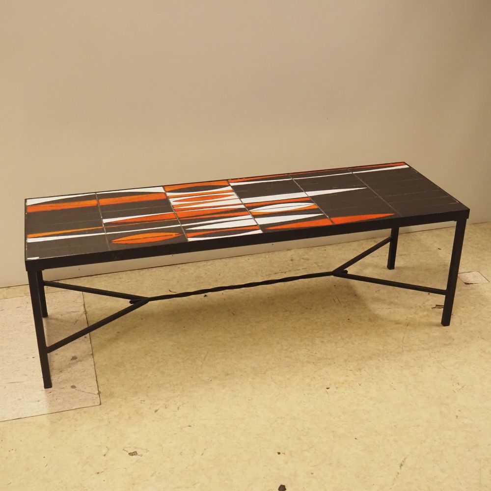 Roger Capron (1922-2006) / Vallauris : Table vers 1960, plateau rectangulaire composé de carreaux en céramique émaillée, décor dit navette couleur rouge, orange et blanc et fond noir, enchassé dans une structure en acier à 4 pieds tubulaire en métal laqué noir, signée, très bel état, H: 39, L: 121, P: 41 cm