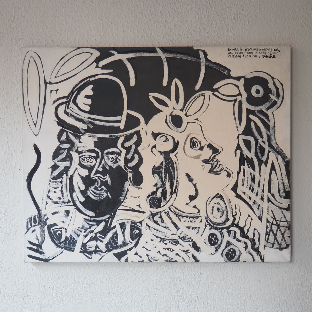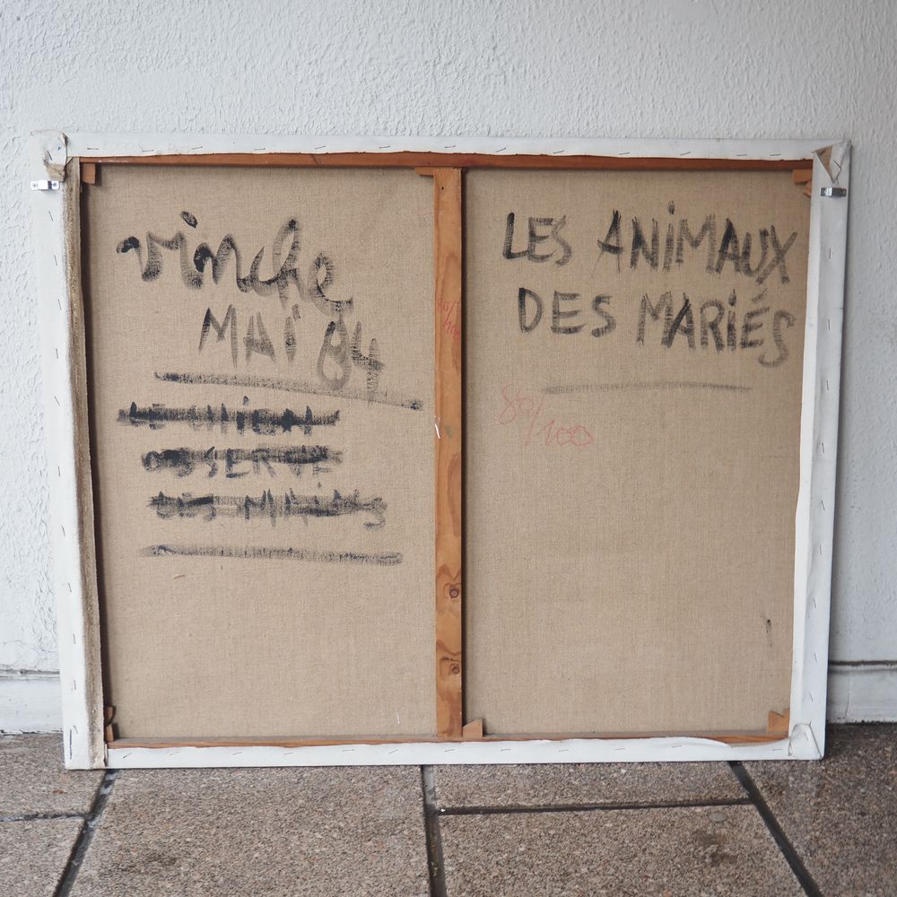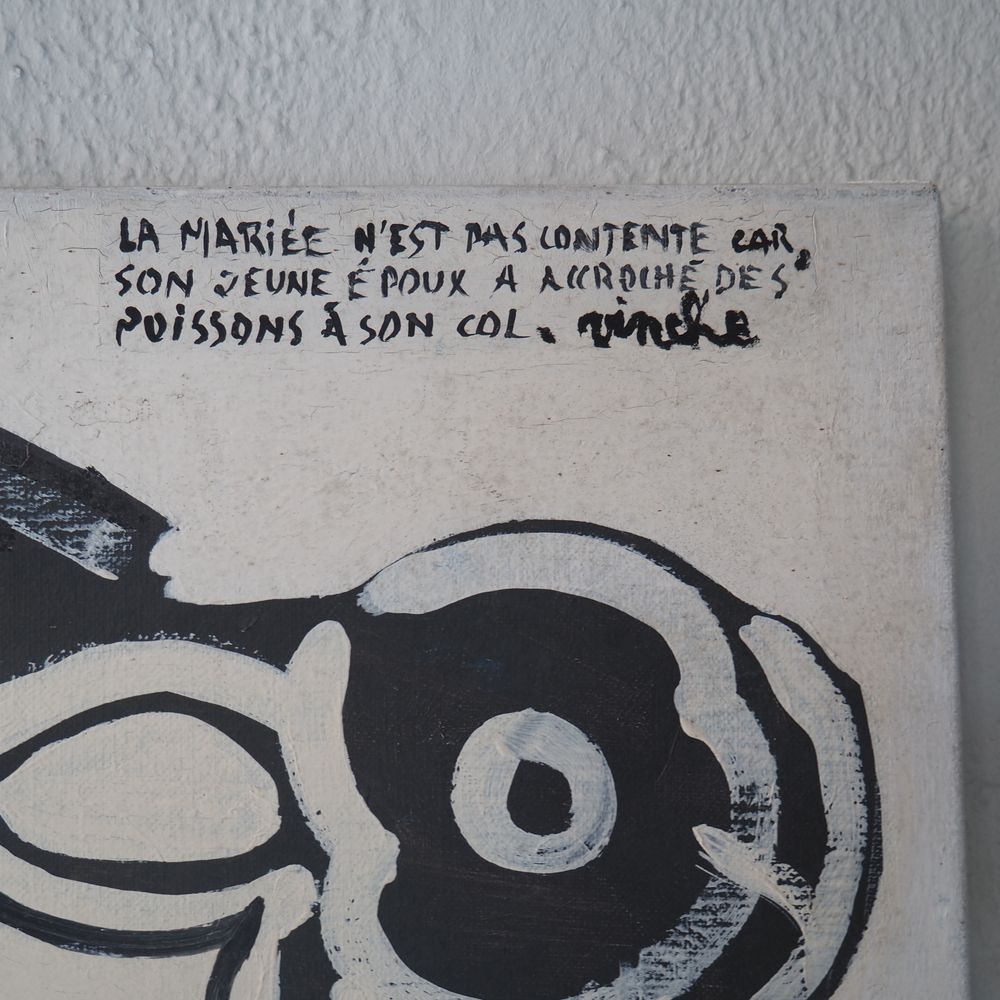 Lionel Vinche : Acrylique sur toile, « Les animaux des mariés + texte la mariée n’est pas contente car son jeune époux a accroché des poissons à son col.Vinche », signée en haut à droite, contresignée, dim: 80 x 100 cm