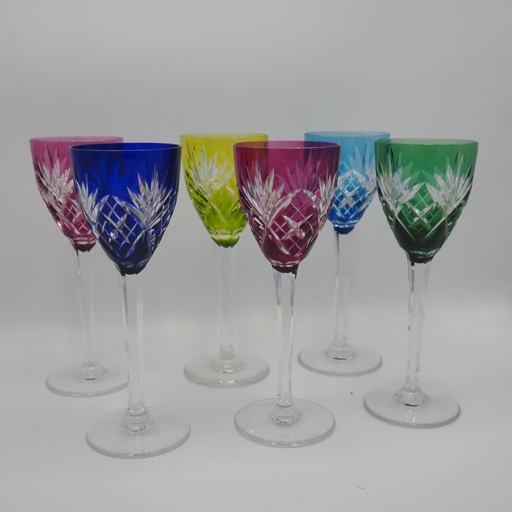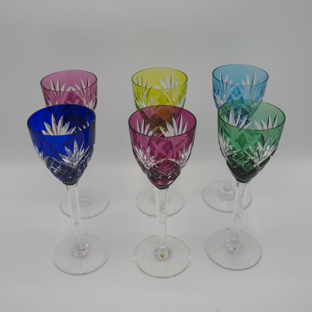Saint-Louis : Lot de 6 verres à vin, cristal clair taillé et doublé de 6 couleurs différentes, coupe ovoide, décor à l’épi, jambe à section hexagonale, pied disque, estampillé sous la base, H: 21,4 cm