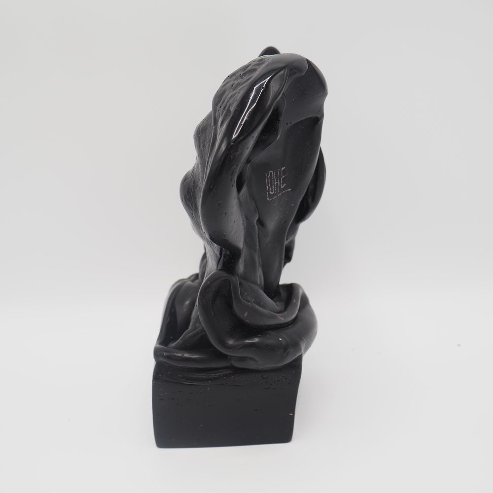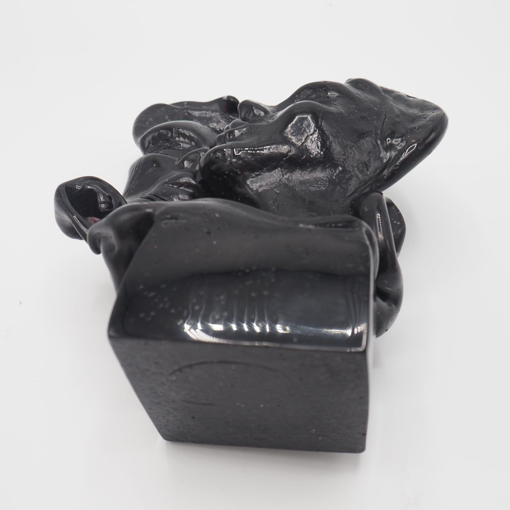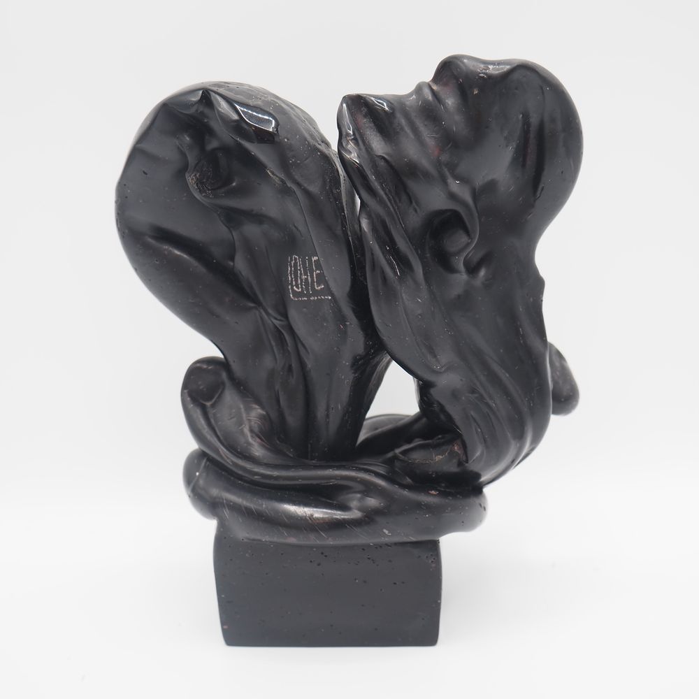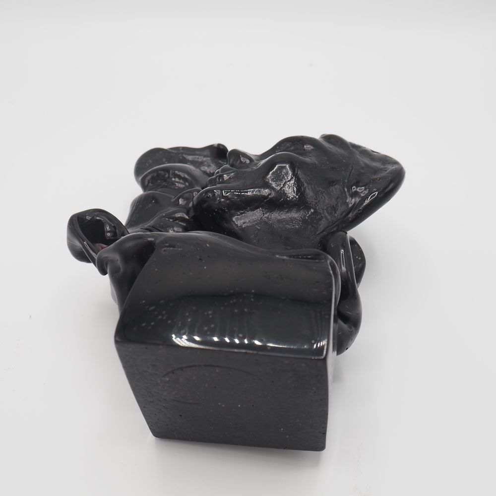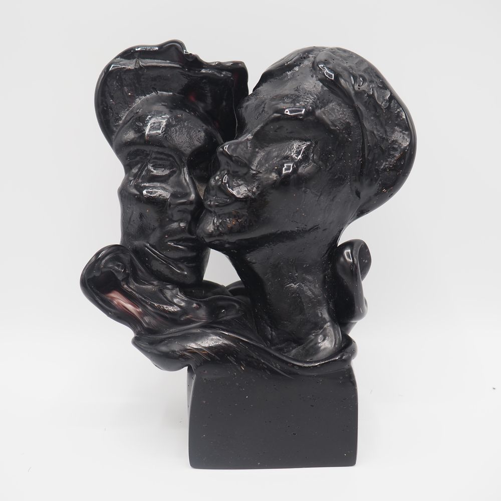 Yves Lohe 1947: Sculpture, verre noir brut, figurant un couple de personnages, signée au dos, H: 20, L: 17,5, P: 8,5 cm
