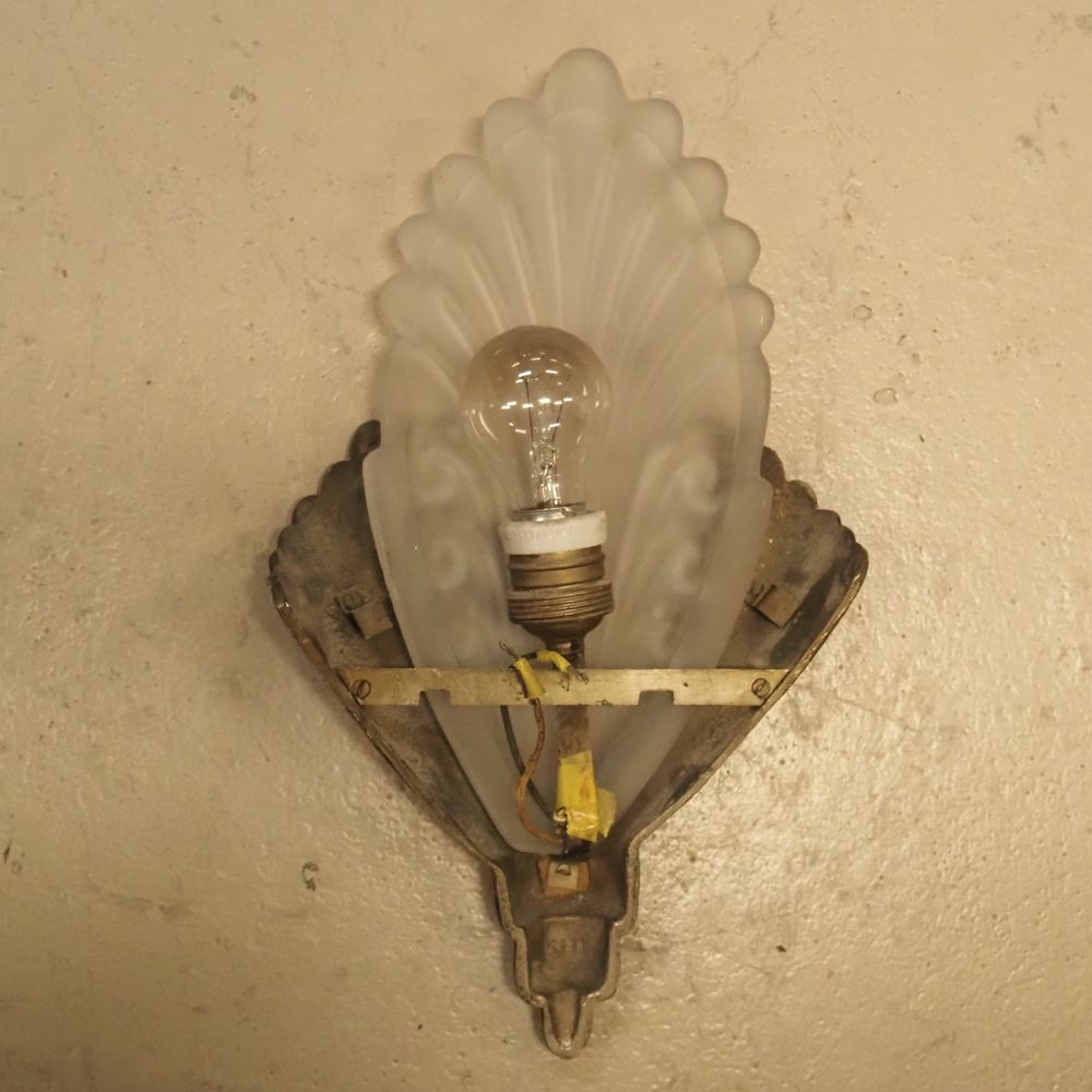 Paire d’appliques Art-Déco : Monture en bronze à patine nickelée avec feuille de verrre en forme de feuilles de palmier, H: 37, L: 21, P: 9 cm