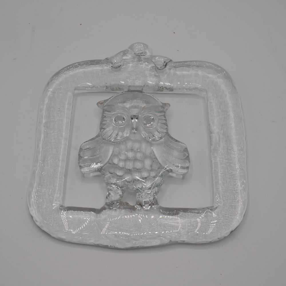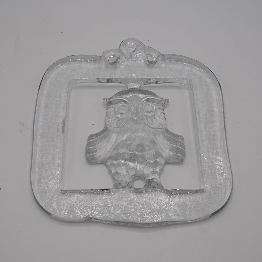Travail Scandinave : Objet de décoration à pendre vers 1970, verre moulé ajouré figurant un chouette, H: 23,5, L: 21 cm