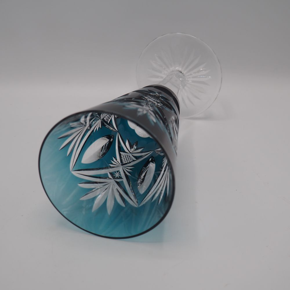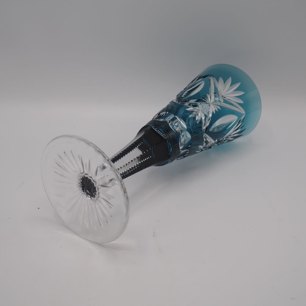 Val Saint-Lambert : Vase cornet, cristal clair soufflé bouche et doublé turquoise, décor à l’épi avec navettes, pied disque, H: 25, diam: 10 cm