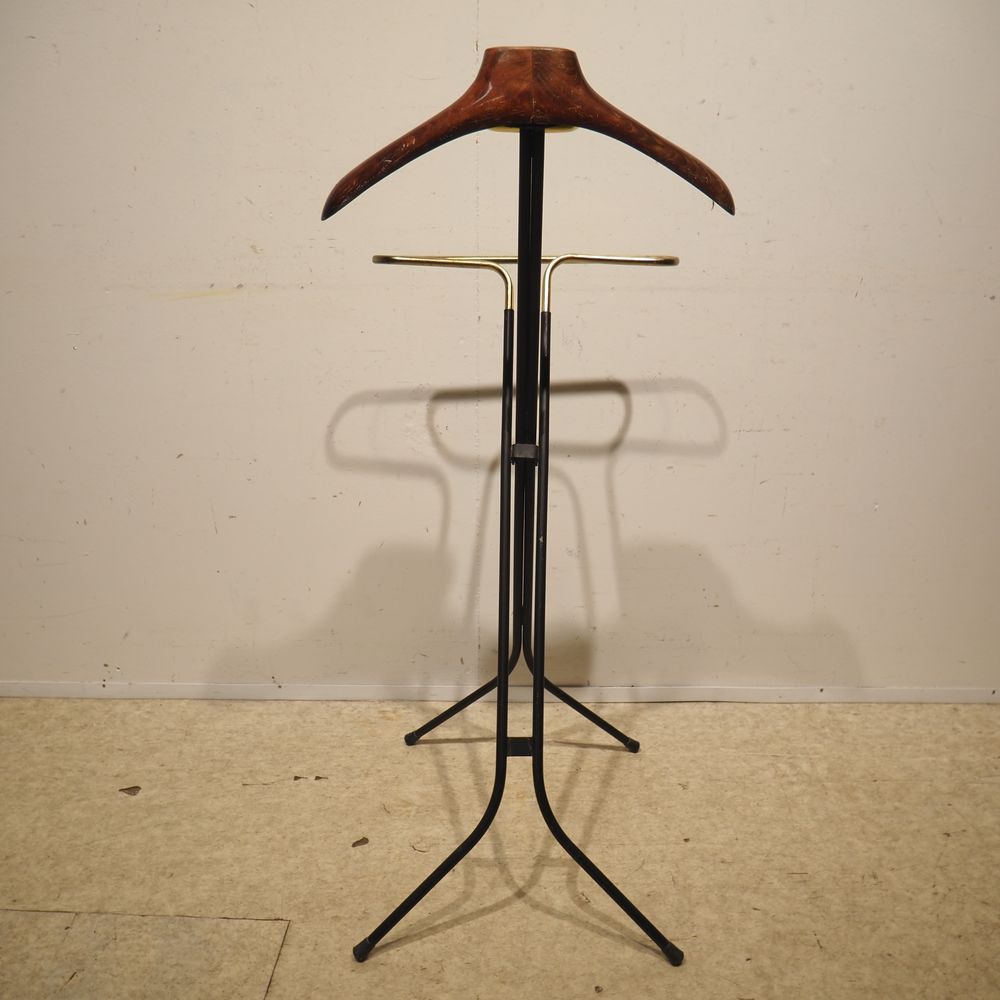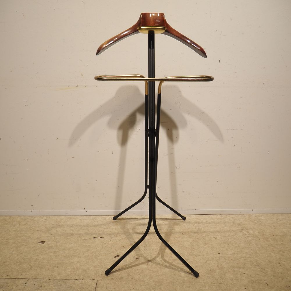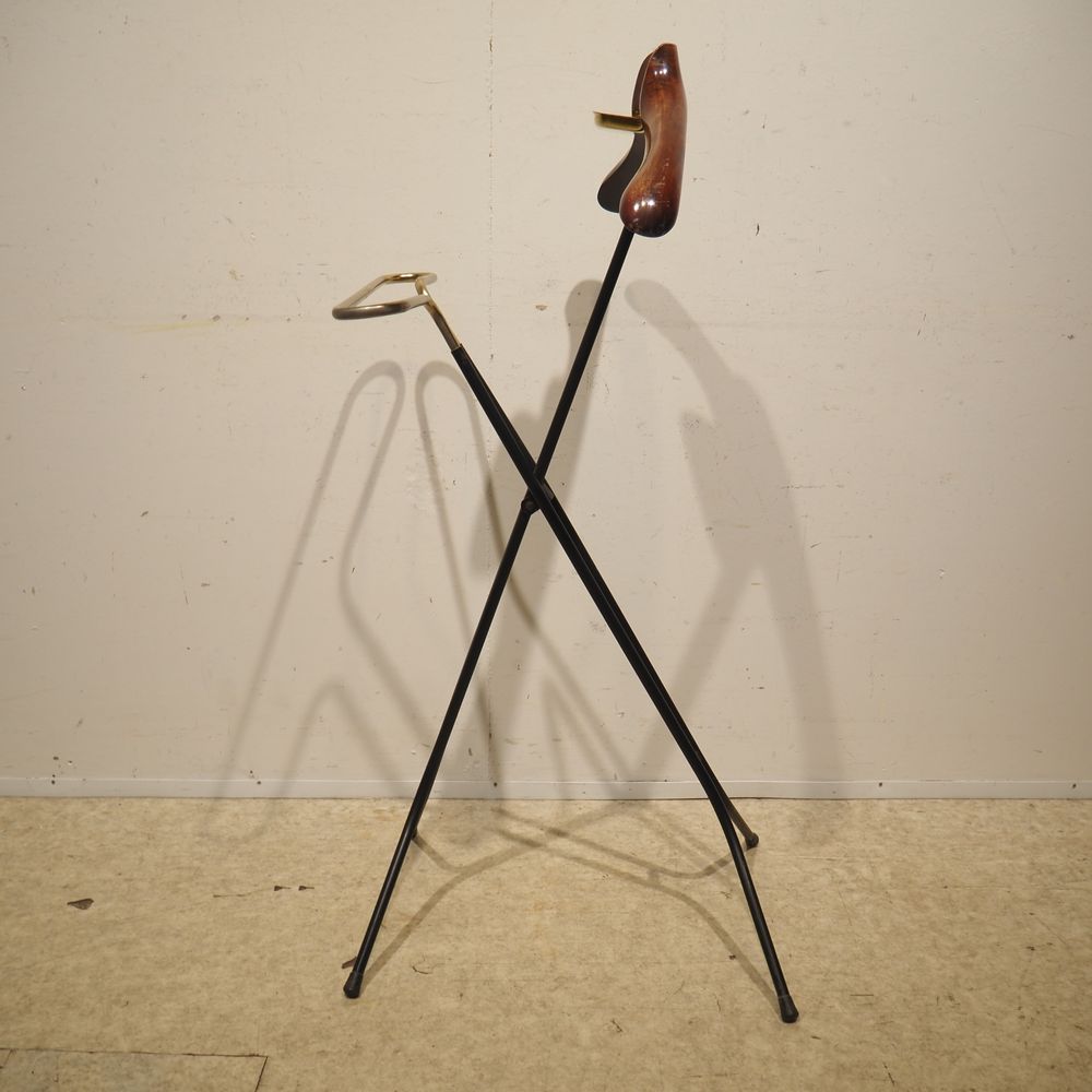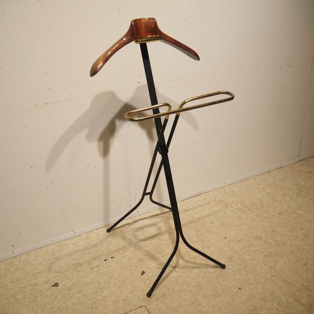 Gio Ponti dans le goût : Valet muet pliant vers 1950 cintre en bois cintré, monté su une structure tubulaire en métal cintré lacqué noir et tube de laiton, H : 107, L: 49 cm