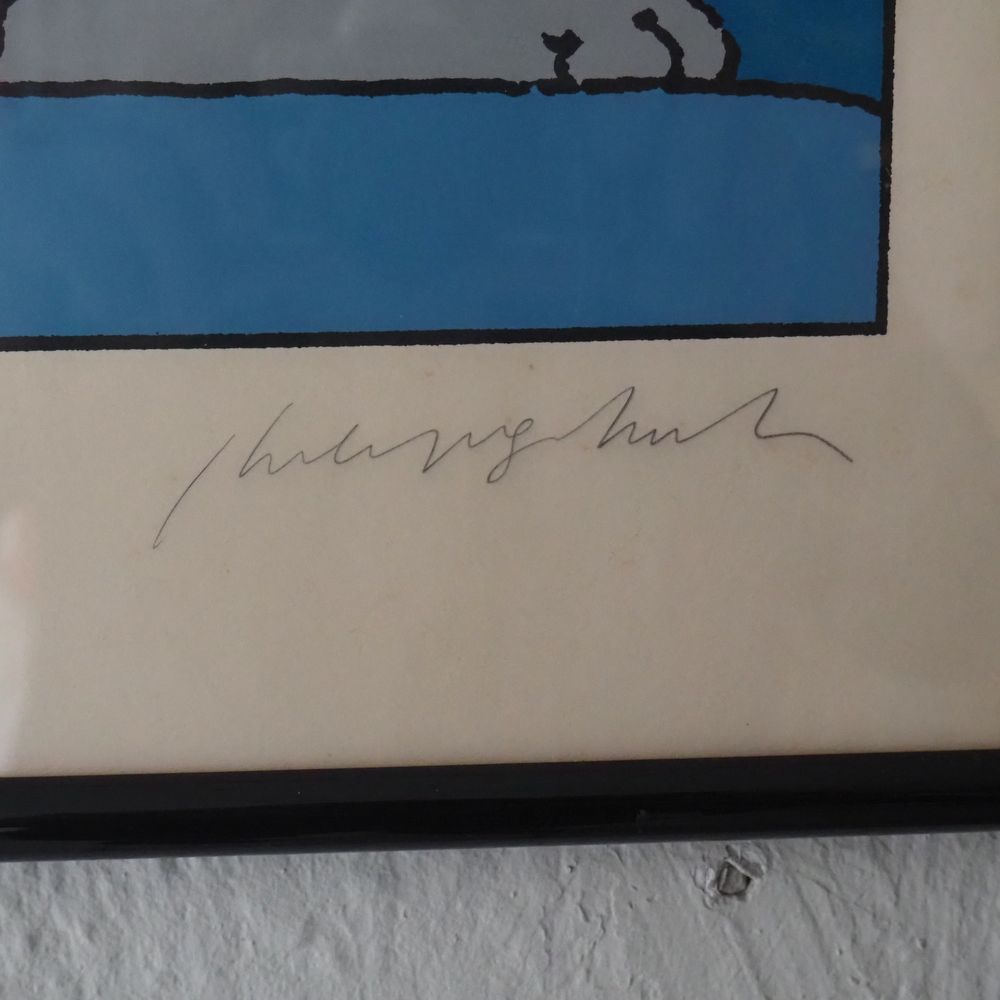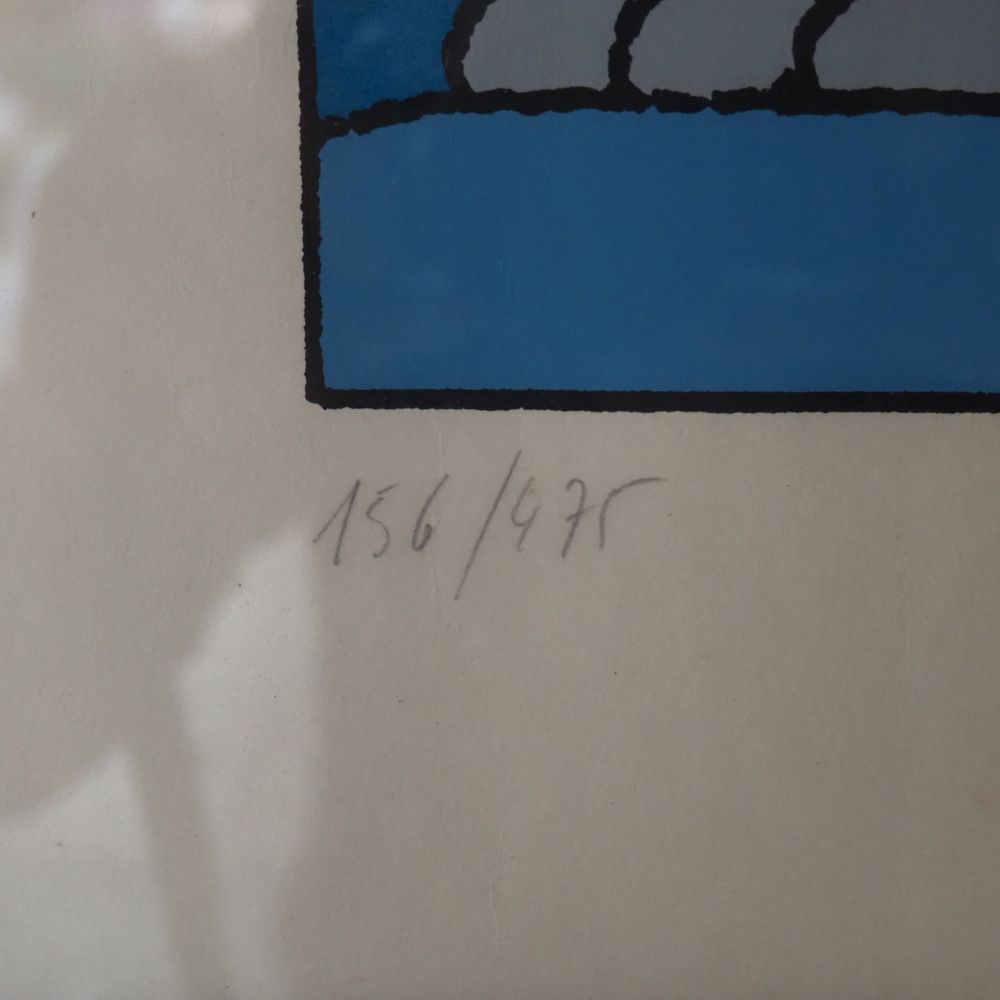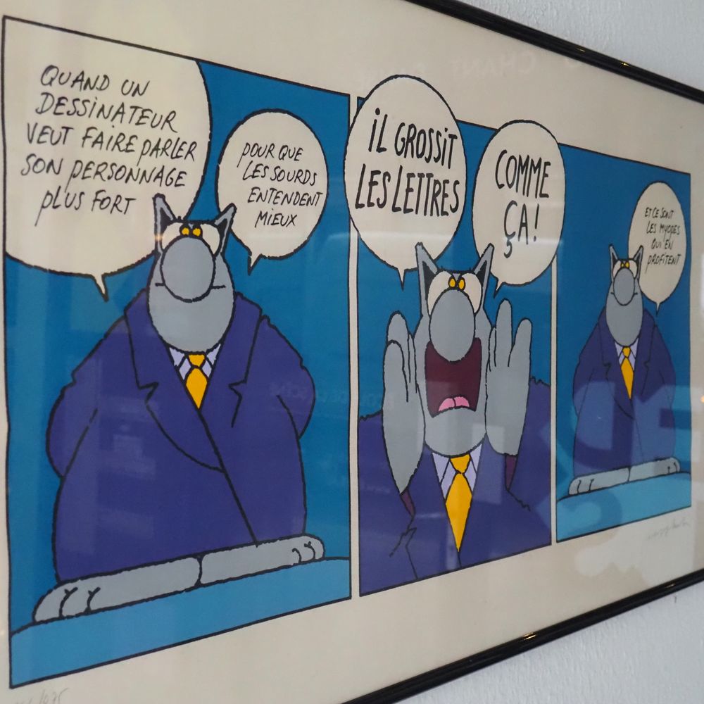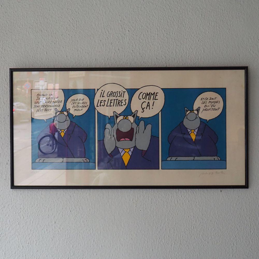 Philippe Geluck : Lithographie couleur, figurant une planche de Bande dessinée, signée au crayon dans la marge en bas à droite, numétotéee 156/475, dimension papier 50 x 100 cm, légère ondulation papier.
