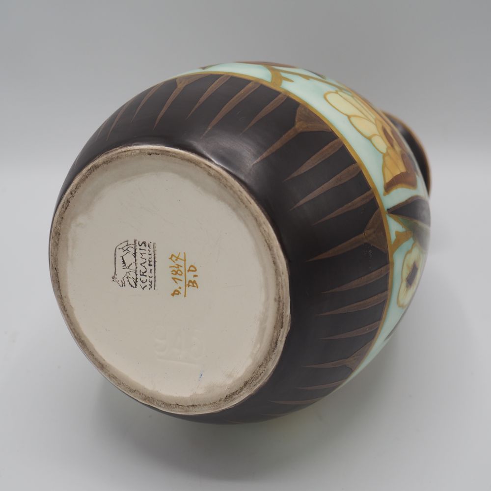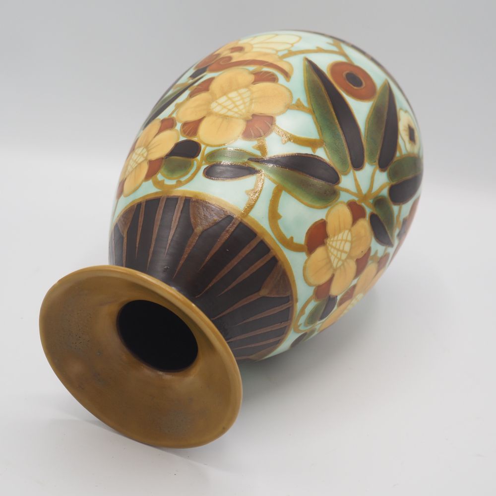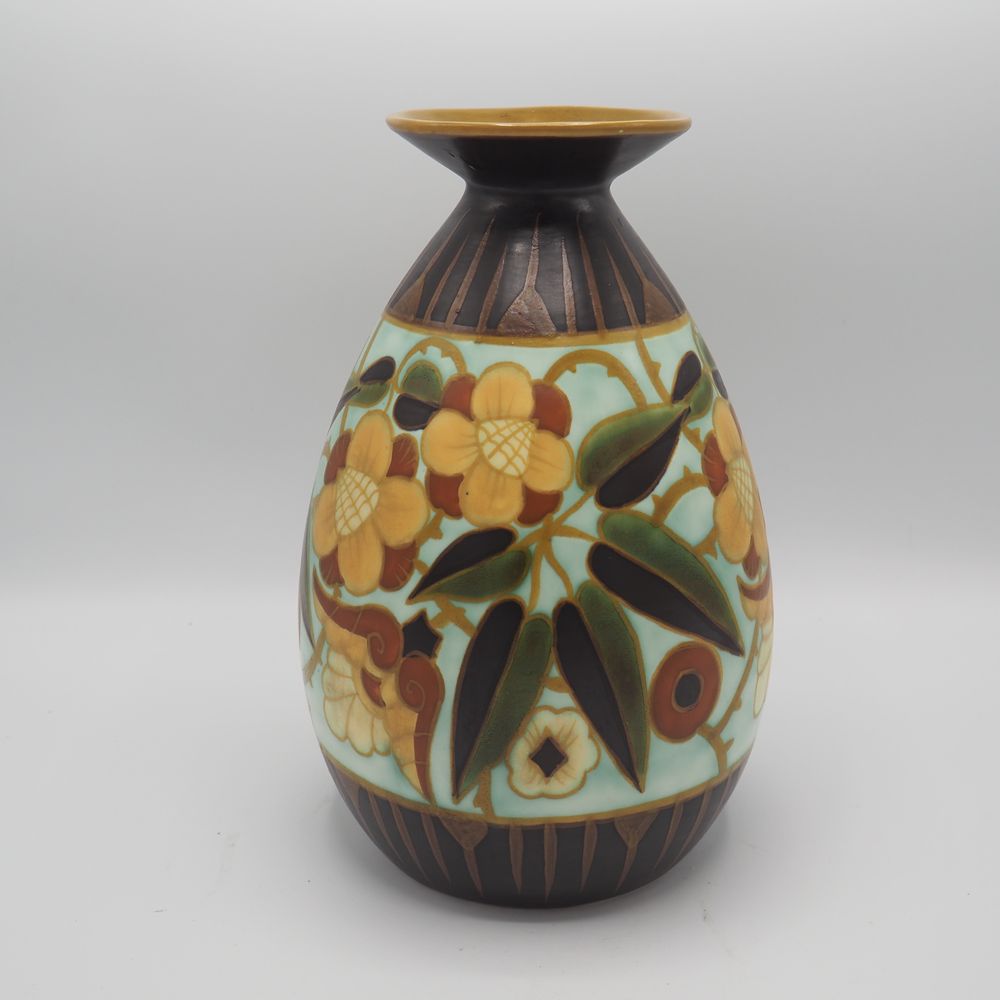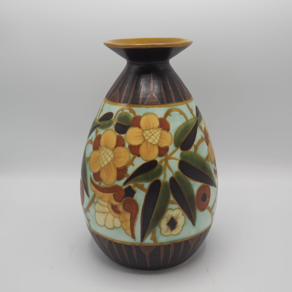 Charles Catteau (1880-1966) / Keramis : Vase ovoide 945 à col évasé, céramique émaillée, décor floral D1847 avec frise, cachet à la louve, H: 25,5, diam: 16 cm