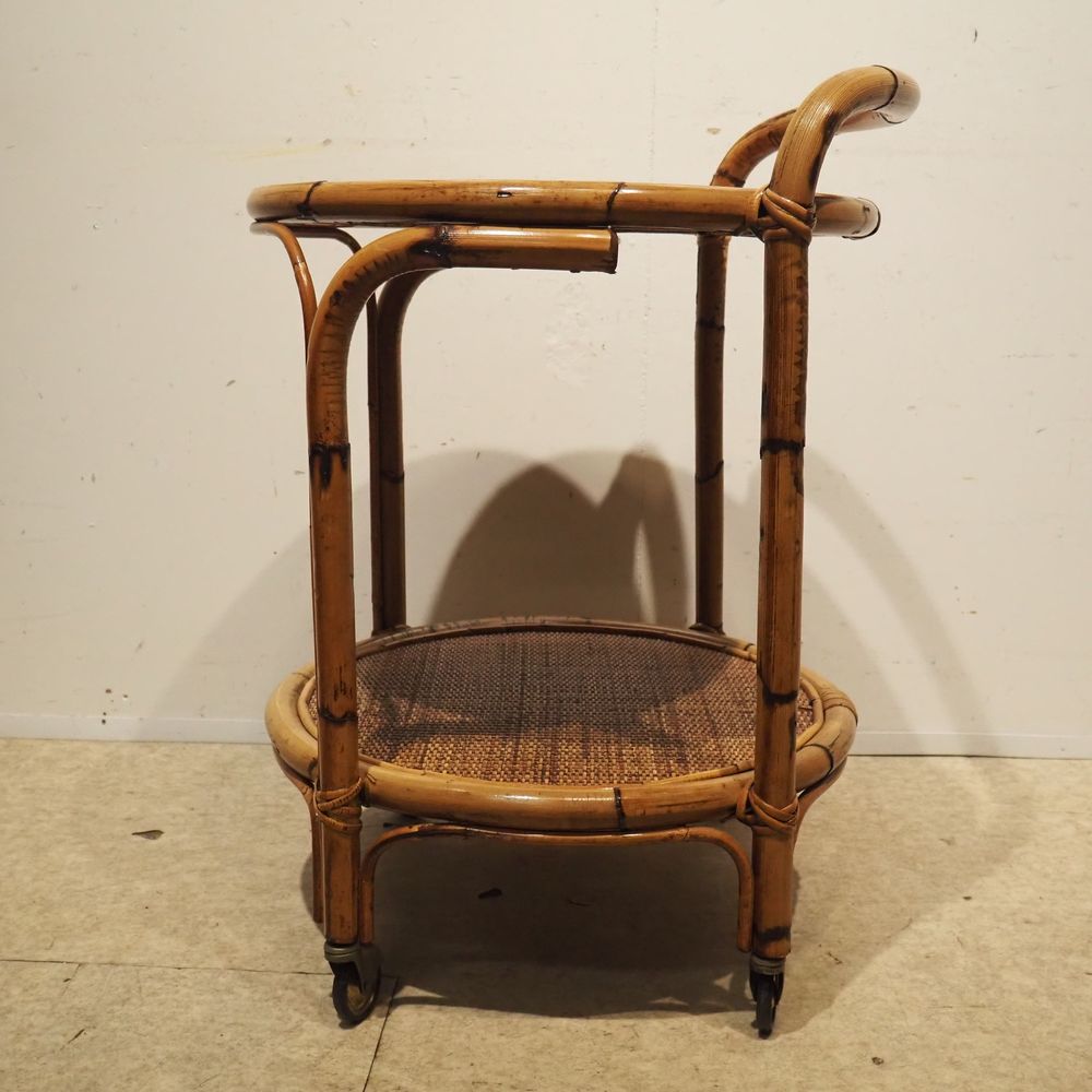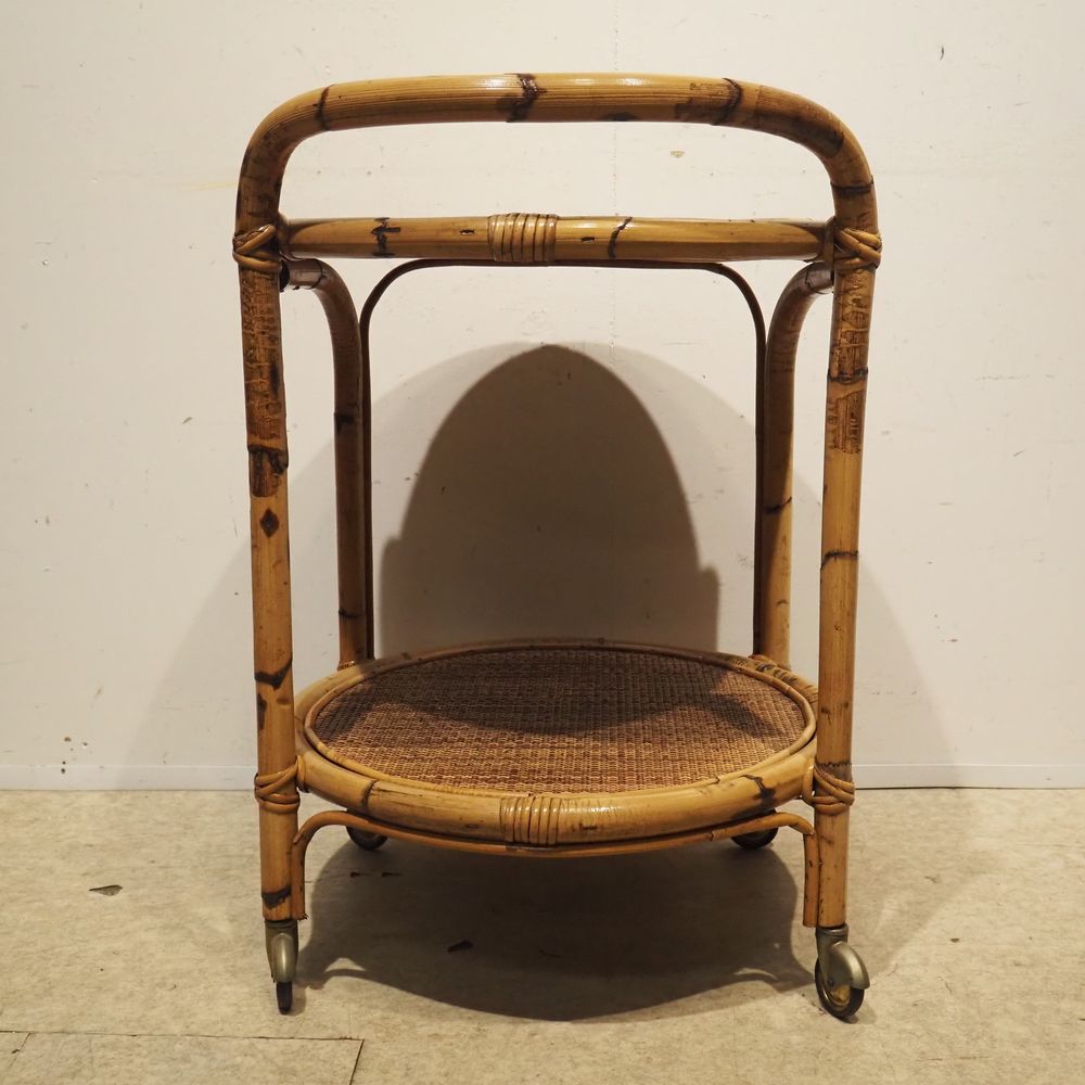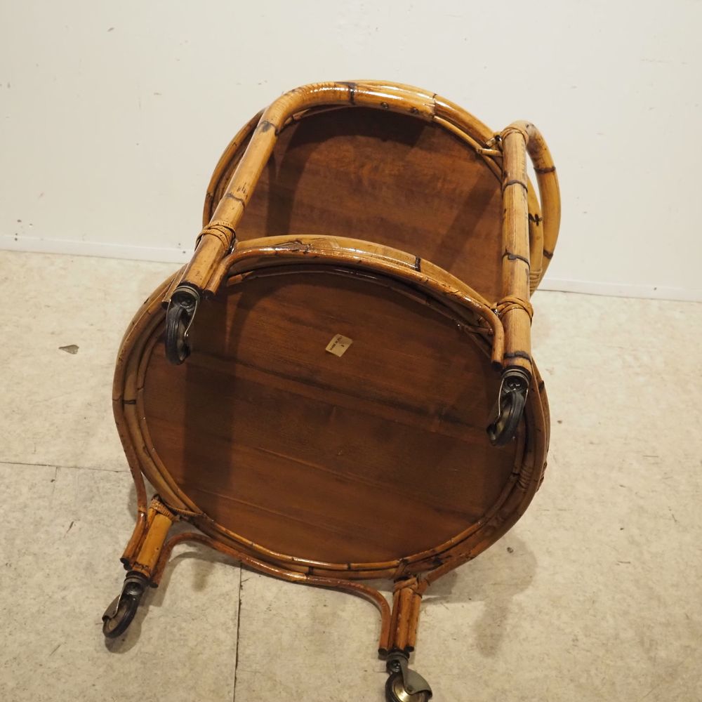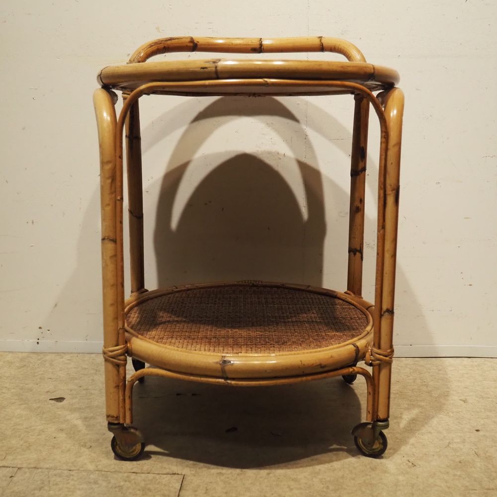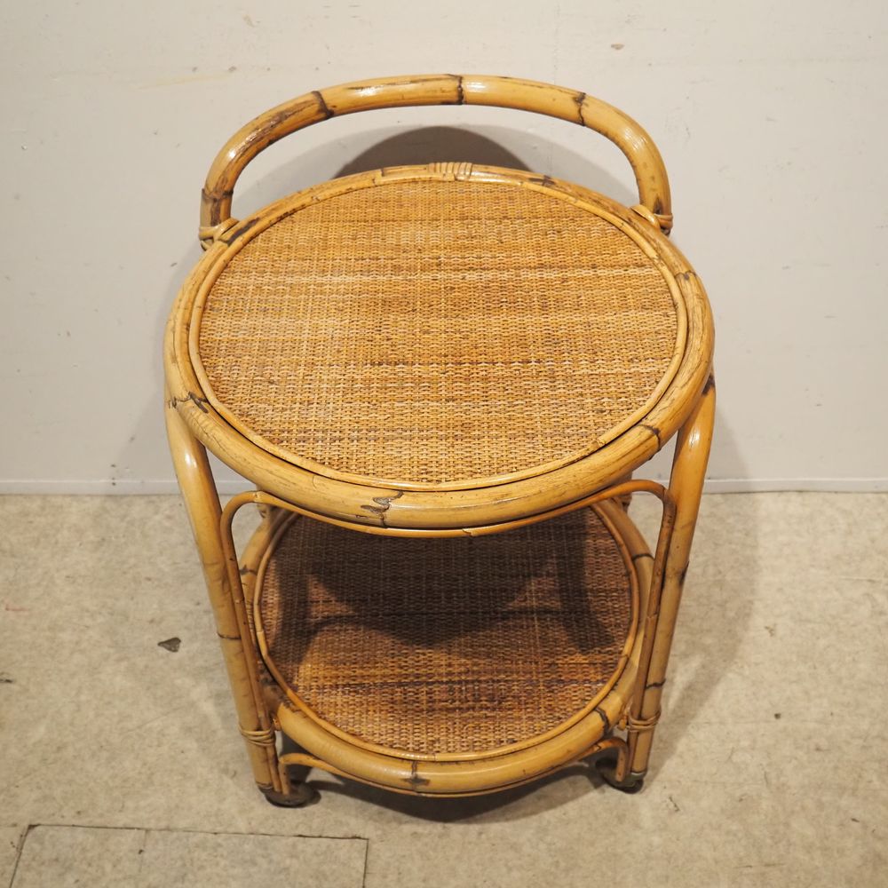 Desserte vers 1960 : 2 plateaux circulaire, strcuture en bambou cintré, gainé de moelle de rotin tressé sur 4 roulettes, H totale: 76, diam: 54 cm