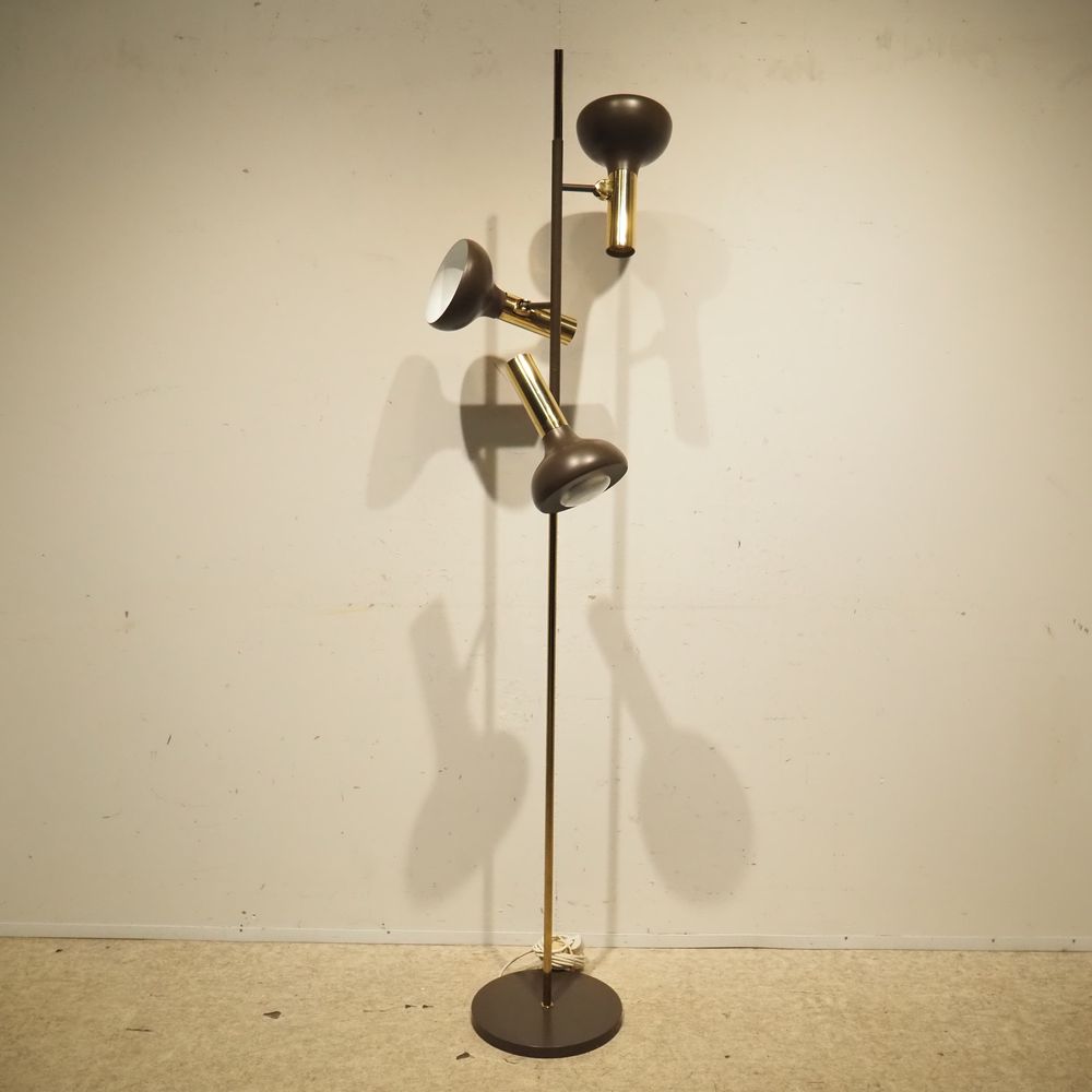 Lampadaire vers 1960 : Laiton doré et aluminium laqué marron, 3 spots orientables, pied disque, H: 175 cm