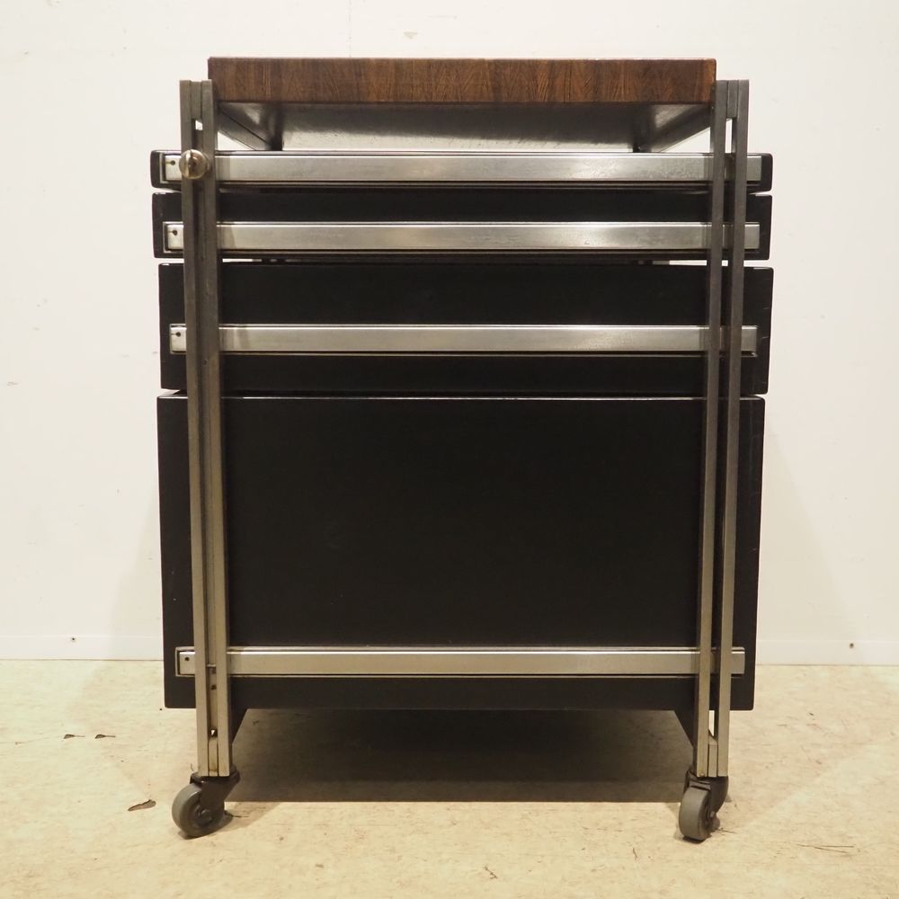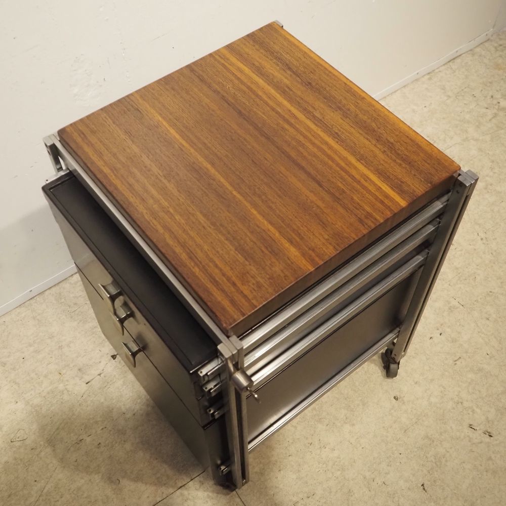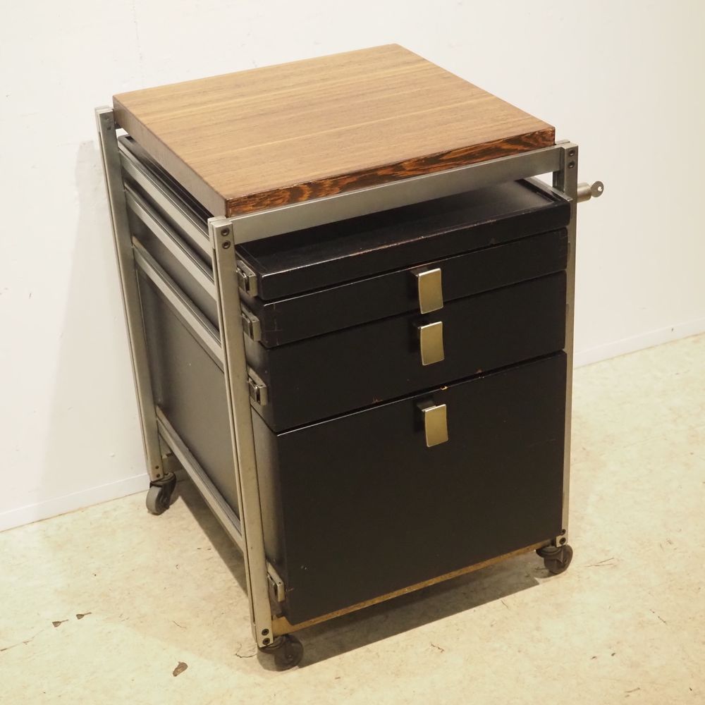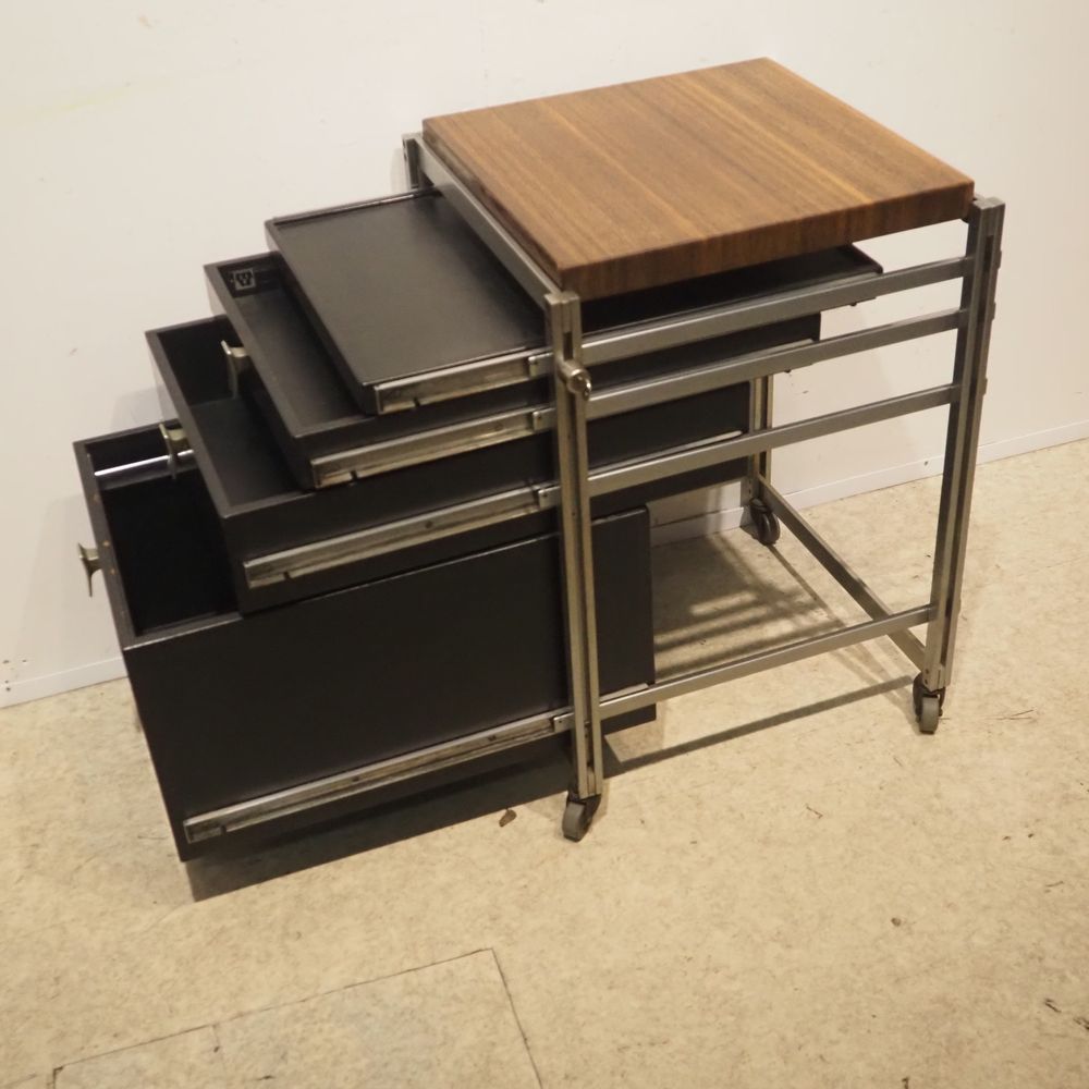 Wabbes Jules (1919-1974) / Mobilier Universel : Rare meuble de téléphone vers 1957, 1er modèle, plateau supérieur en wenge massif enchâssé dans une structure en acier plat assemblé en parallèle par vis allen (avec serrure et clé sur 4 roulettes), poignées estampillées » Wabbes », 1 tirette et 3 tiroirs en bois massif laqué noir avec coulisses, porte la petite plaquette « Mobilier International Wabbes design Belgique », très bel état d’origine. H : 67, L : 46, P : 52 cm