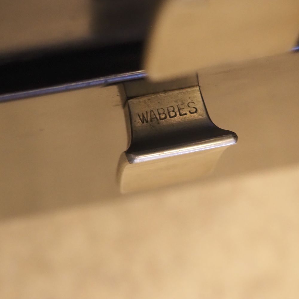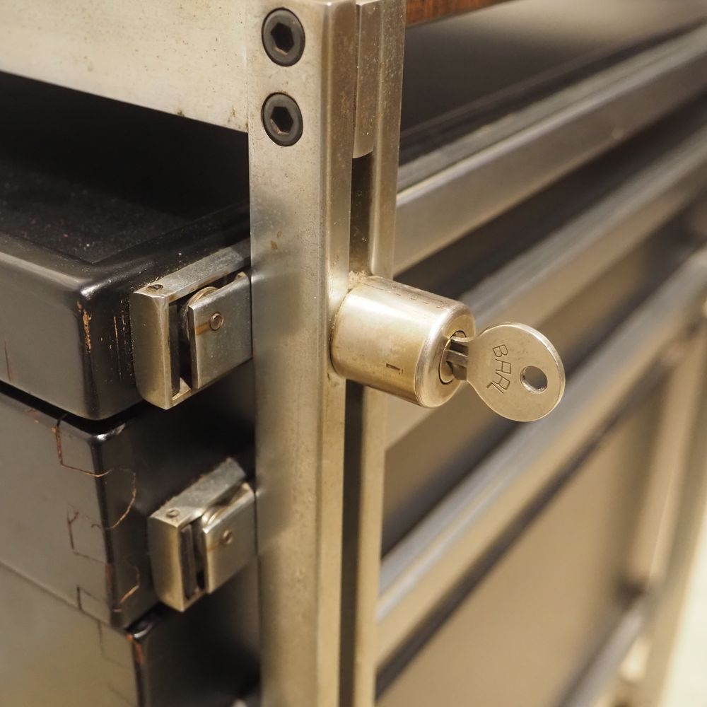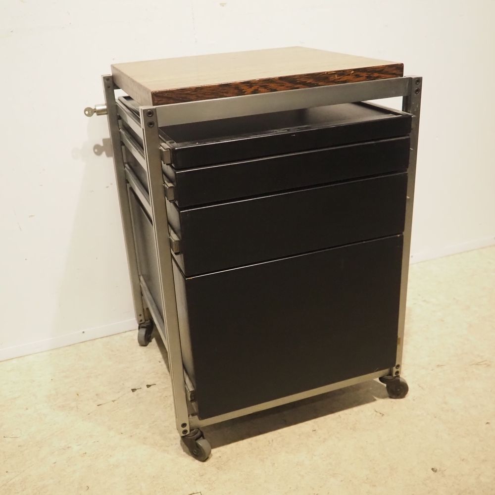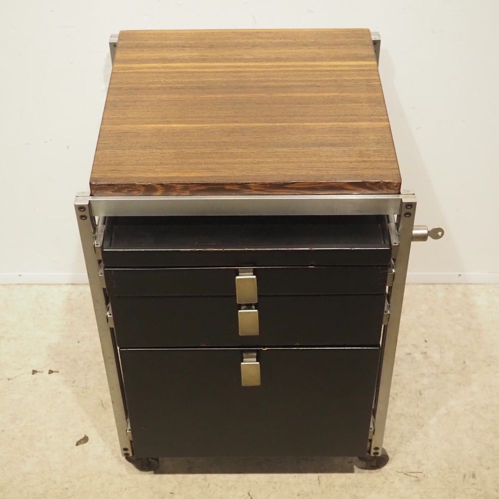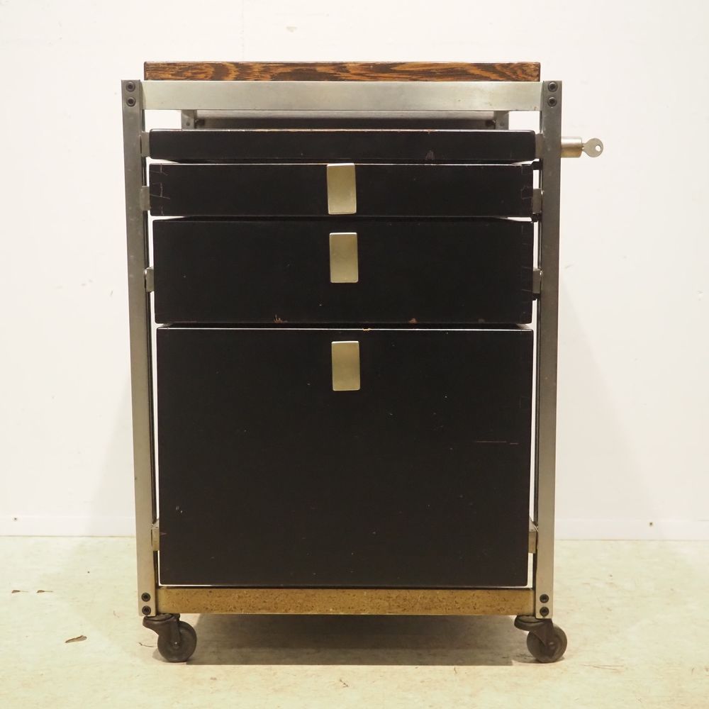 Wabbes Jules (1919-1974) / Mobilier Universel : Rare meuble de téléphone vers 1957, 1er modèle, plateau supérieur en wenge massif enchâssé dans une structure en acier plat assemblé en parallèle par vis allen (avec serrure et clé sur 4 roulettes), poignées estampillées » Wabbes », 1 tirette et 3 tiroirs en bois massif laqué noir avec coulisses, porte la petite plaquette « Mobilier International Wabbes design Belgique », très bel état d’origine. H : 67, L : 46, P : 52 cm