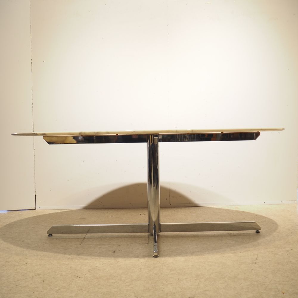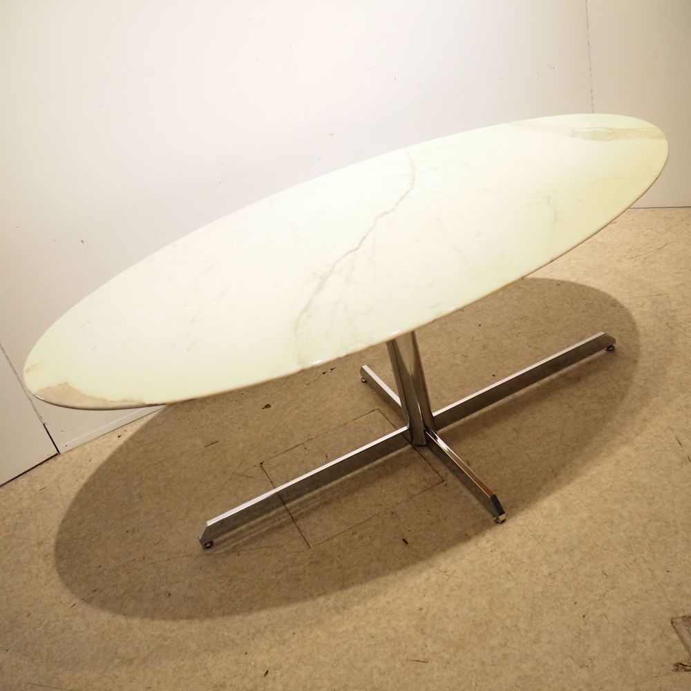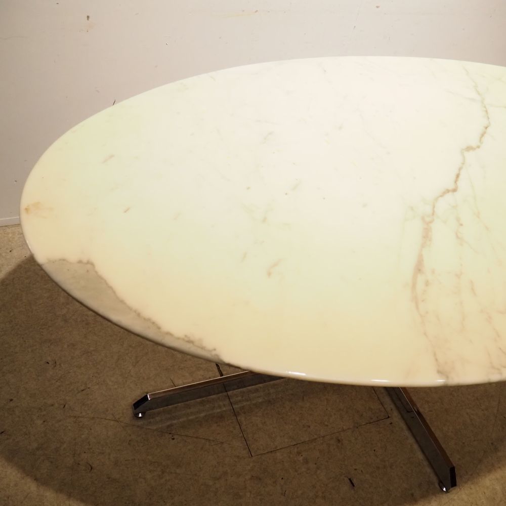 Roche Bobois Provenance : Table haute style Florence Knoll, plateau élliptical en marbre de carrare blanc veiné gris et biseauté sur un pied en tube d’acier chromé formant fut cylindrique et pied croix, vernis légèrement jaunis, étiquette Roche Bobois sous le plateau, H: 72,5, L: 185, P: 105 cm