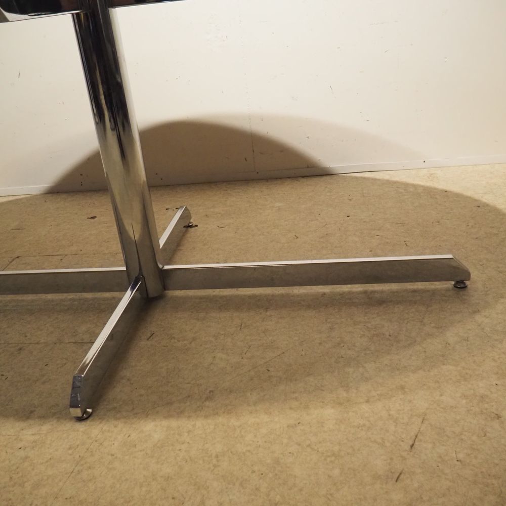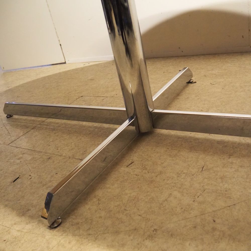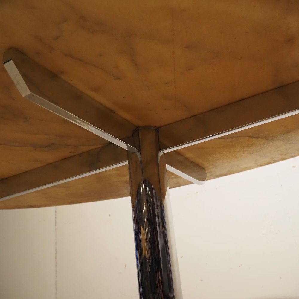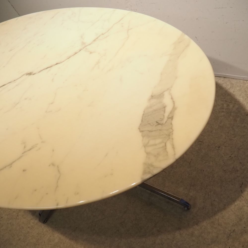 Roche Bobois Provenance : Table haute style Florence Knoll, plateau élliptical en marbre de carrare blanc veiné gris et biseauté sur un pied en tube d’acier chromé formant fut cylindrique et pied croix, vernis légèrement jaunis, étiquette Roche Bobois sous le plateau, H: 72,5, L: 185, P: 105 cm