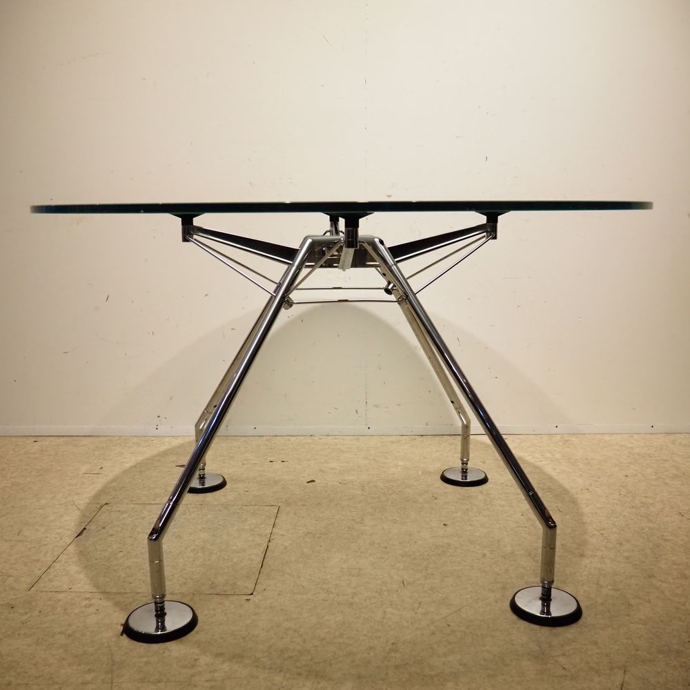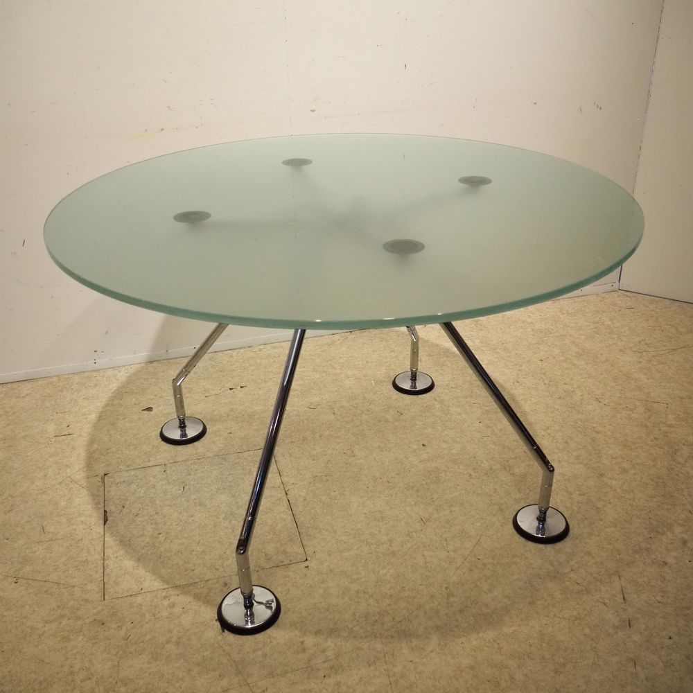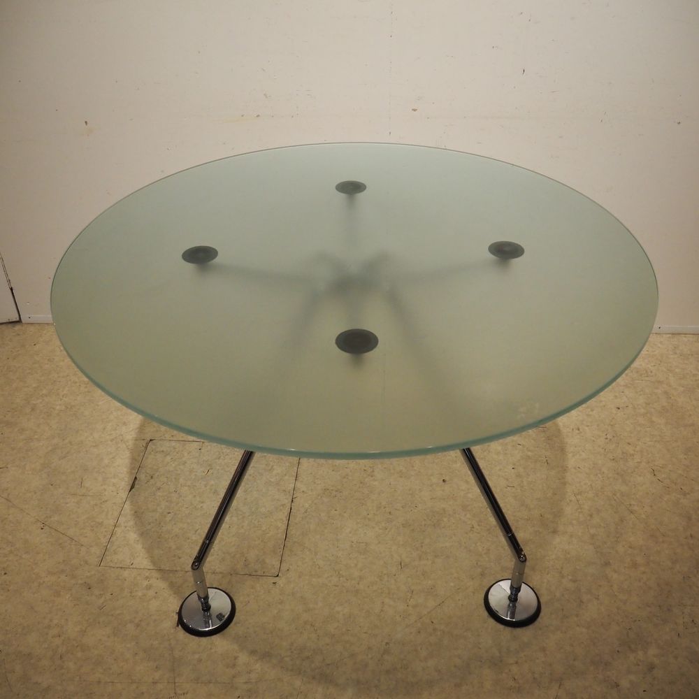 Norman Foster (1935) / Tecno : Table, modèle Nomos, année 1986, plateau circulaire en verre sablé, piétement quadripode en aluminium chromé avec patins circulaires, Hauteur réglable: 66/72, diam: 120 cm