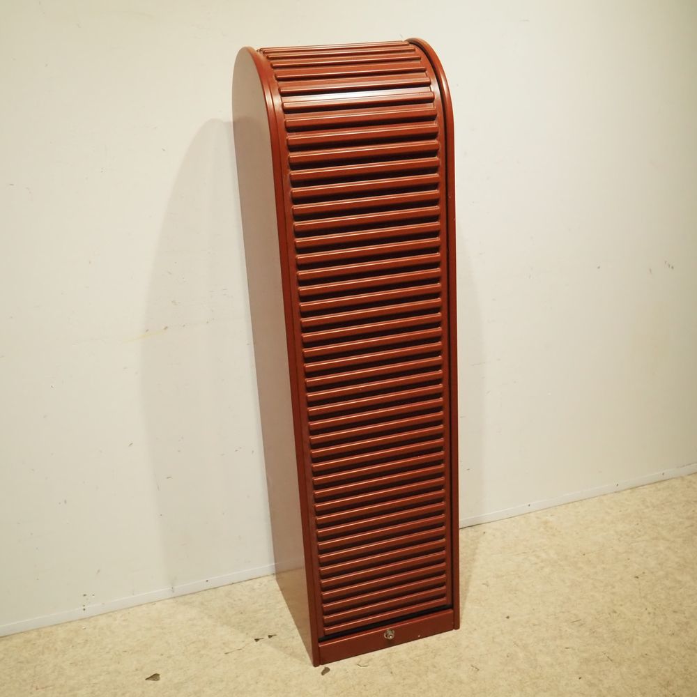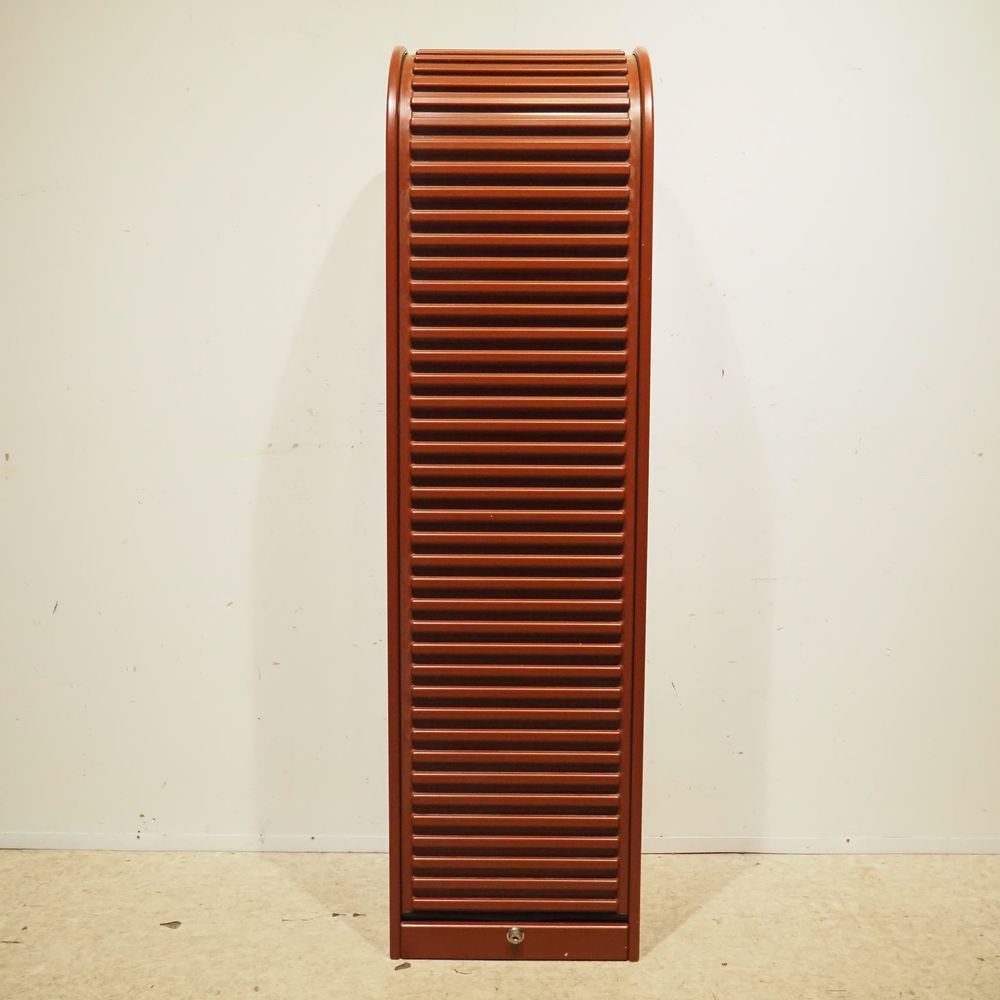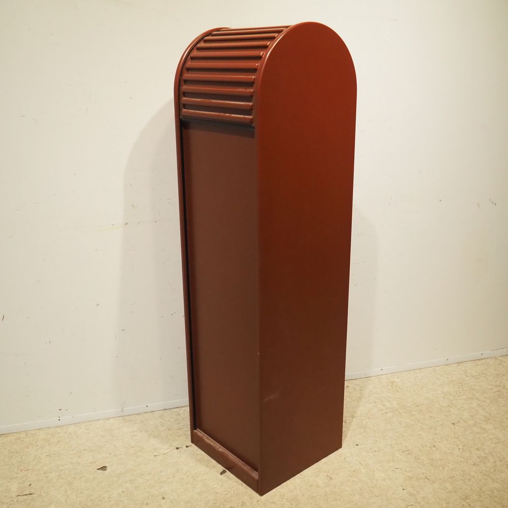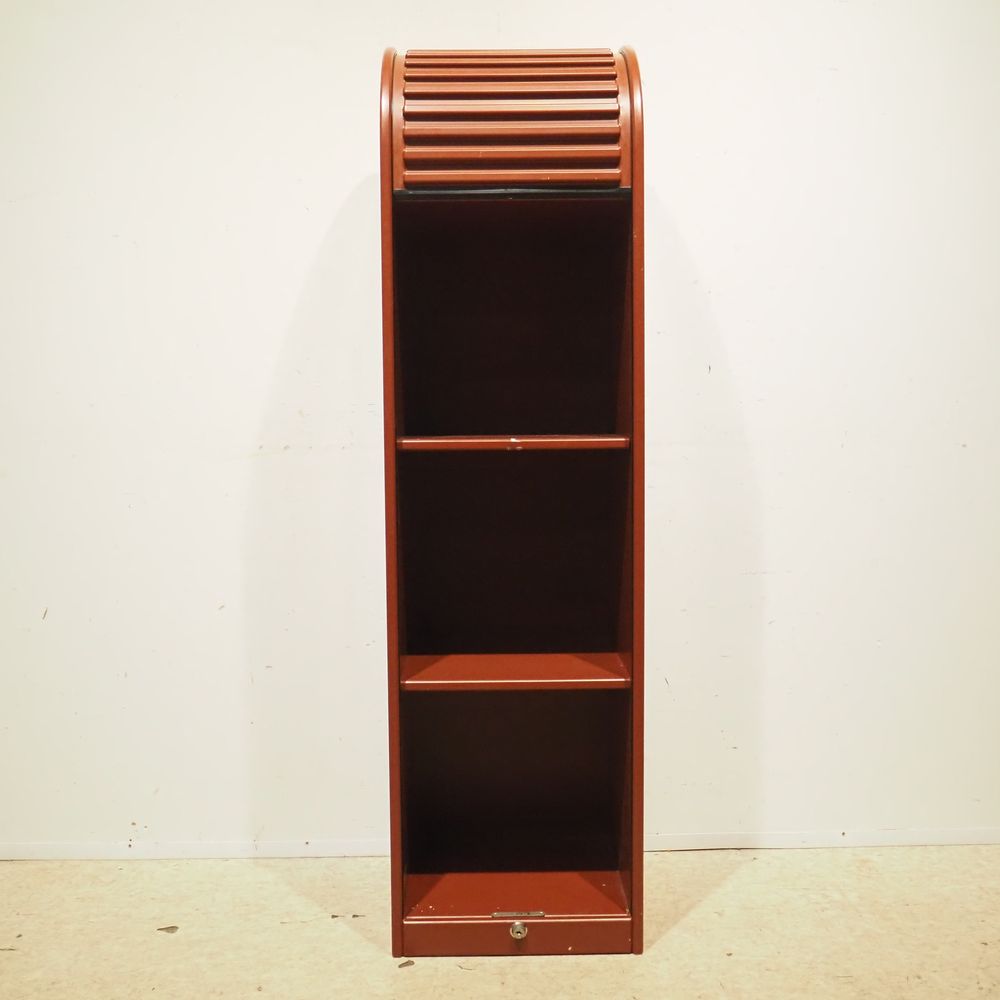 Aldo Van de Nieuwelaar (1944-2010) / Pastoe : Etagère/Bibliothèque, modèle « Amsterdammer », dessiné en 1978, aggloméré laqué bordeaux, composé de 3 compartiments, volet coulissant en plastique moulé ondulé couleur bordeaux, H: 135, L: 37, P: 37 cm