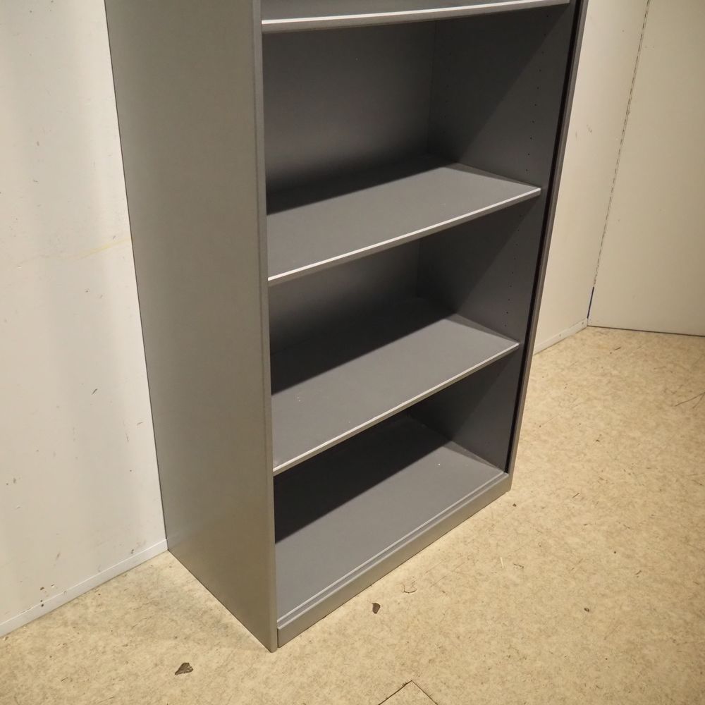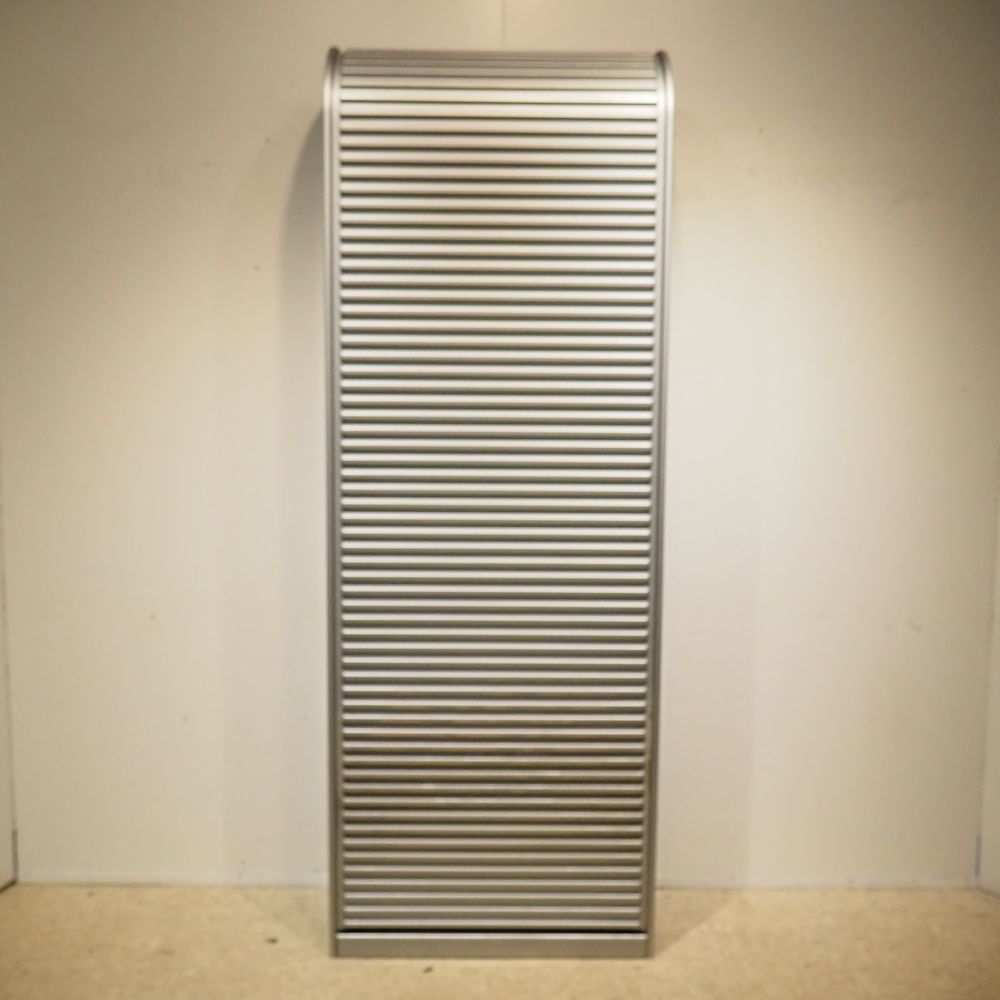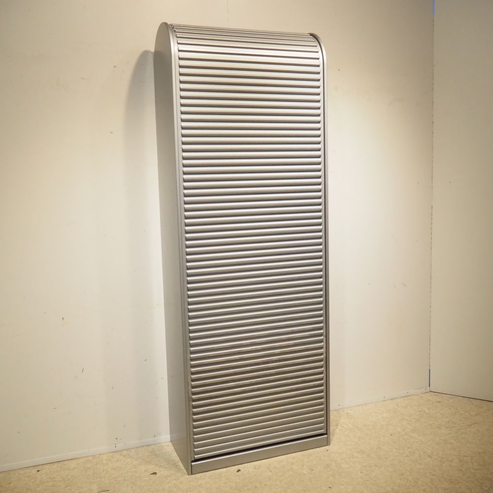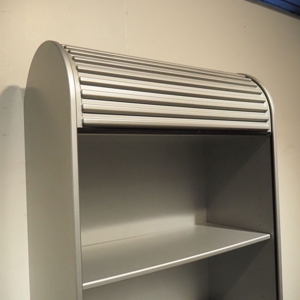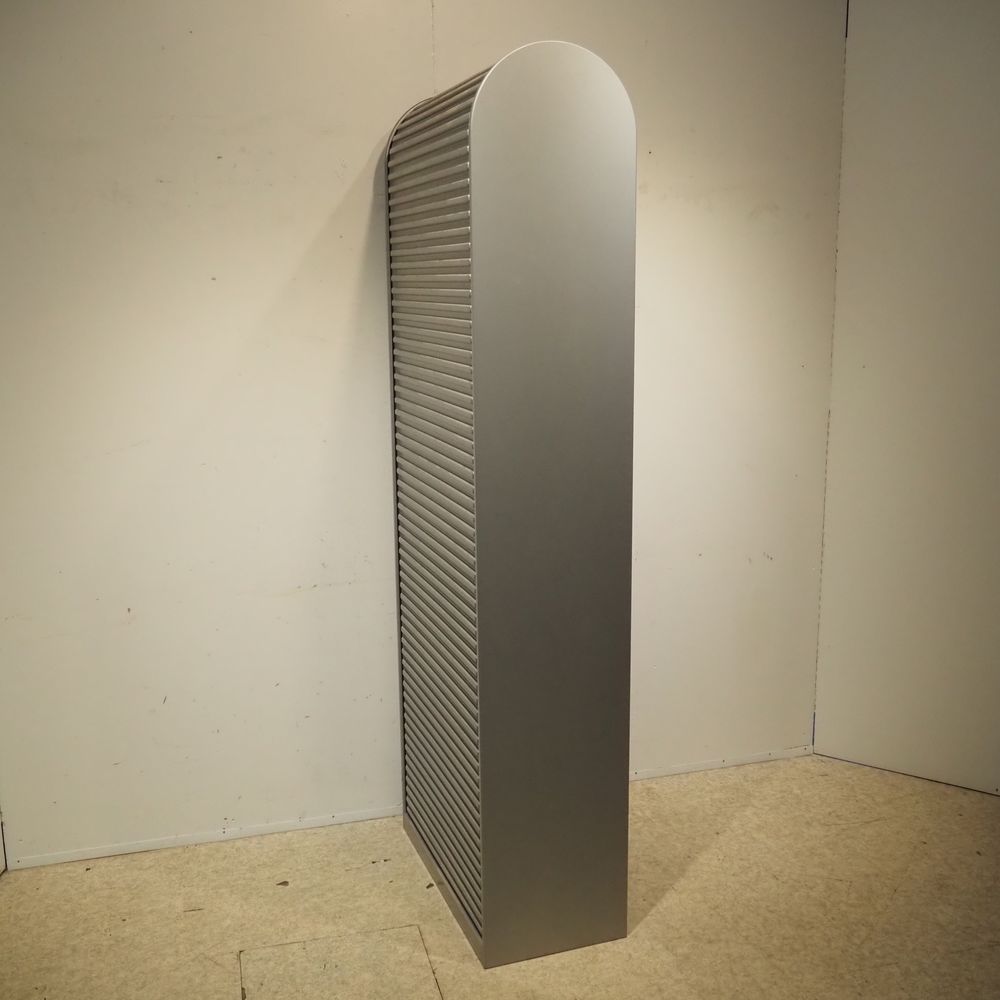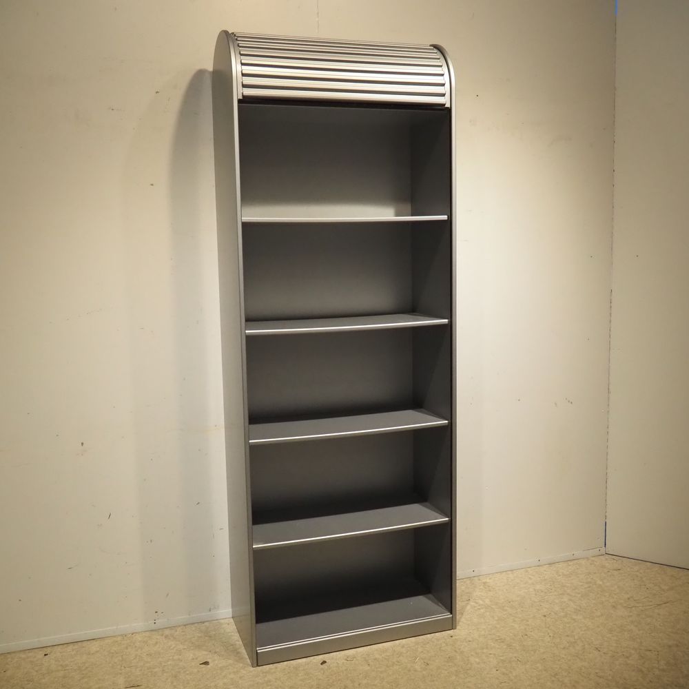 Aldo Van de Nieuwelaar (1944-2010) / Pastoe : Etagère/Bibliothèque, modèle « Amsterdammer », dessiné en 1978, aggloméré laqué gris métallisé, volet coulissant en plastique moulé ondulé couleur gris métallisé, H: 205, L: 74, P: 37 cm