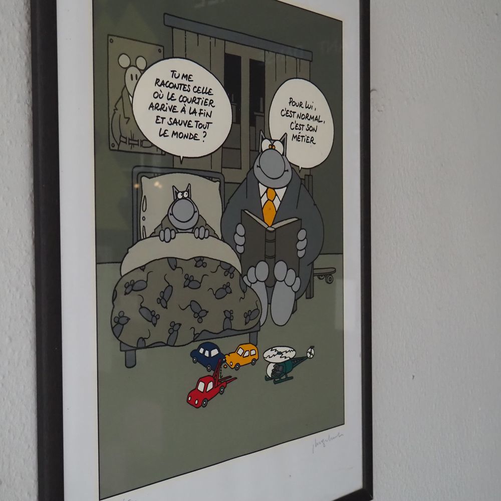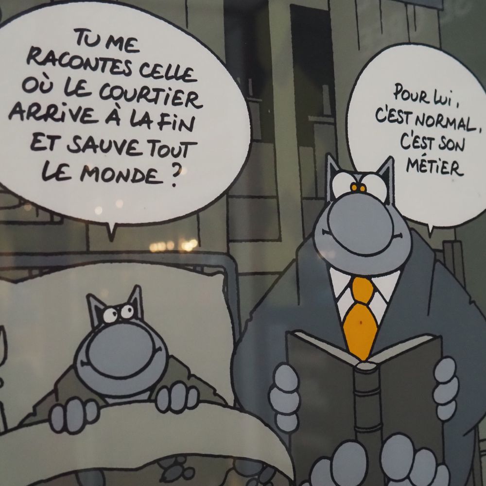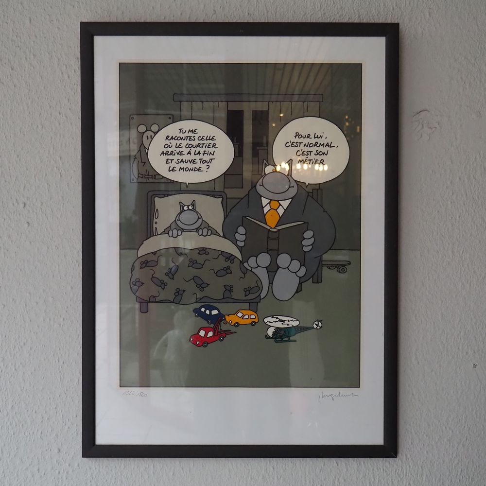 Philippe Geluck (1954) : Lithographie couleur, figurant une planche de Bande dessinée, signée au crayon dans la marge en bas à droite, numérotée 1332/1500, dimension image: 55 x 41 cm, dim papier: 70 x 50 cm