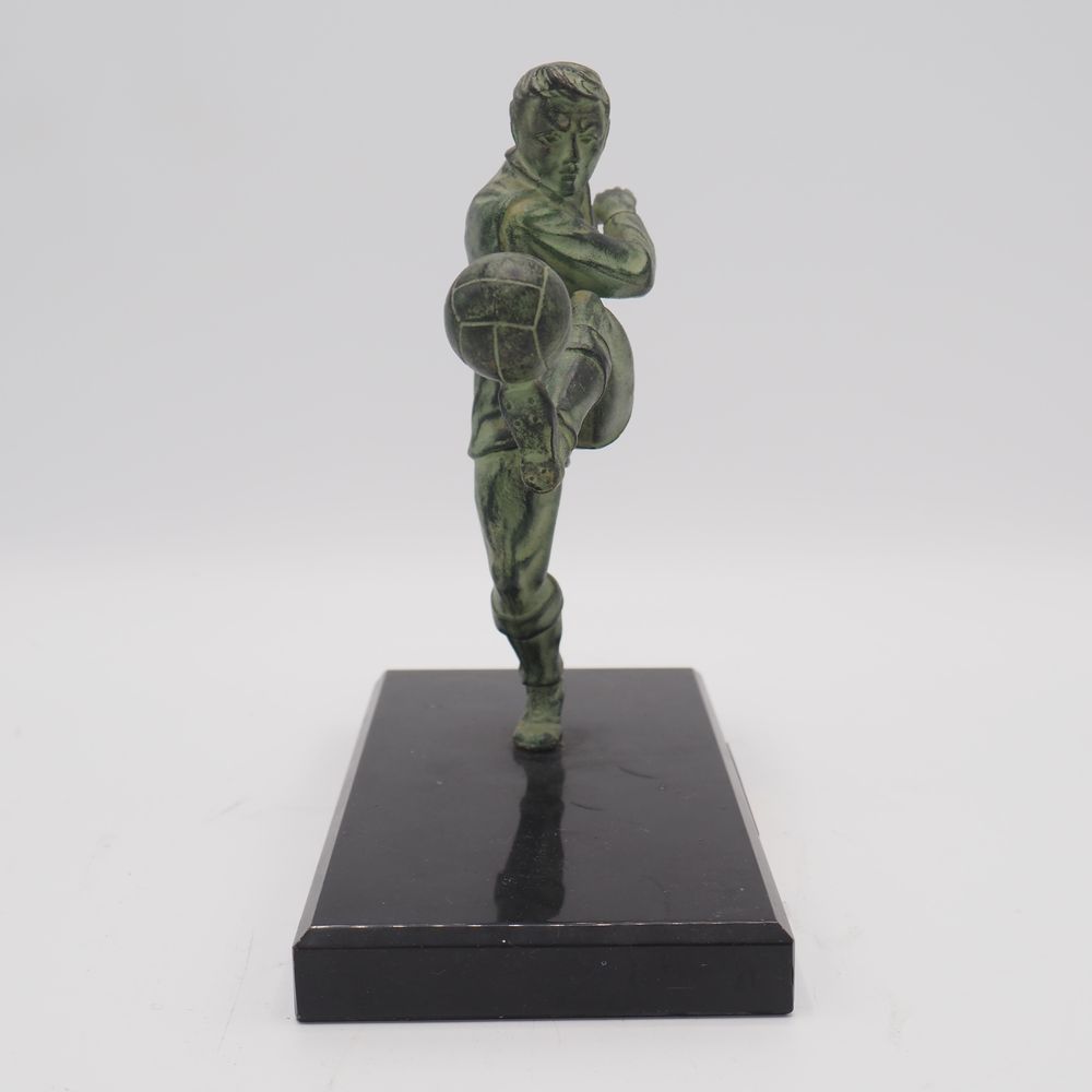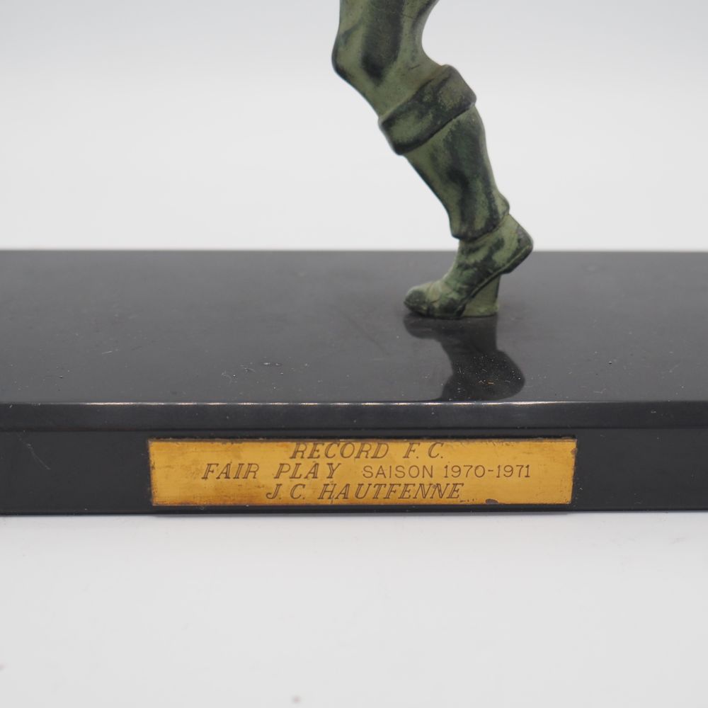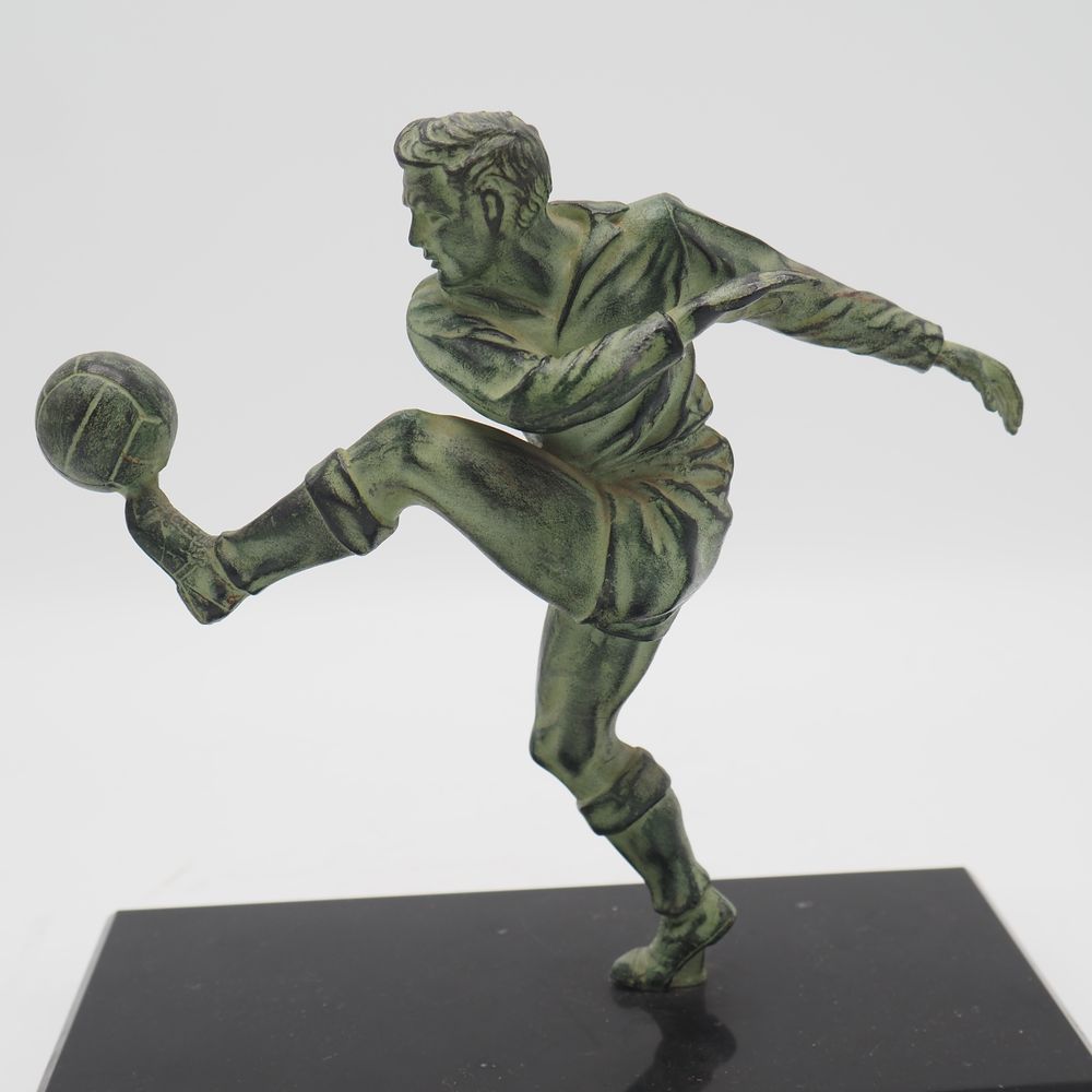 JC Hautfenne : Sculpture, régule à patine verte, figurant un footballeur, sur socle de marbre noir, H sans socle: 17, L: 18 cm