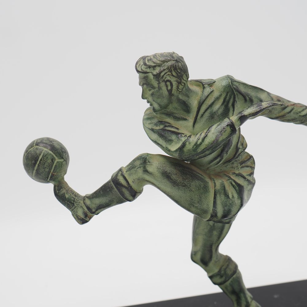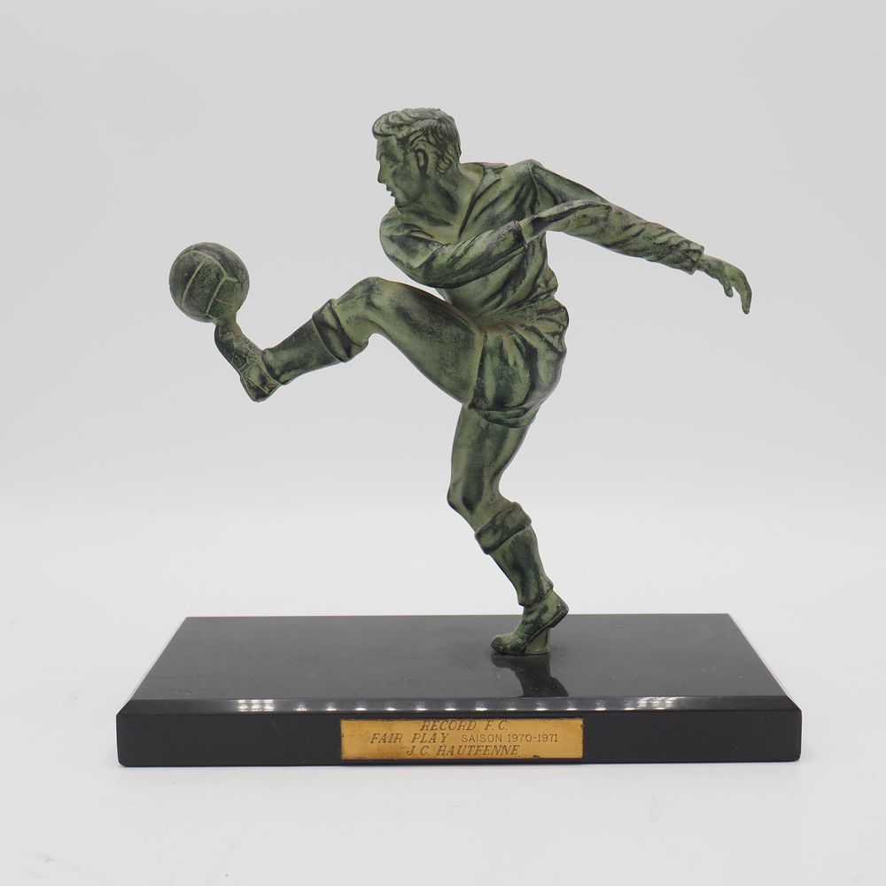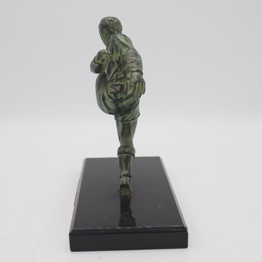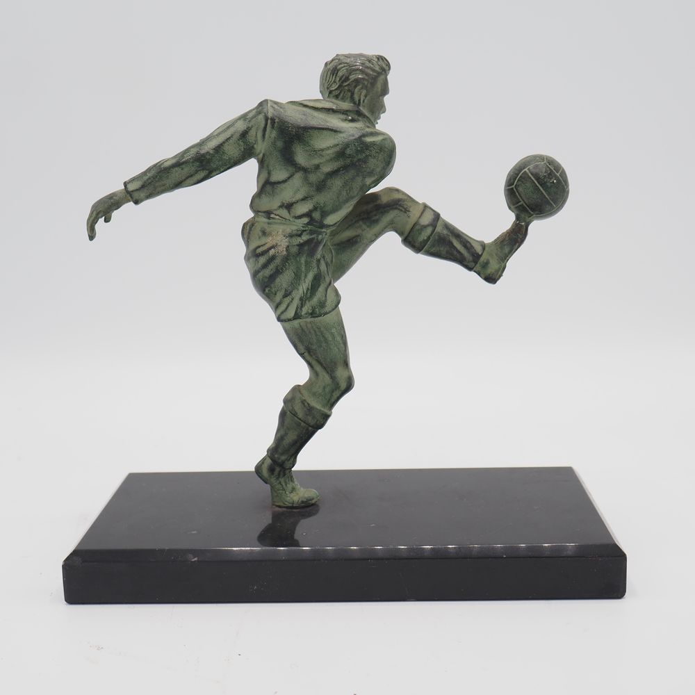 JC Hautfenne : Sculpture, régule à patine verte, figurant un footballeur, sur socle de marbre noir, H sans socle: 17, L: 18 cm