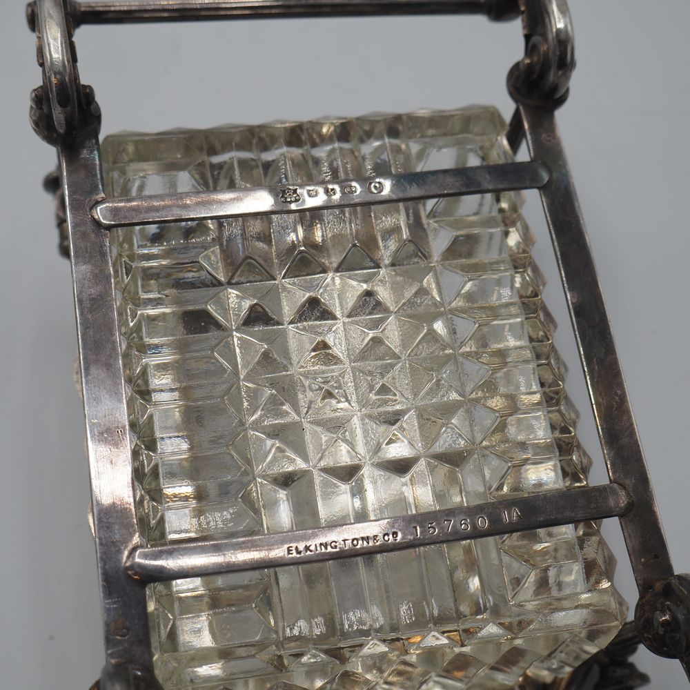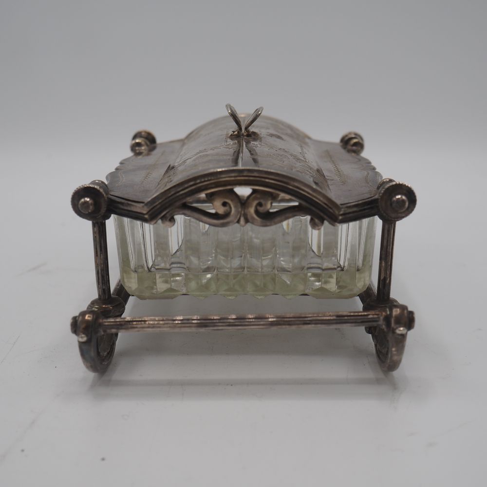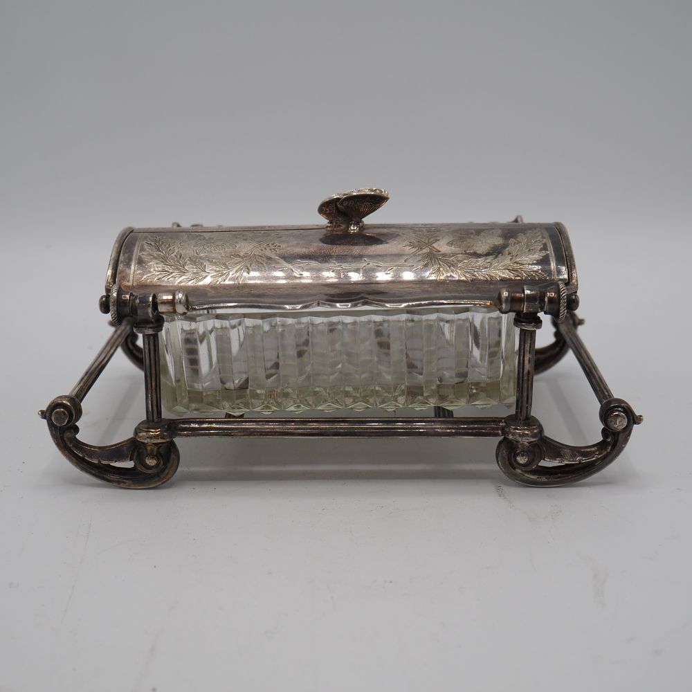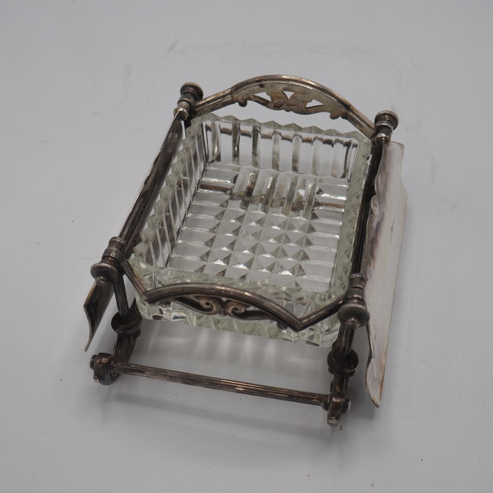 Beurrier en forme de traineau vers 1900 : Métal argenté, fretel avec papillon, poinçons sous la base, H: 8,5, L: 18, P: 11 cm