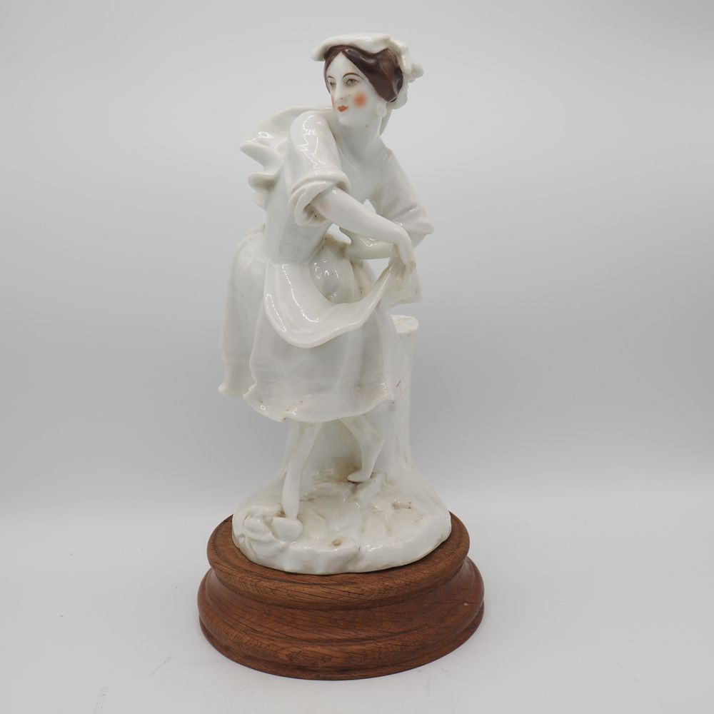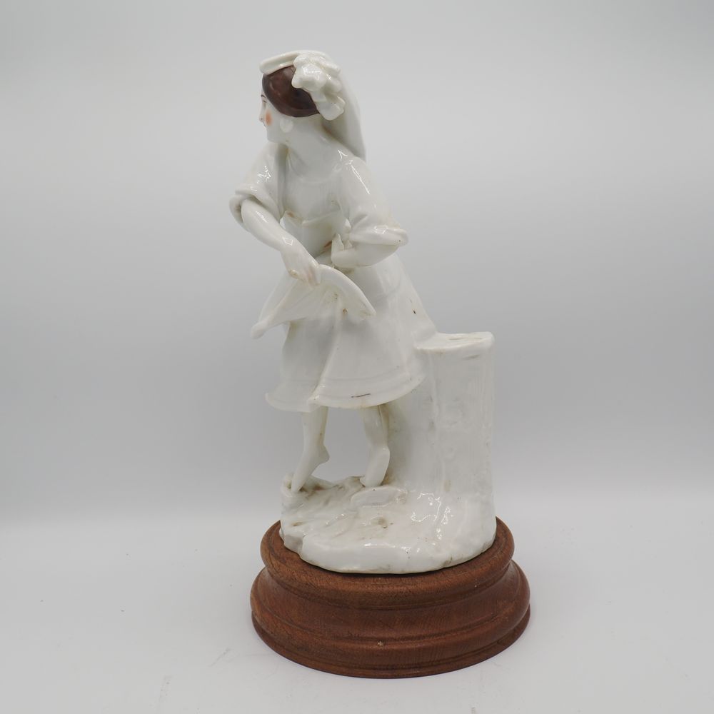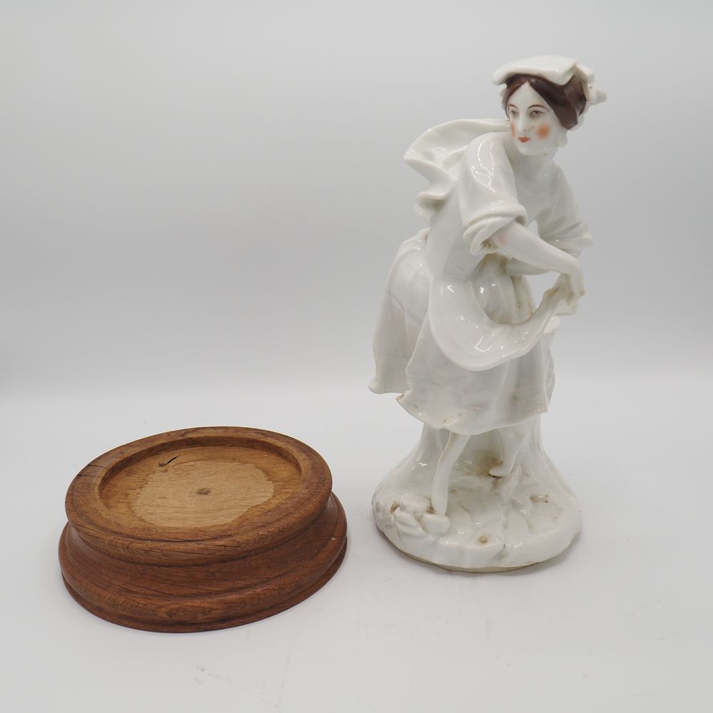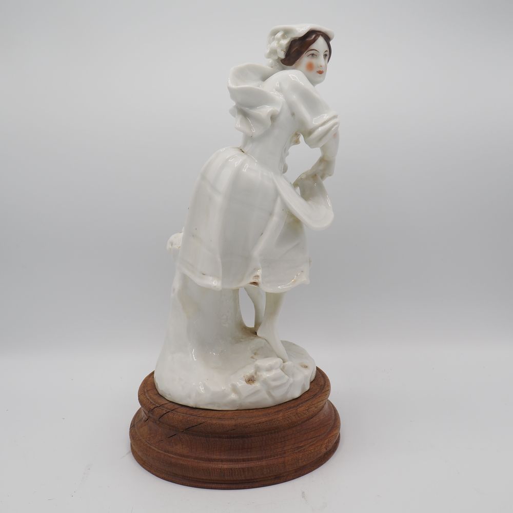 Vieille Andenne : Statuette fin 19eS, porcelaine émaillée, figurant une jeune dame, sur scole de bois, H totale: 34, diam socle: 18 cm