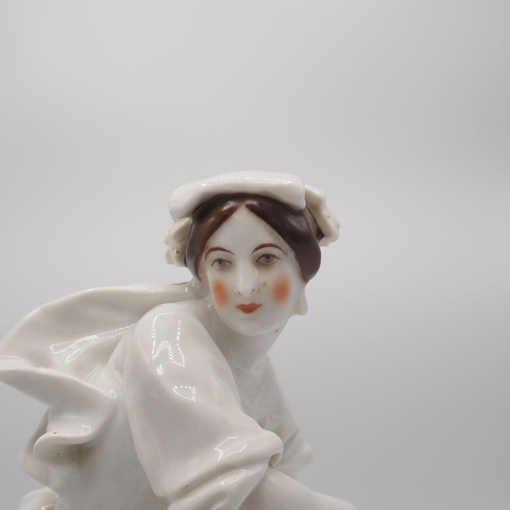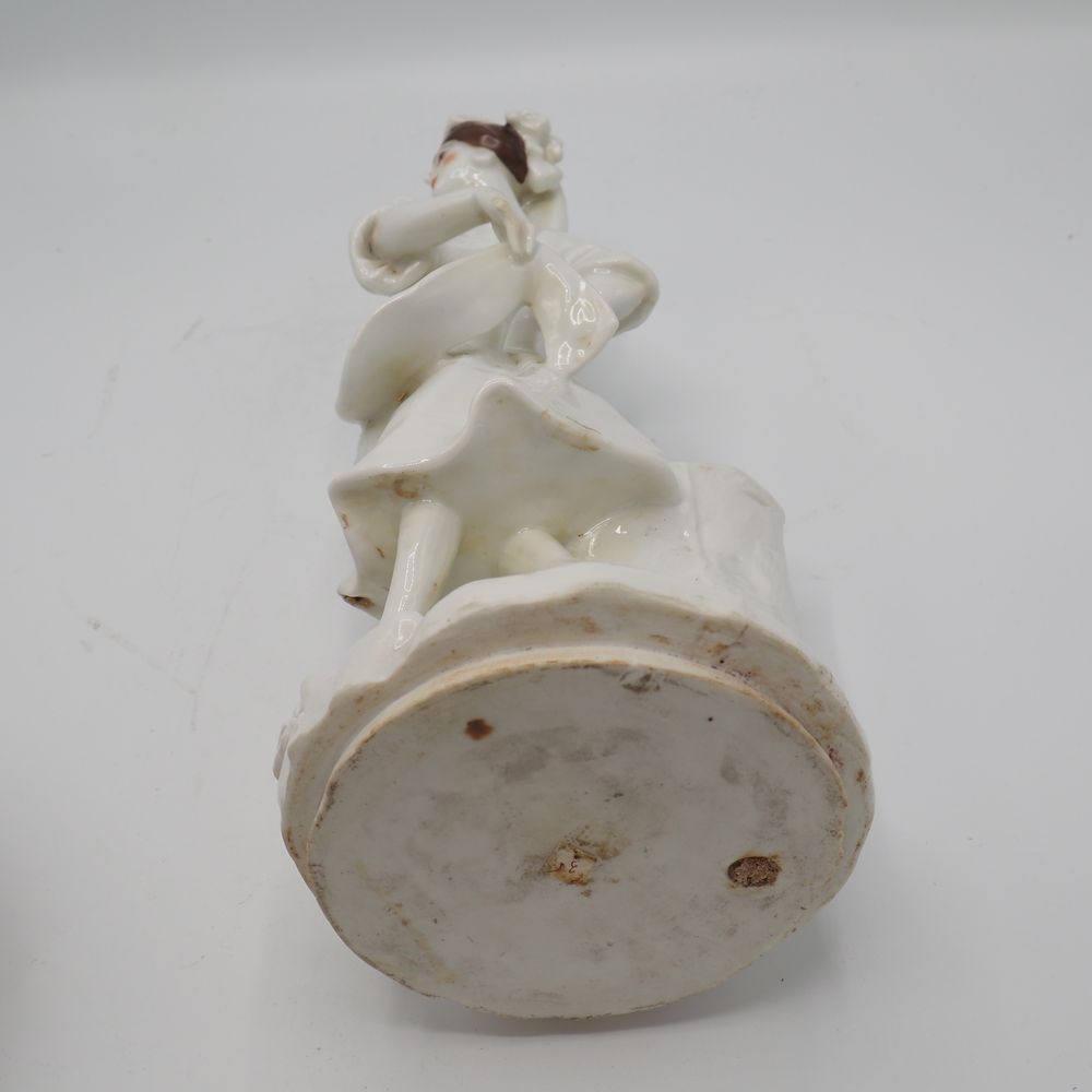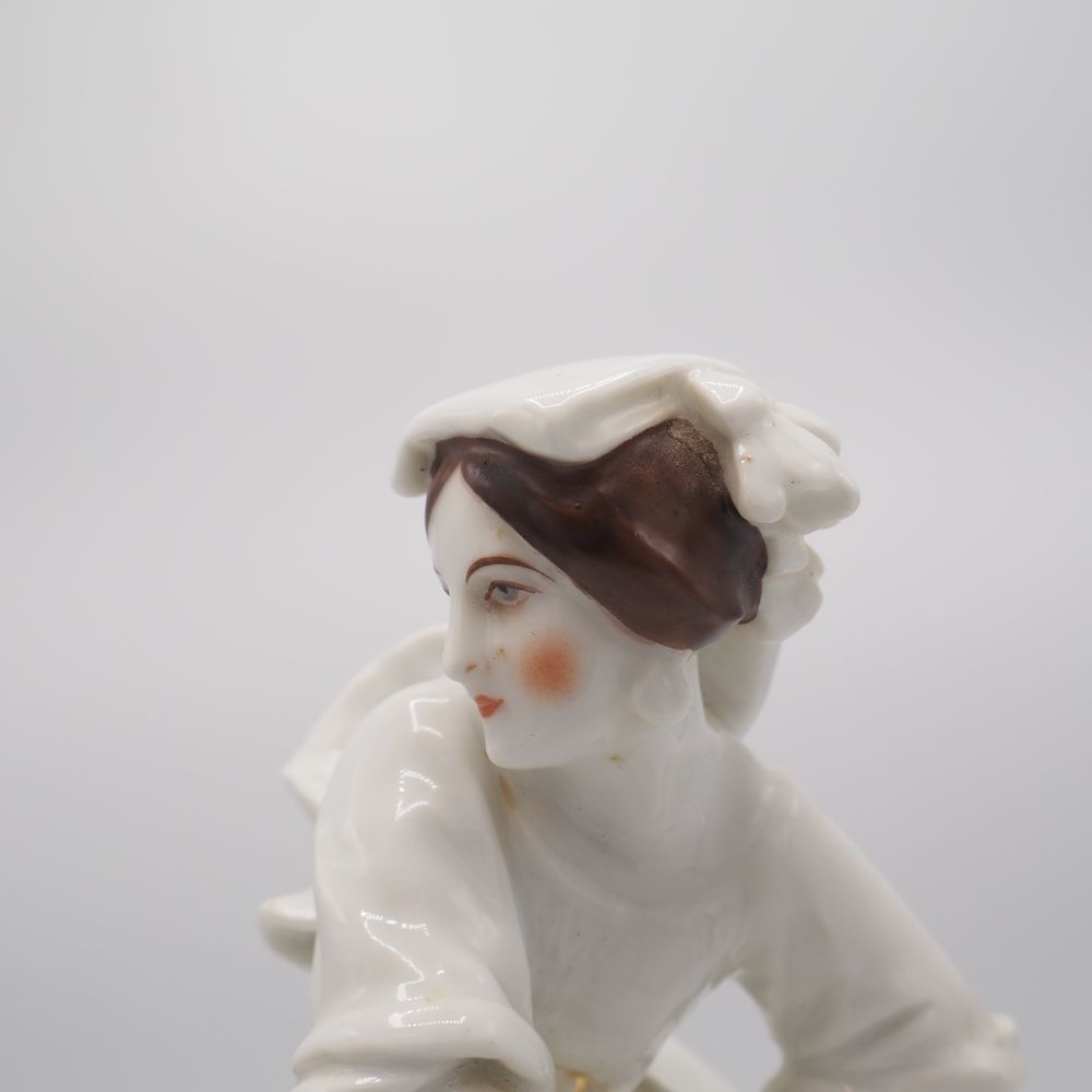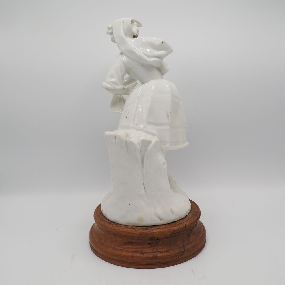 Vieille Andenne : Statuette fin 19eS, porcelaine émaillée, figurant une jeune dame, sur scole de bois, H totale: 34, diam socle: 18 cm