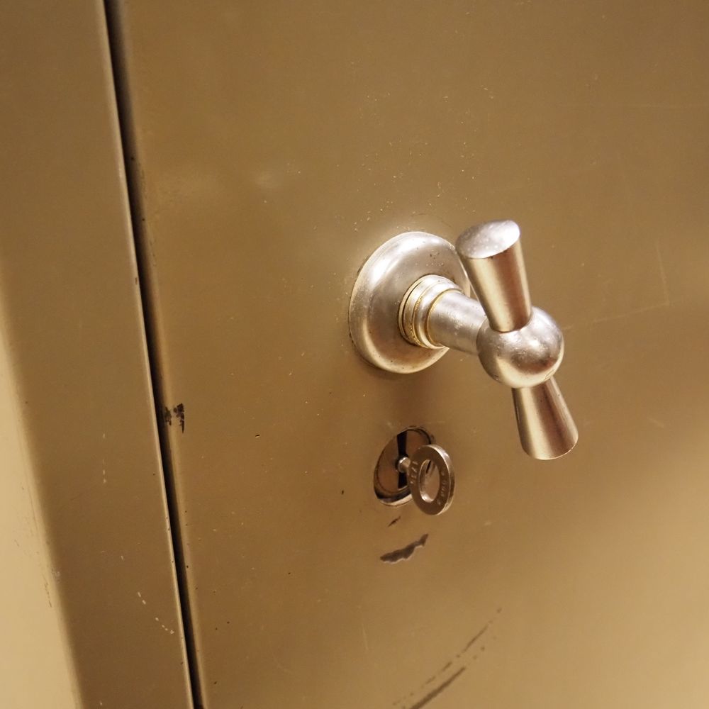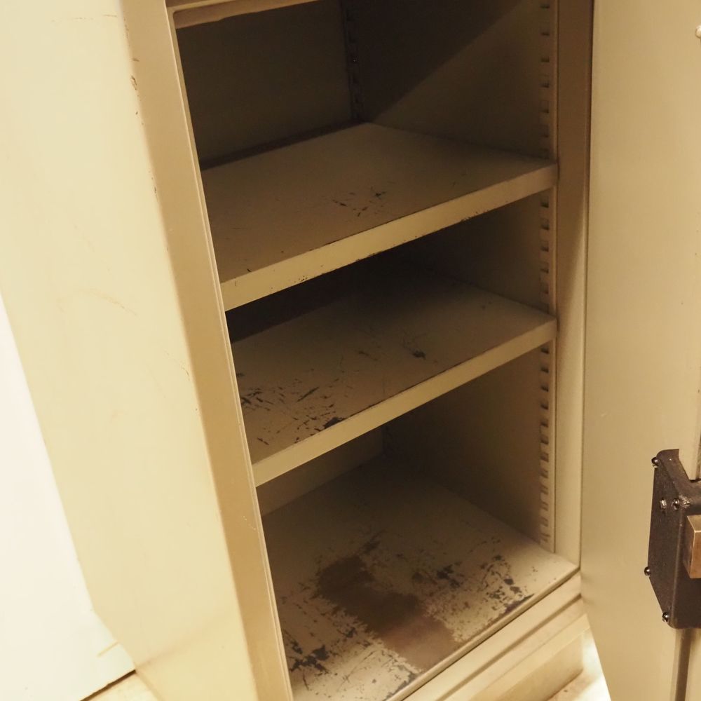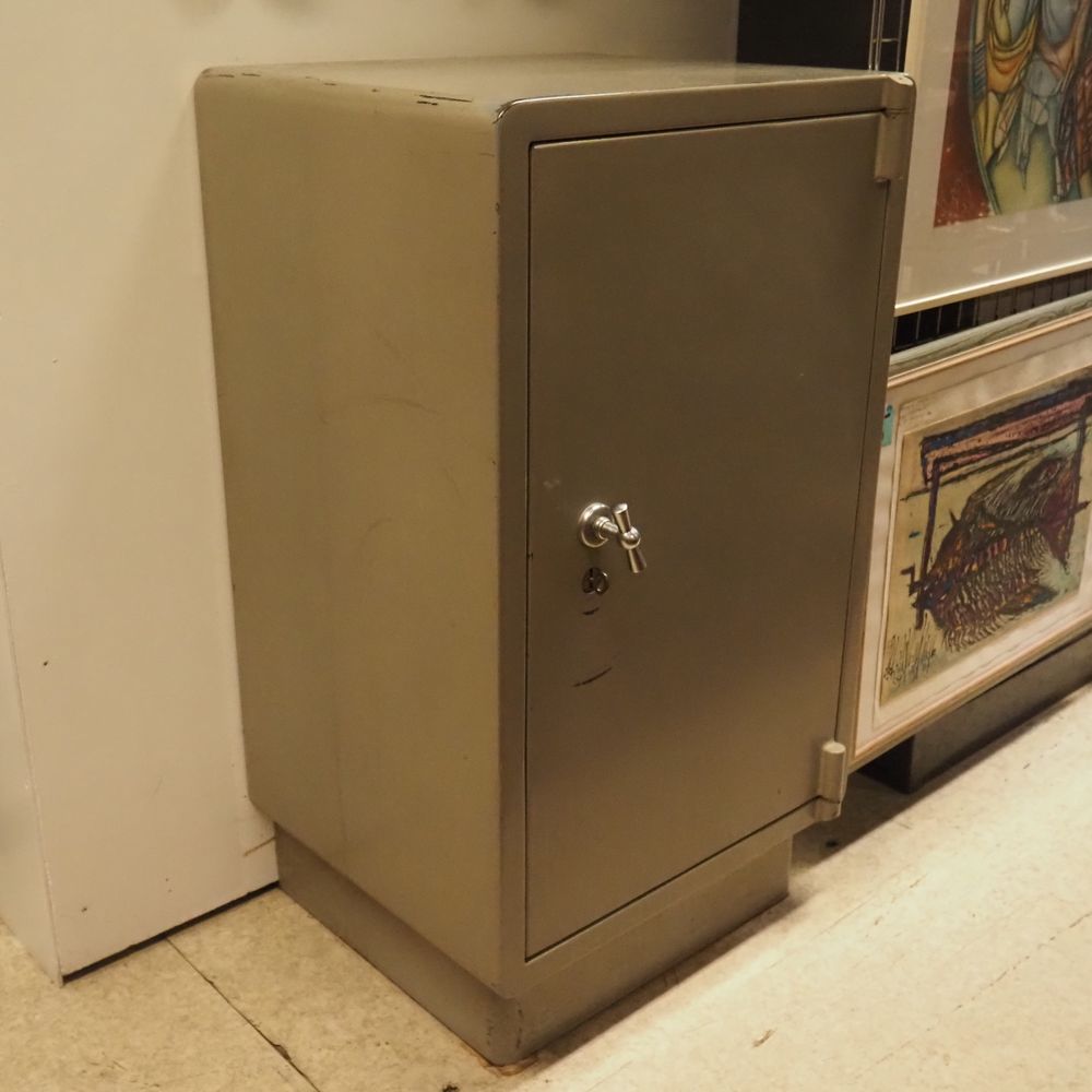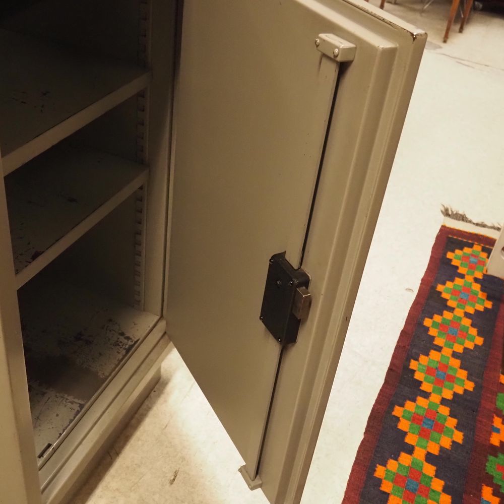 Coffre fort/Chambre forte vers 1970 : Tole laqué gris clair, intérieur 2 plateaux, avec 2 clés, poids entre 75-100 kg, dimension exterieur H: 115, L: 65, P: 55 cm, dim interieur: H: 85, L: 50, P: 42 cm