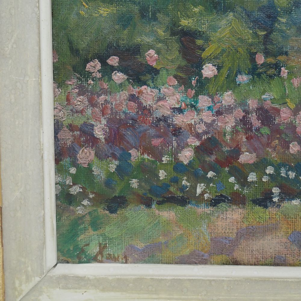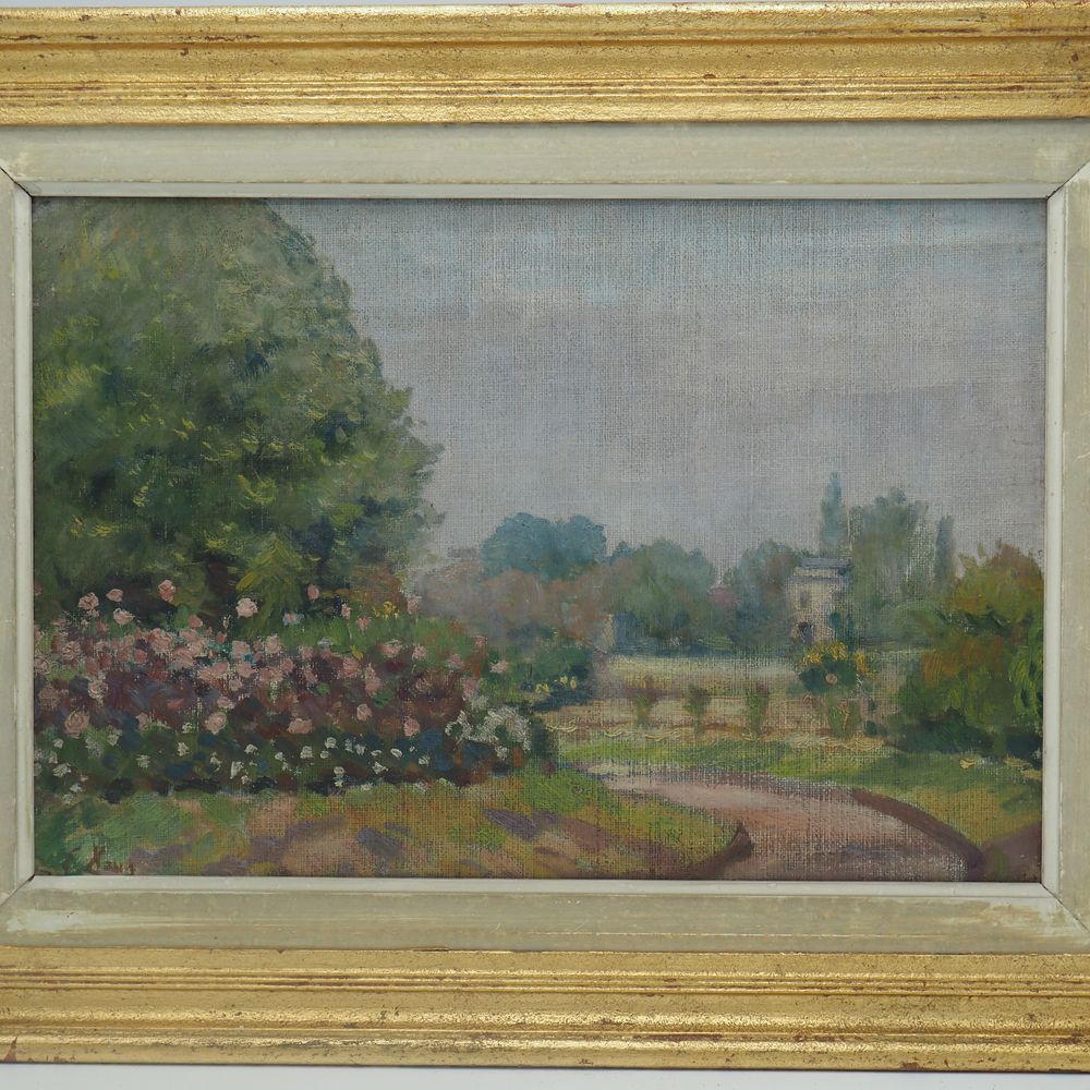 Emile Claus (1849-1924) attribué : Huile sur toile, jardin en fleurs, signée en bas à gauche, dim: 26 x 37 cm