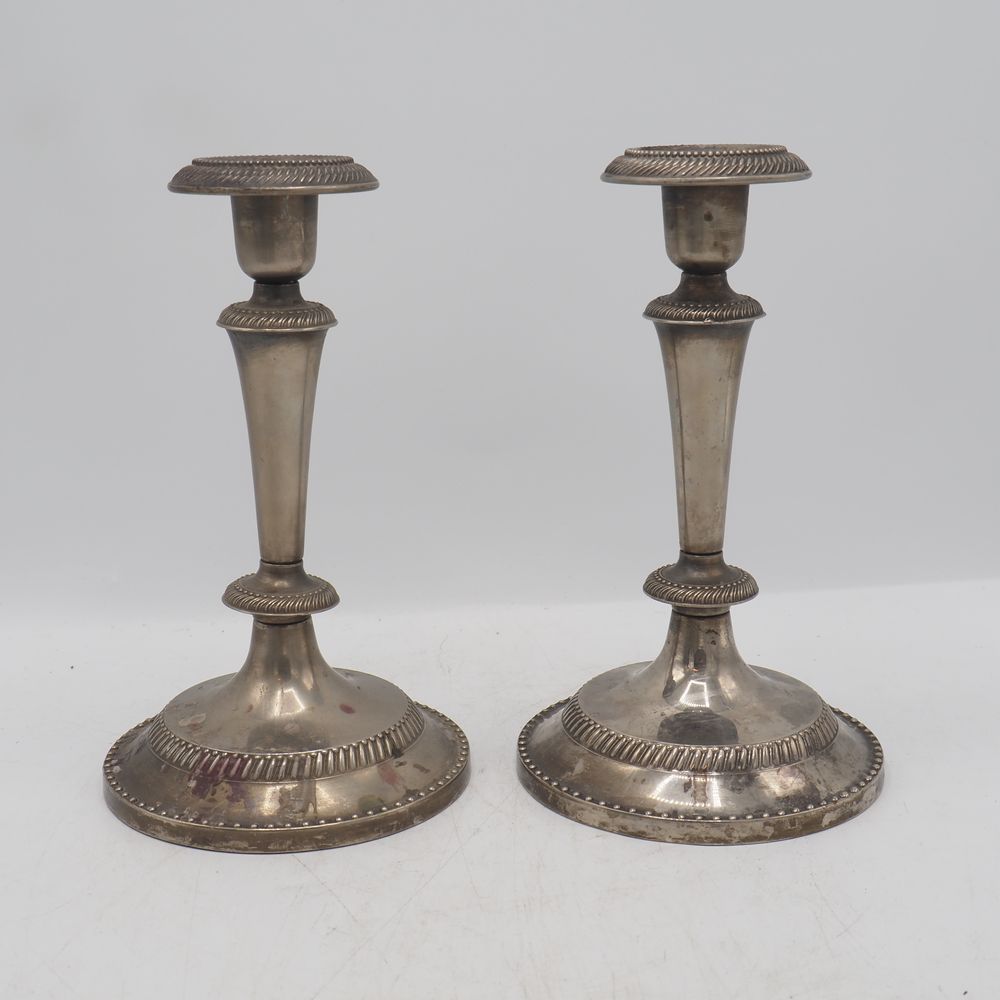 Paire de bougeoirs 19eS : Métal blanc, H: 19, diam: 11,3 cm
