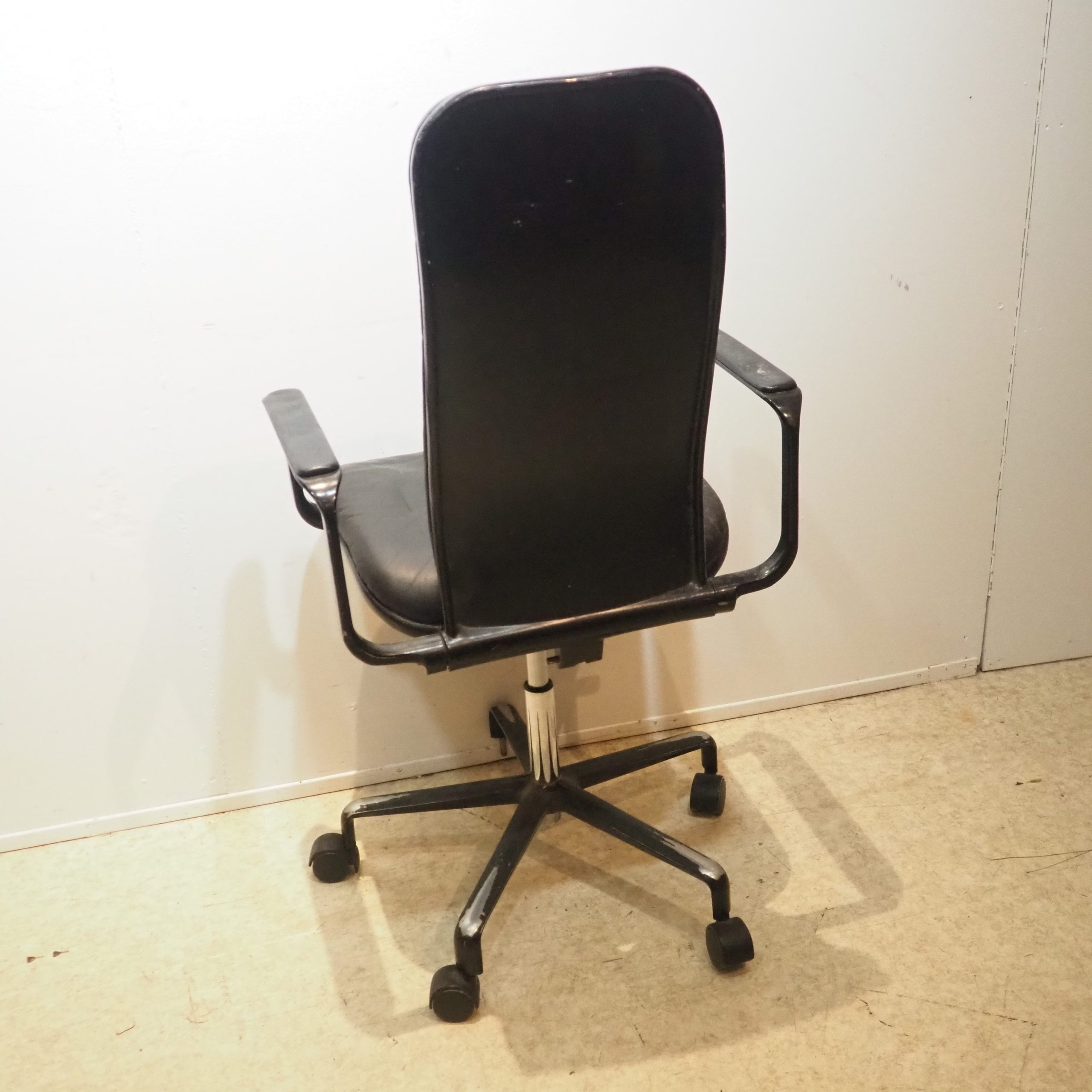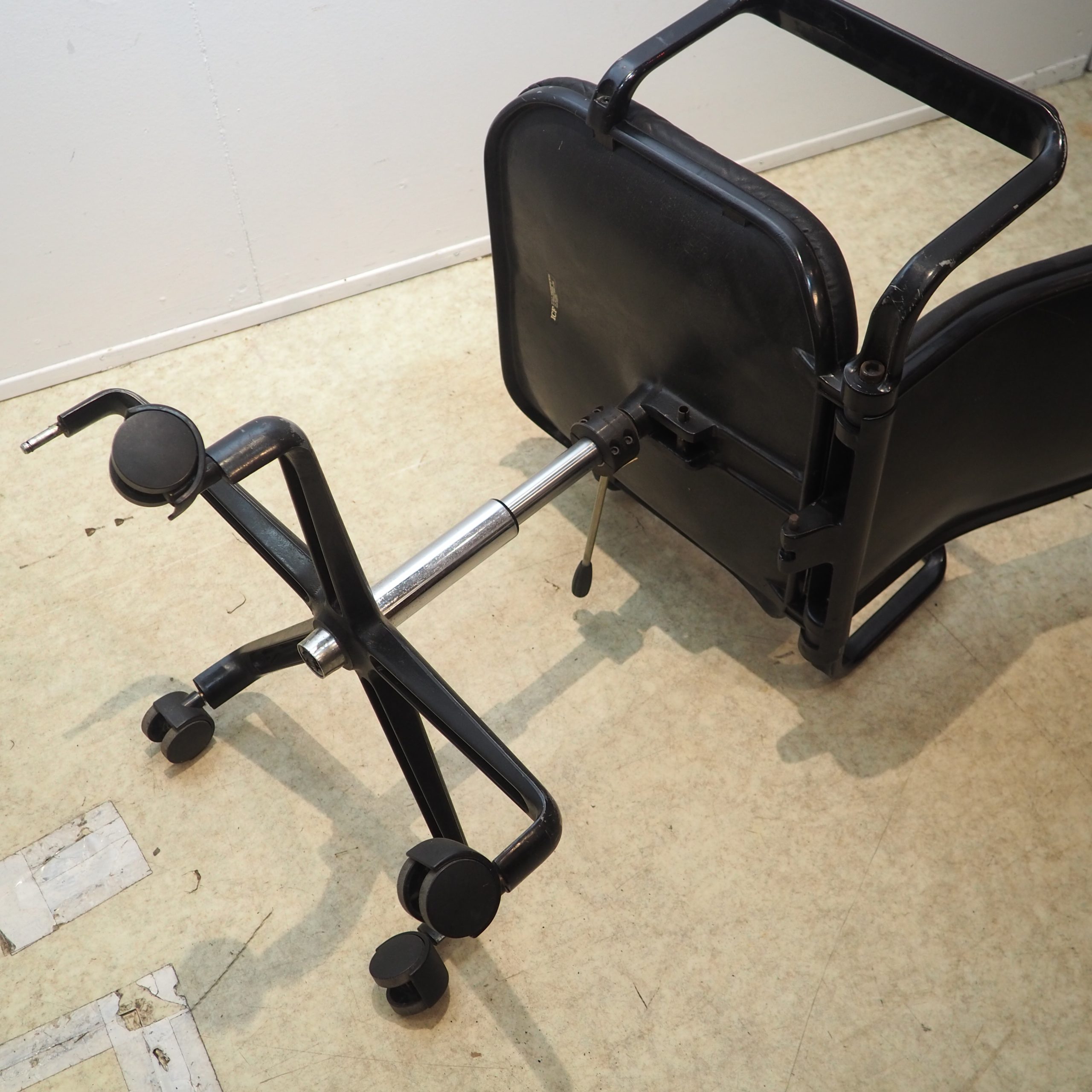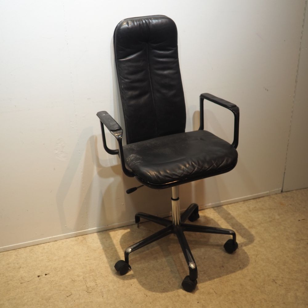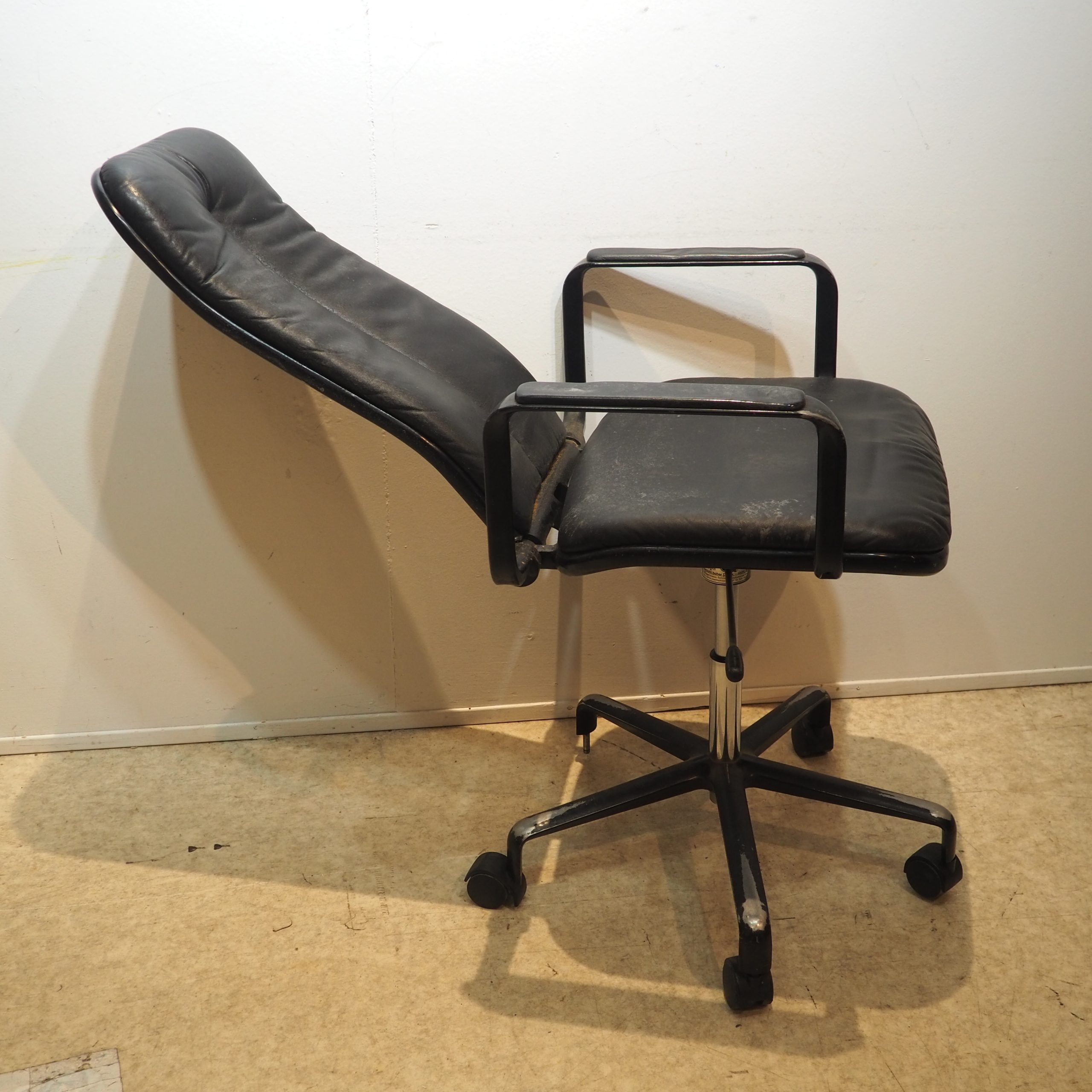 Fred Scott : Fauteuil de bureau, assise et dossier, cuir noir (à restaurer, manque une roulette + verin)