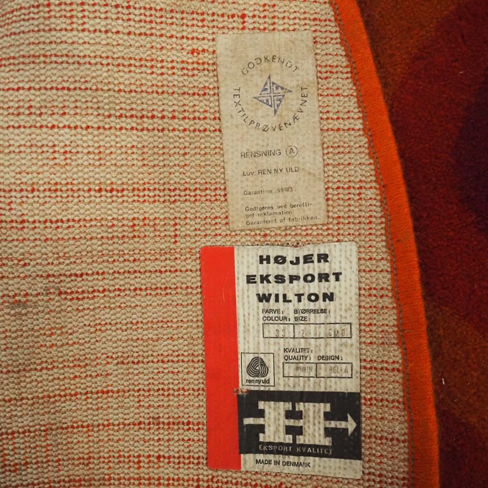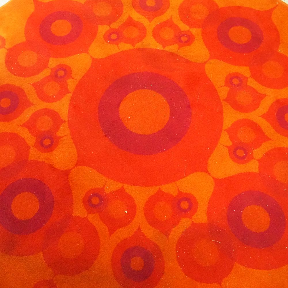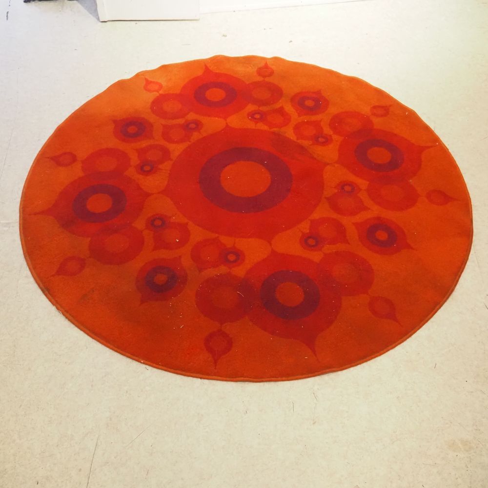 Tapis circulaire vers 1970, motif psychédélique sur fond orange, diam : 200 cm