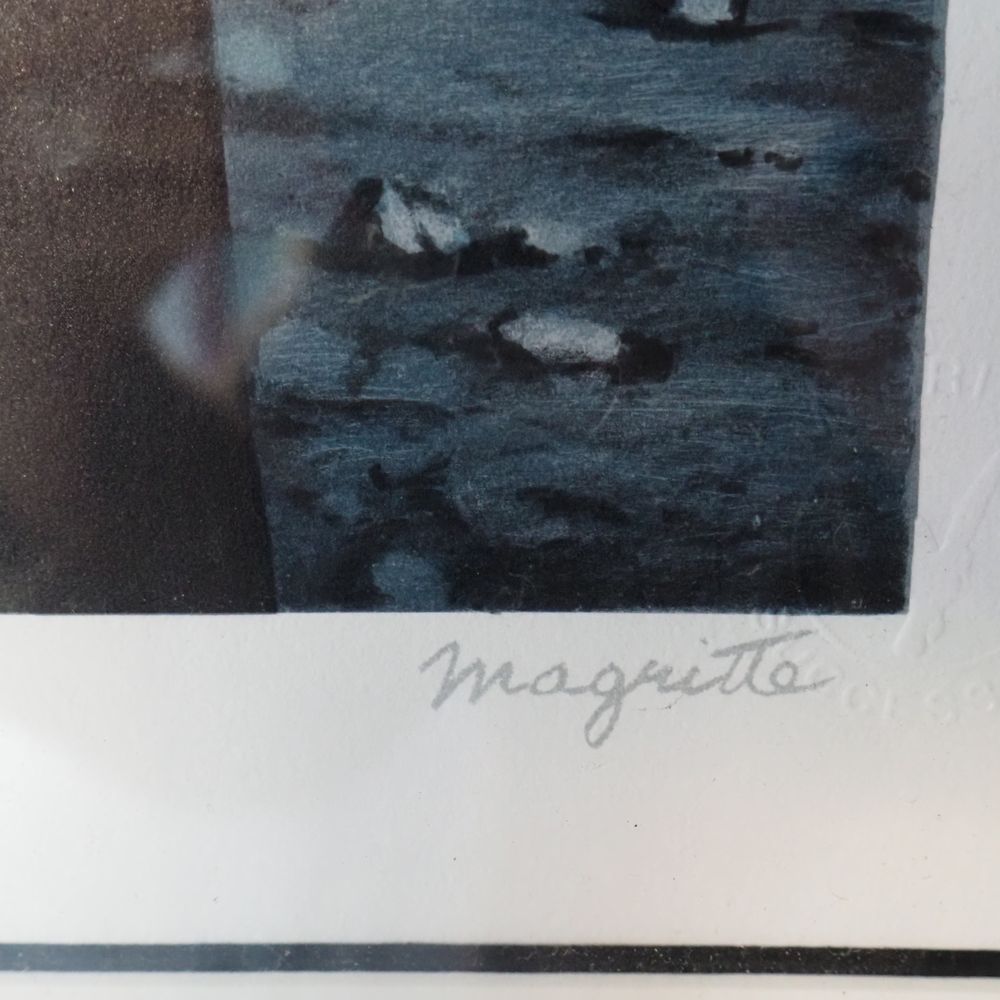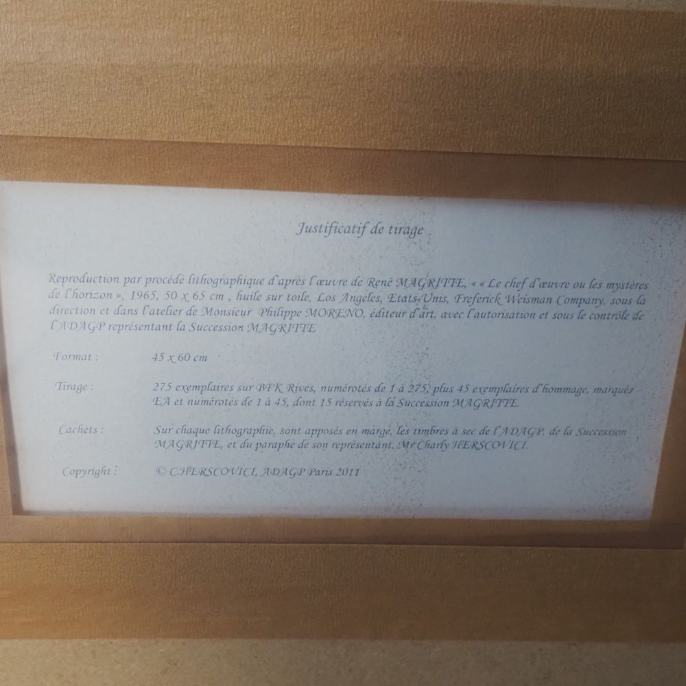 René Magritte d’après : Reproduction par procédé lithographique, « le chef d’œuvre ou le mystèresde l’horizon », justificatif de tirage au dos, datée 2011, signature imprimée et numérotée 132/275, encadrée sous verre, dim: 50 x 65 cm